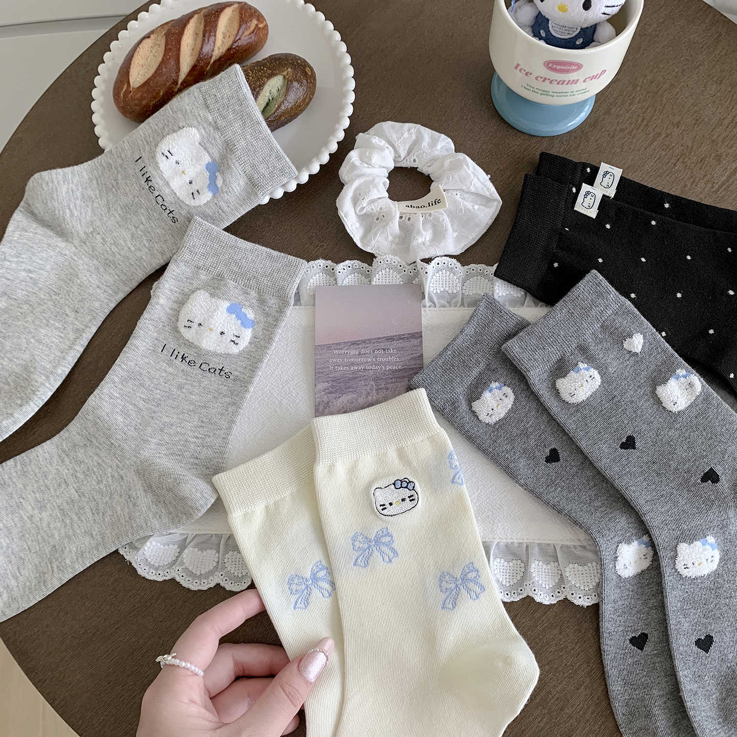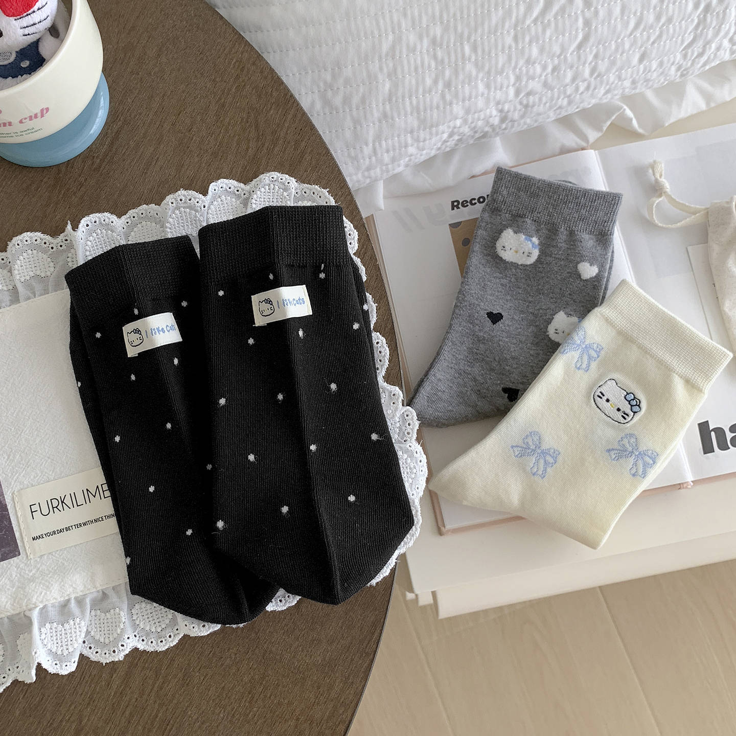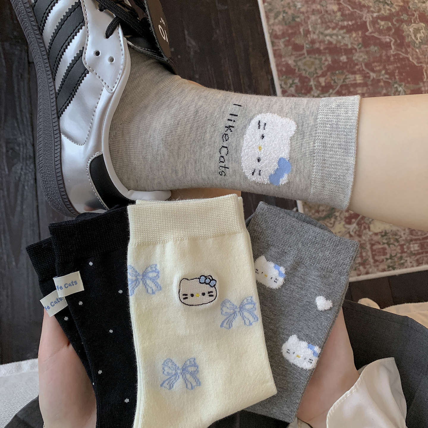 4双一组!春夏季可爱kt猫咪中筒棉质女袜韩版少女风百搭纯色长袜
