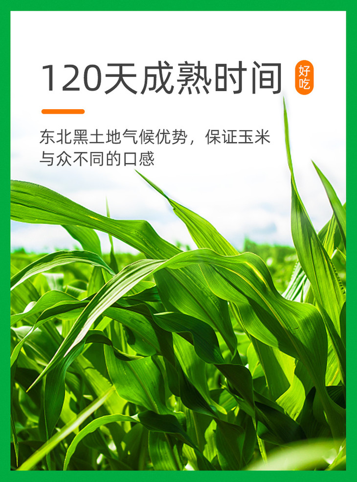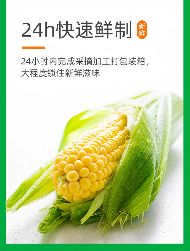等玉米成熟后分期采收,确保在48小时内采收完成。因为保鲜时效非常有限,要是过夜了,鲜甜味和糯劲会严重缩水,所以为保新鲜,从采摘到加工成真空包装,4小时内完成鲜制。玉米新鲜度可达90%以上,营养成分有很大程度的保留,同时保证了令人惊艳的好口感,3分甜7分糯,胚芽香软微粘,有着新鲜的天然甘甜!