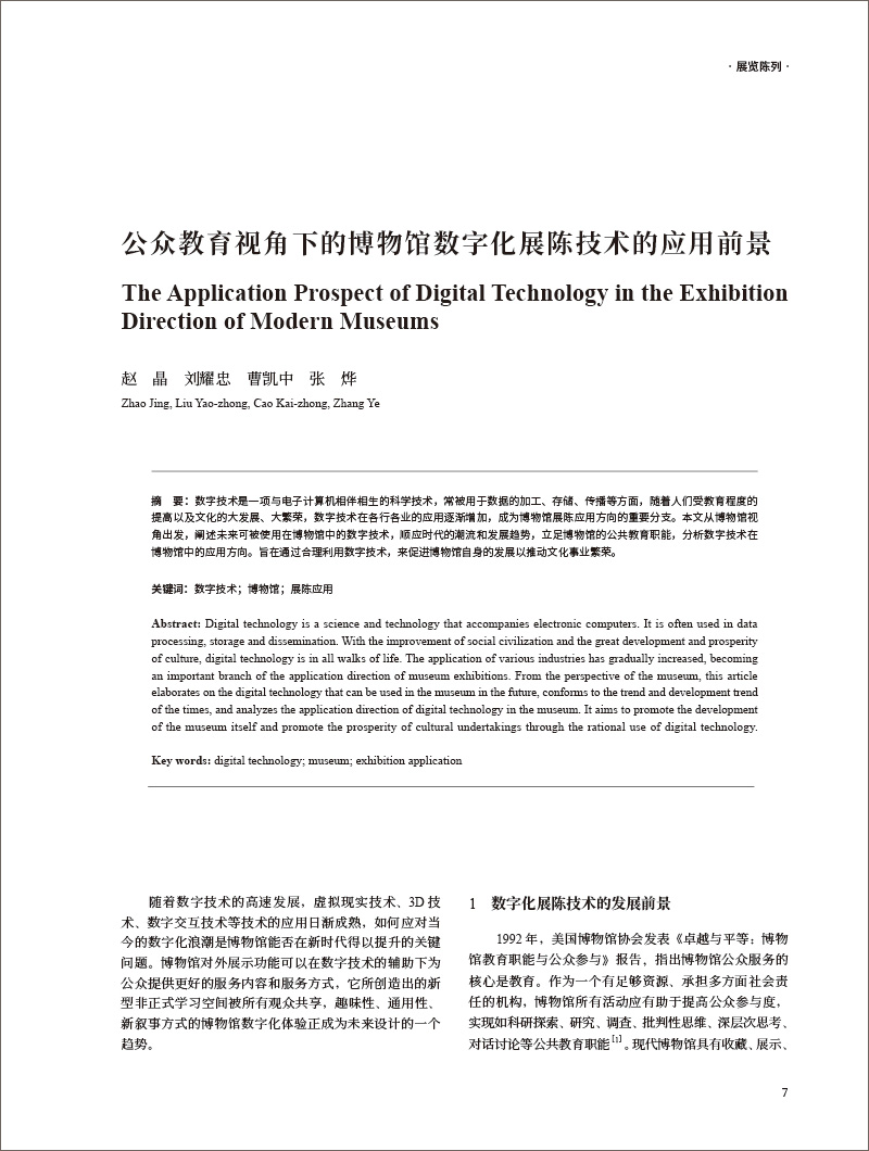 公众教育视角下的博物馆数字化展陈技术的应用前景 / 赵晶 刘耀忠 曹凯中 张烨