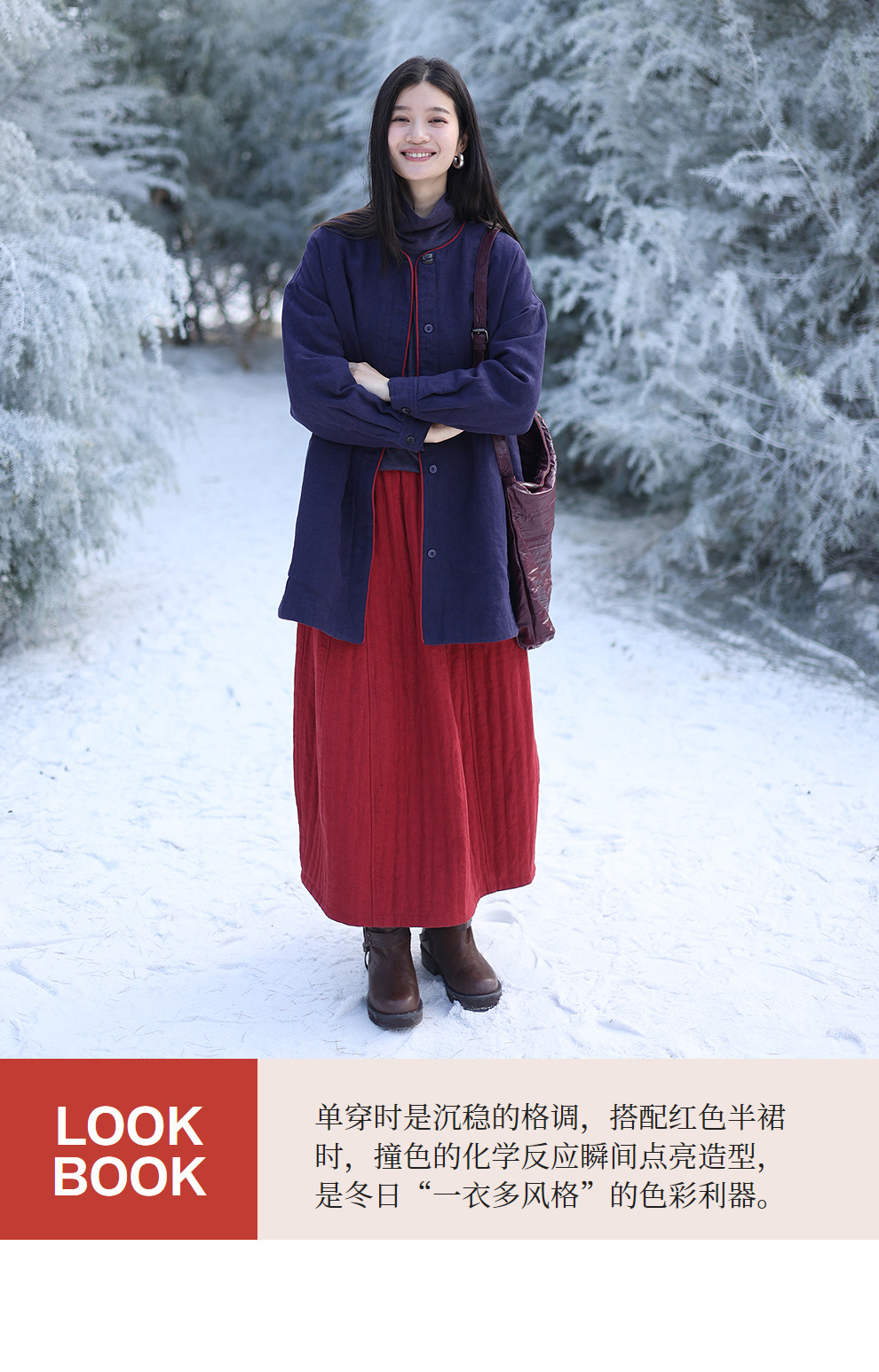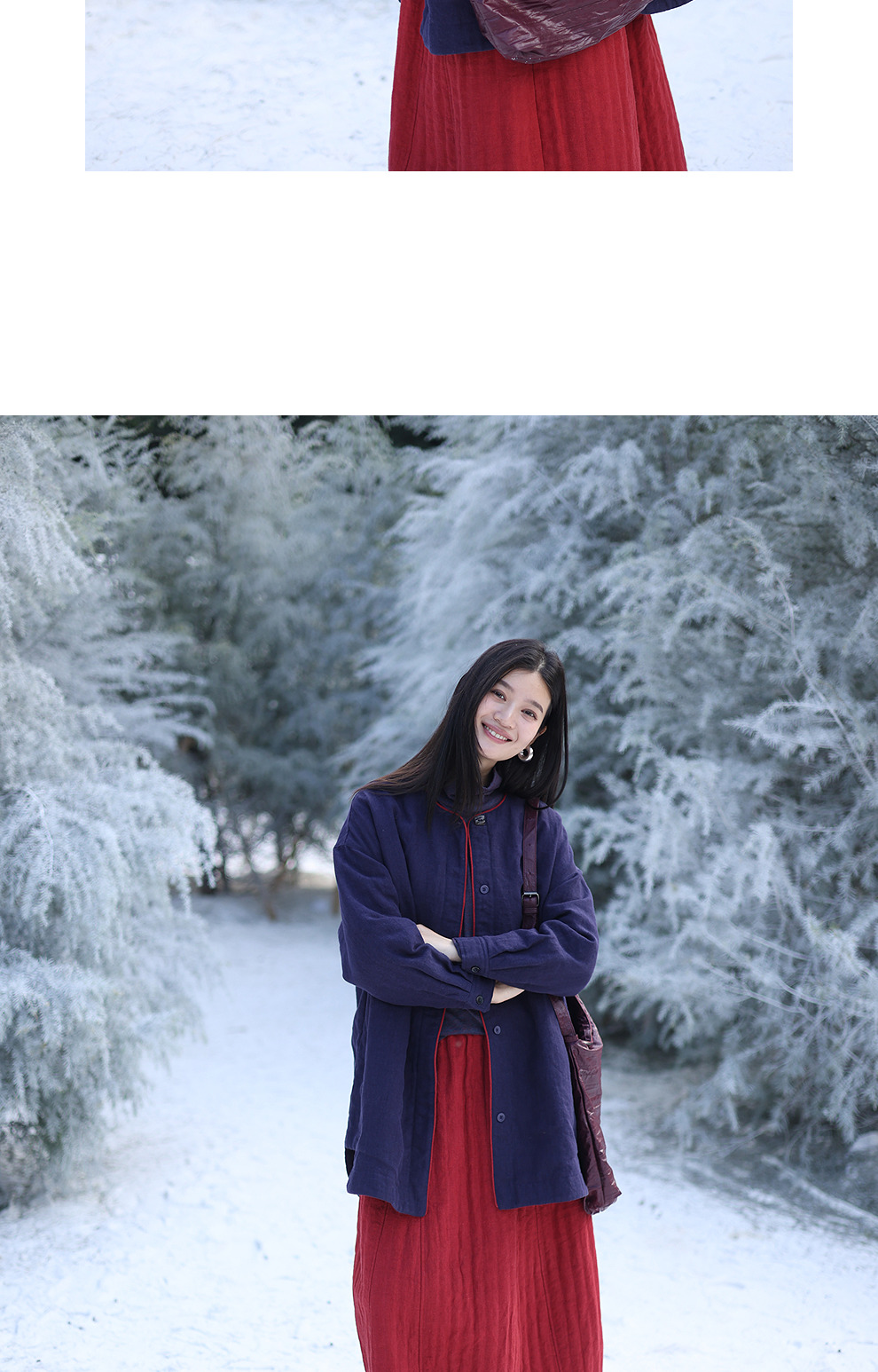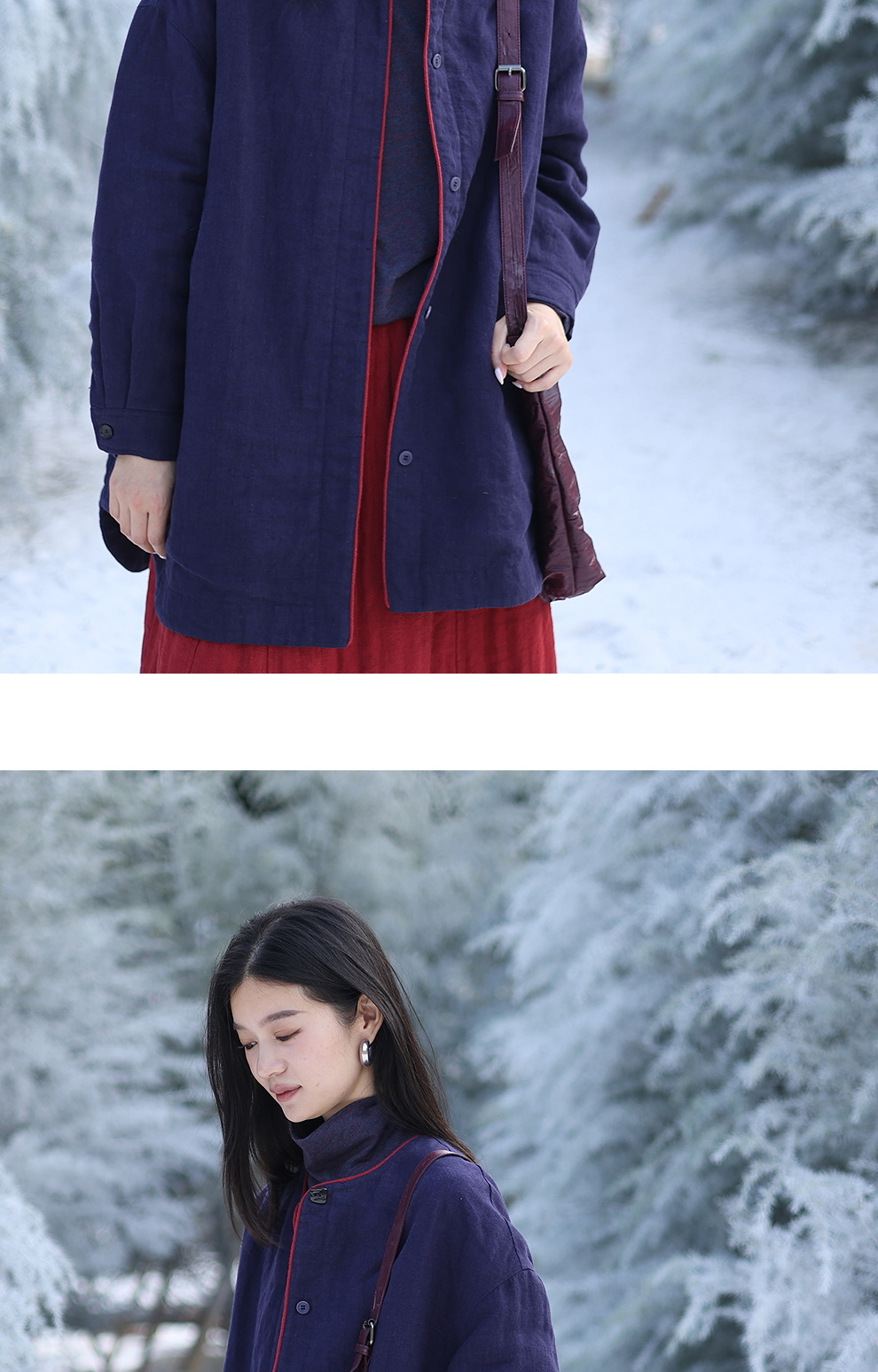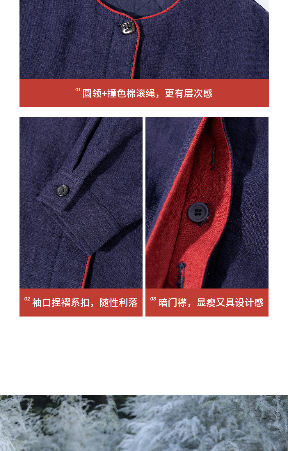 绽放727朵/加厚亚麻绗棉落肩长袖开襟中长款棉服冬新中式棉衣外套