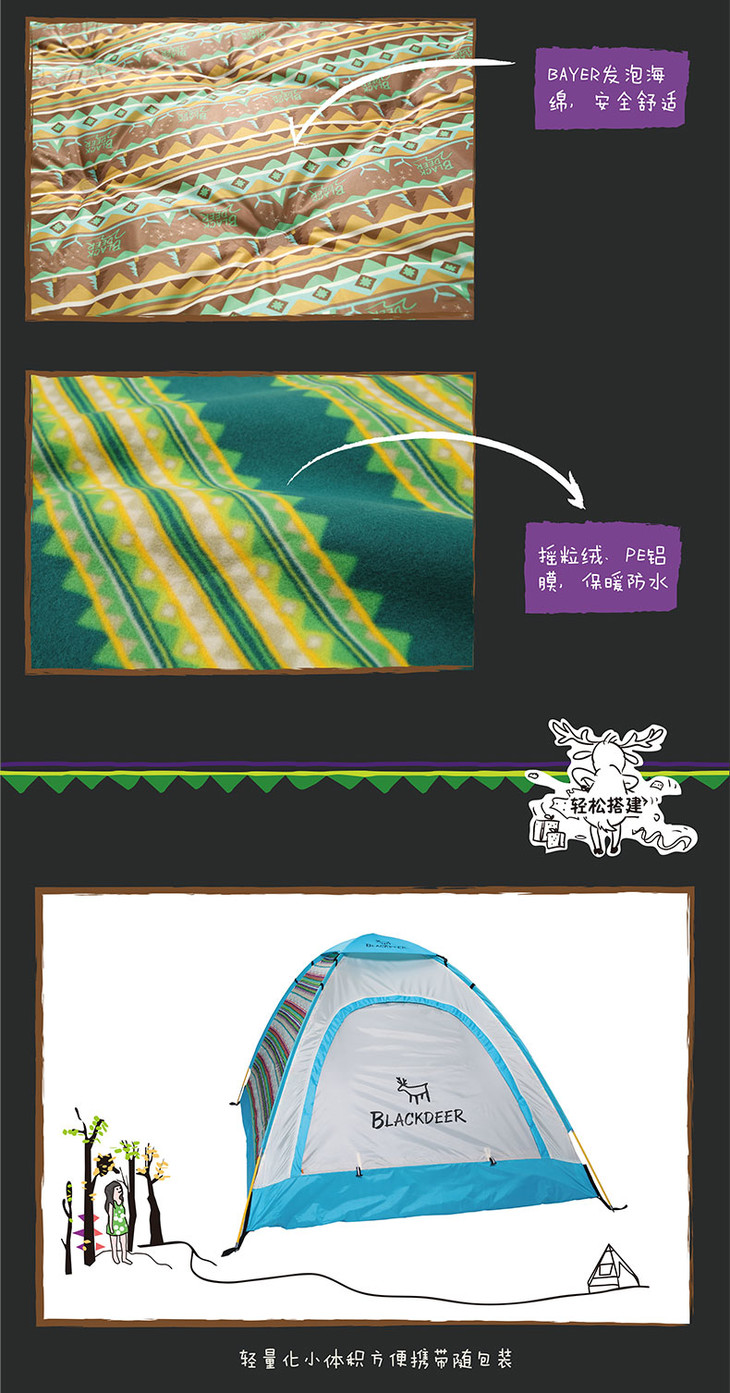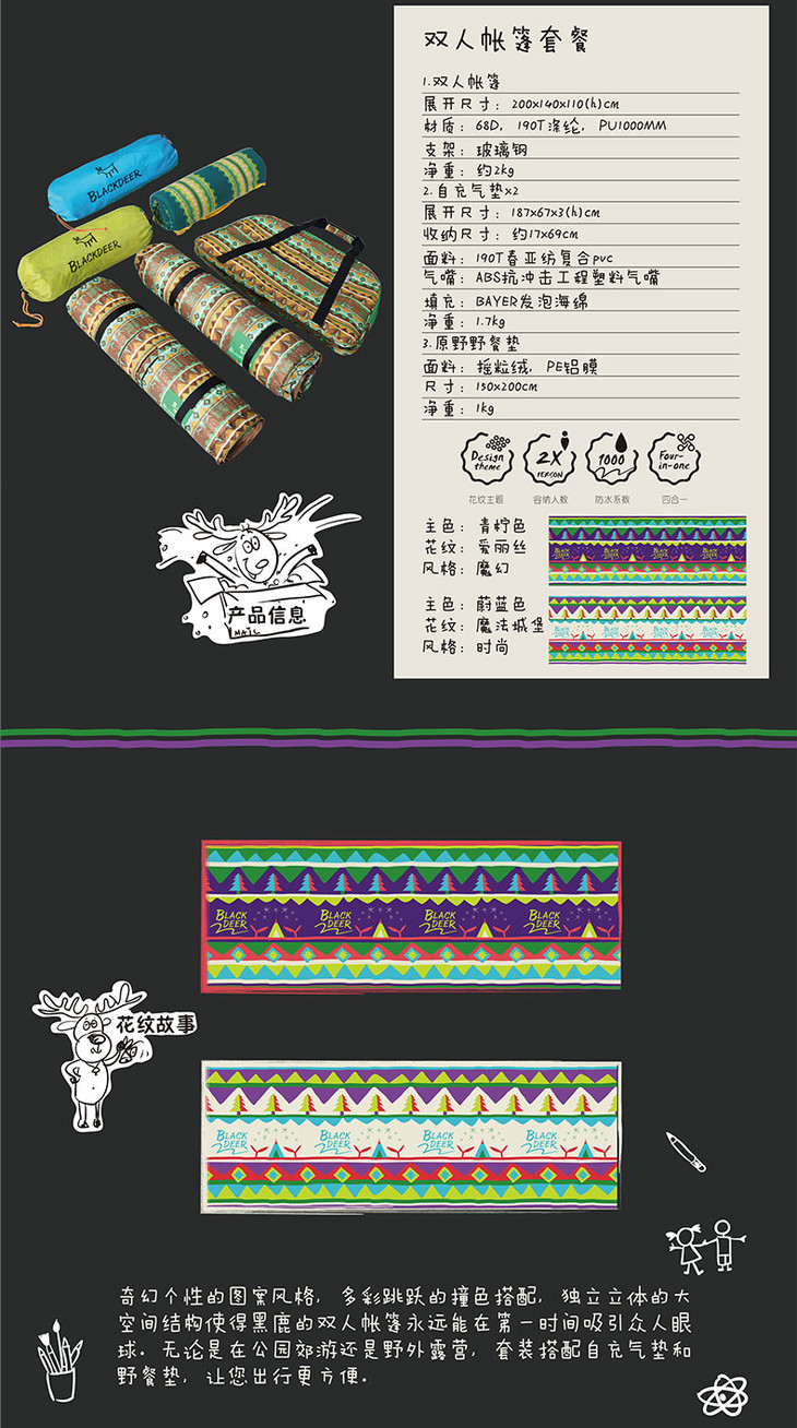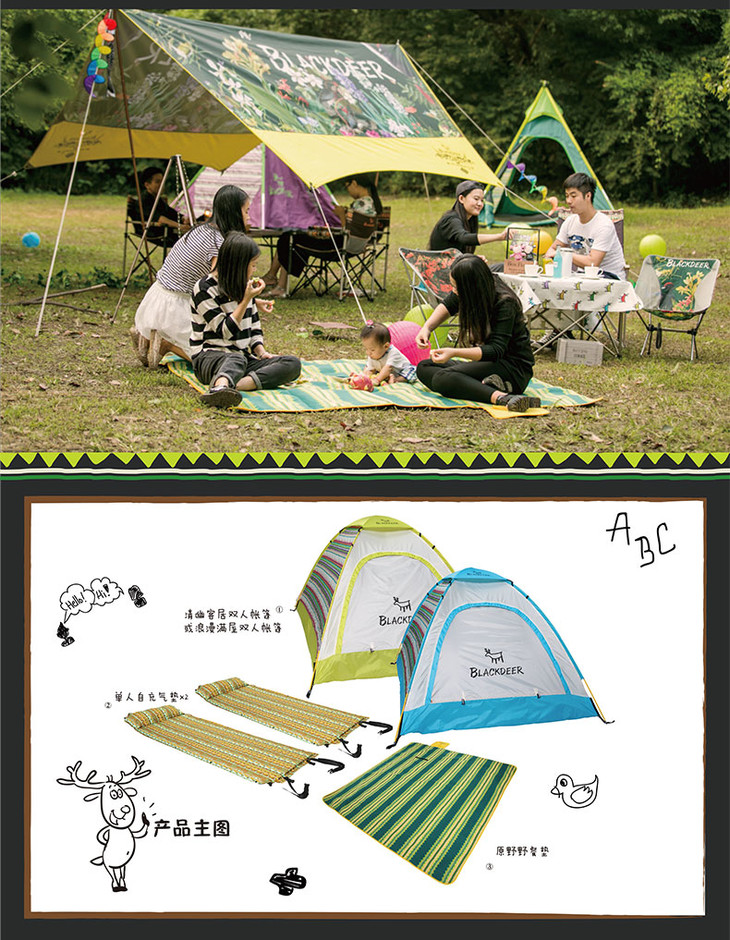 内含:一个双人帐篷+两个单人自充气垫+1个原野野餐垫