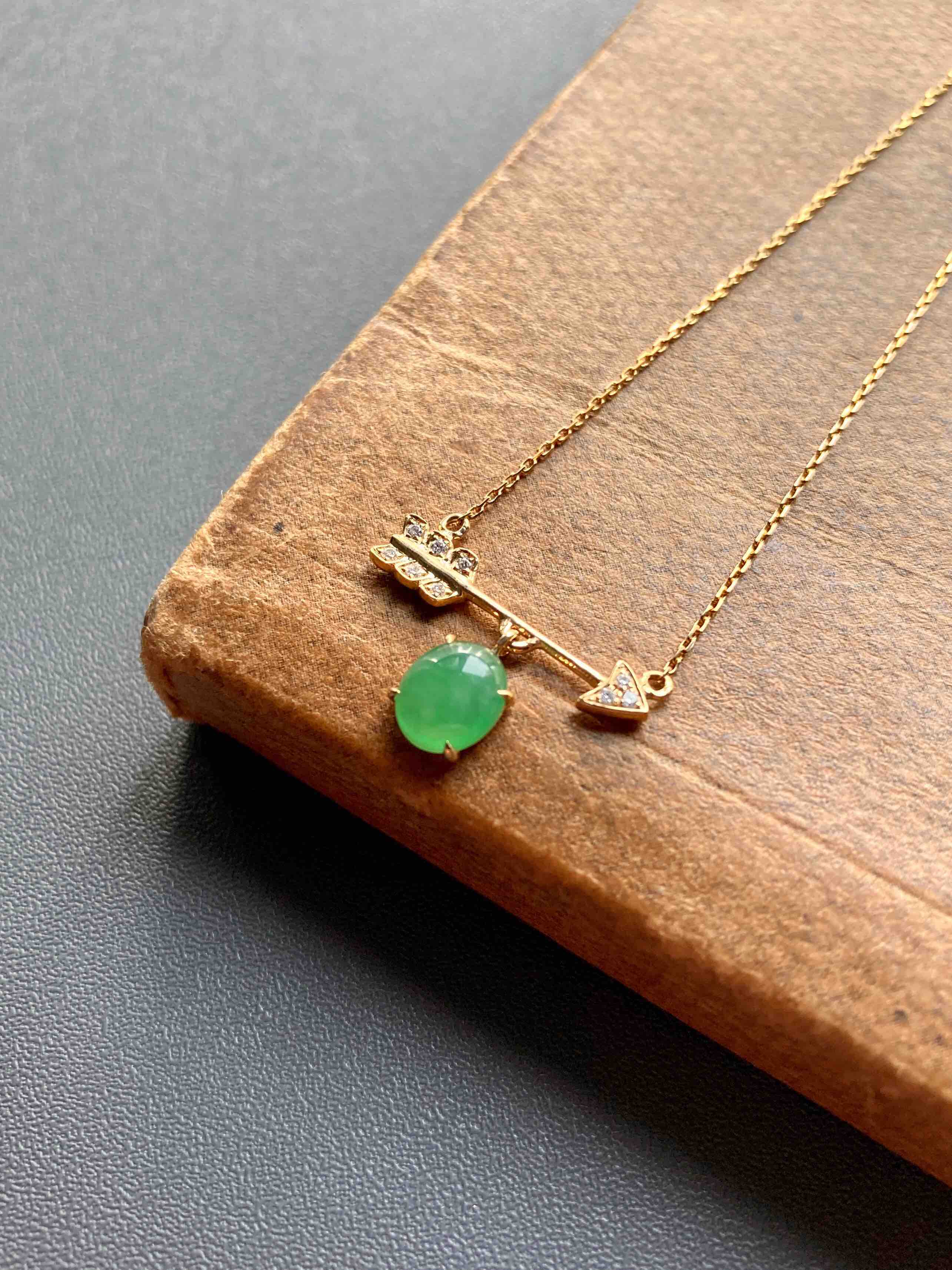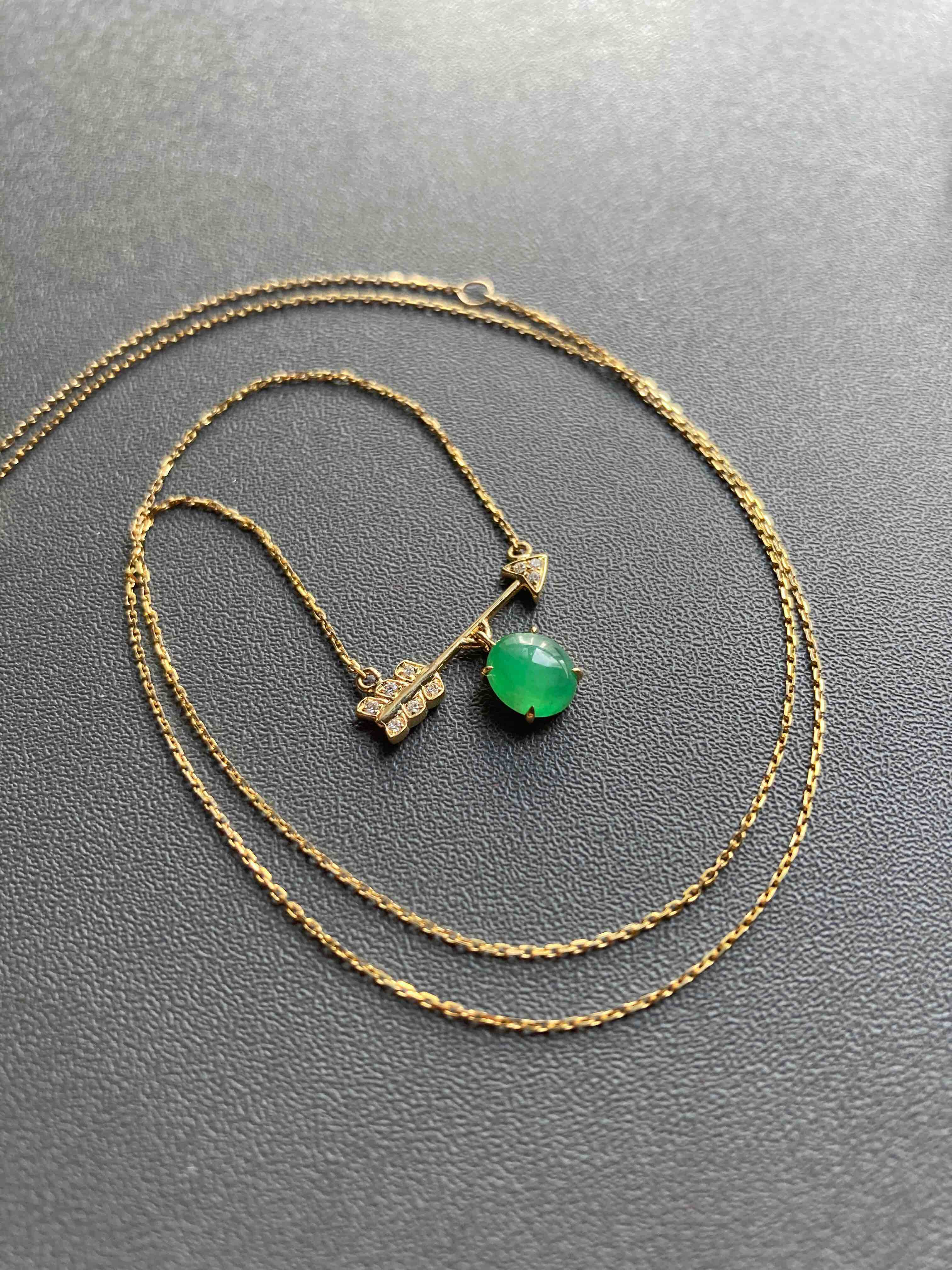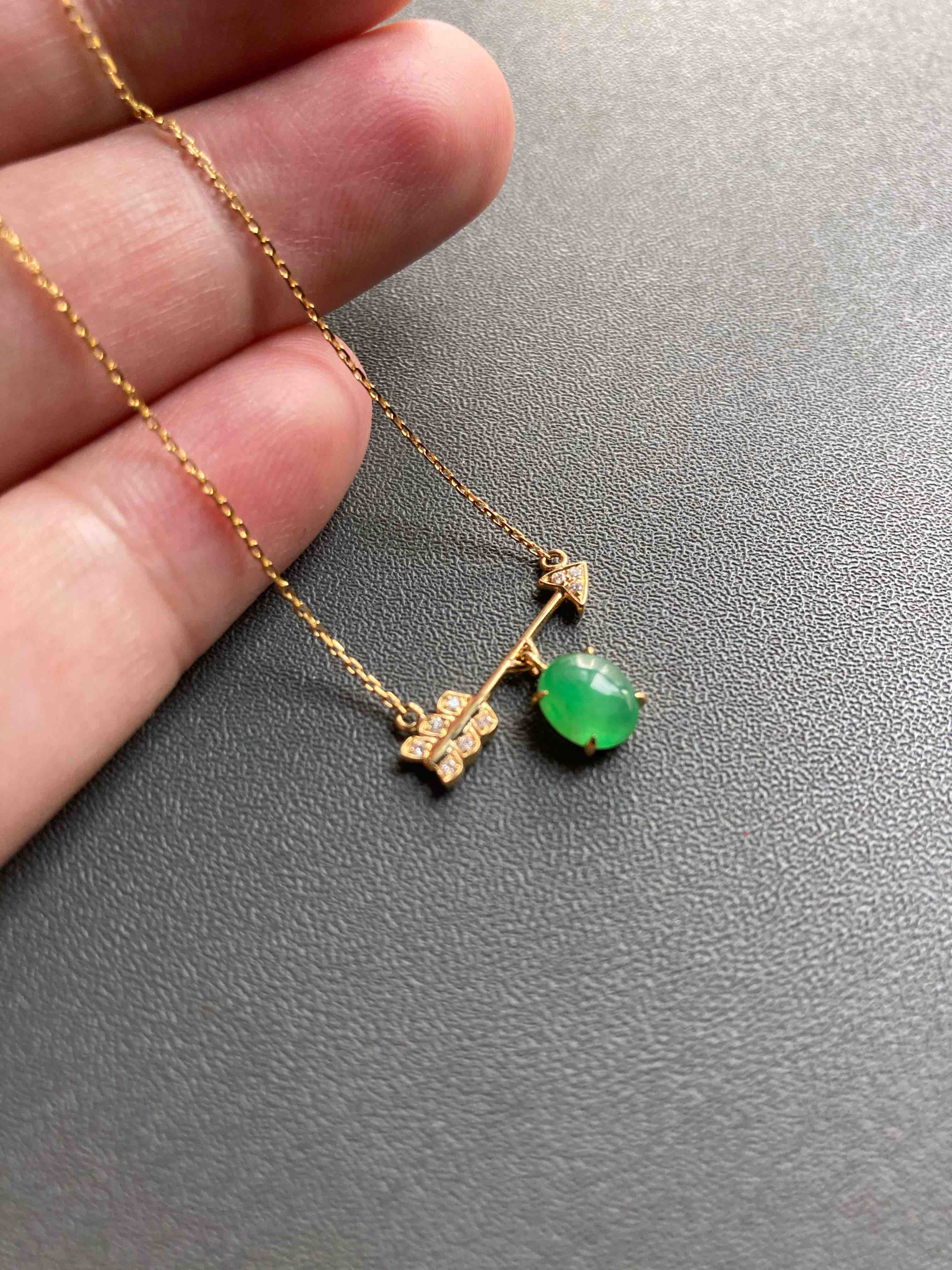 萌萌的阳绿翡翠蛋面锁骨链,缅甸料,蛋面品质特别好,种水晶莹剔透,阳绿艳丽,一支丘比特爱神之箭,设计风格时尚简约,翡翠禄来原创设计系列,只要小四价位你就可以拥有一件设计师作品,还是冰种阳绿翡翠蛋面打造,全18k金钻石镶嵌,实在太划算啦。蛋面6.5×5.8×3mm,链长40cm加5cm延长链