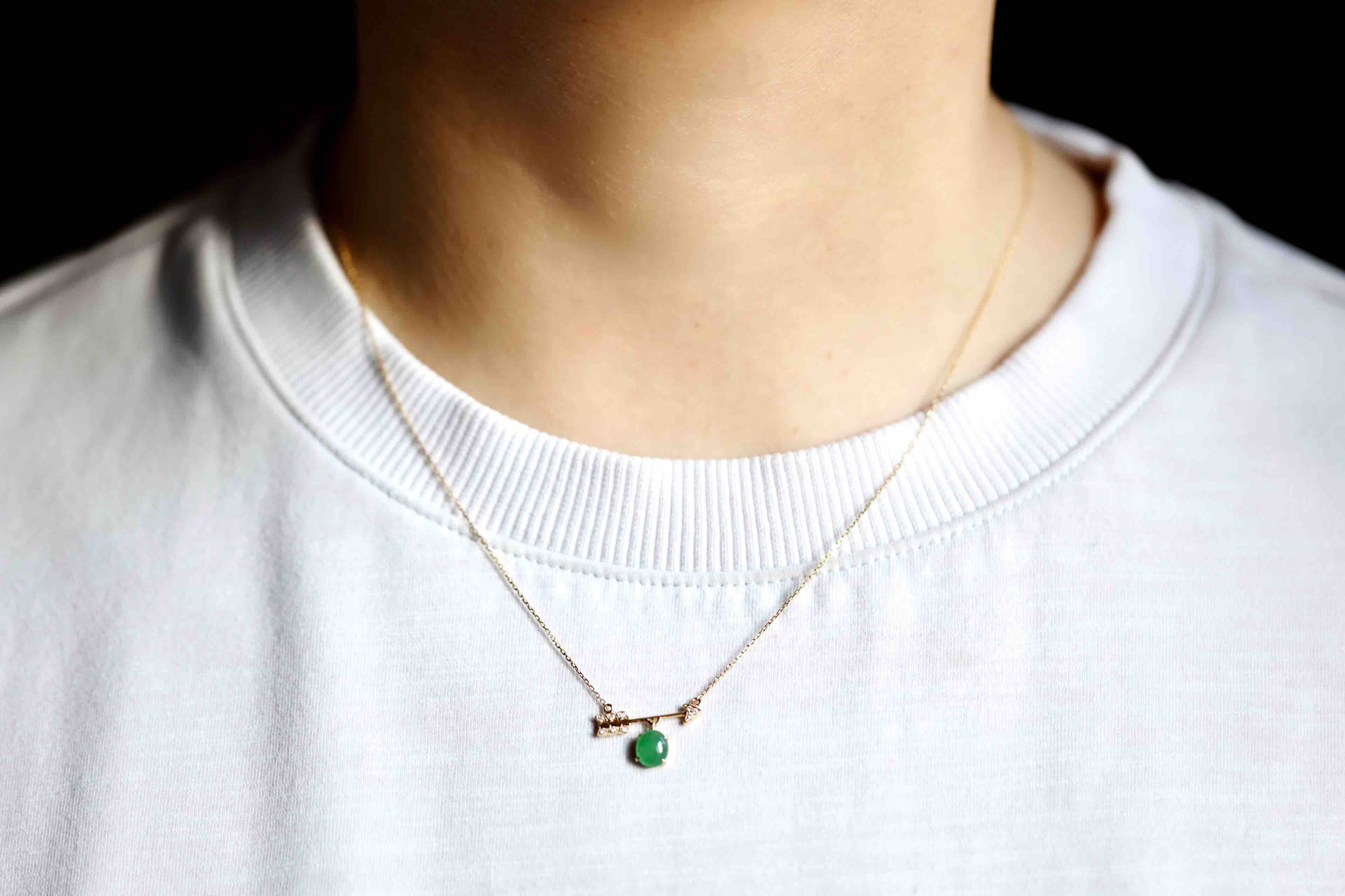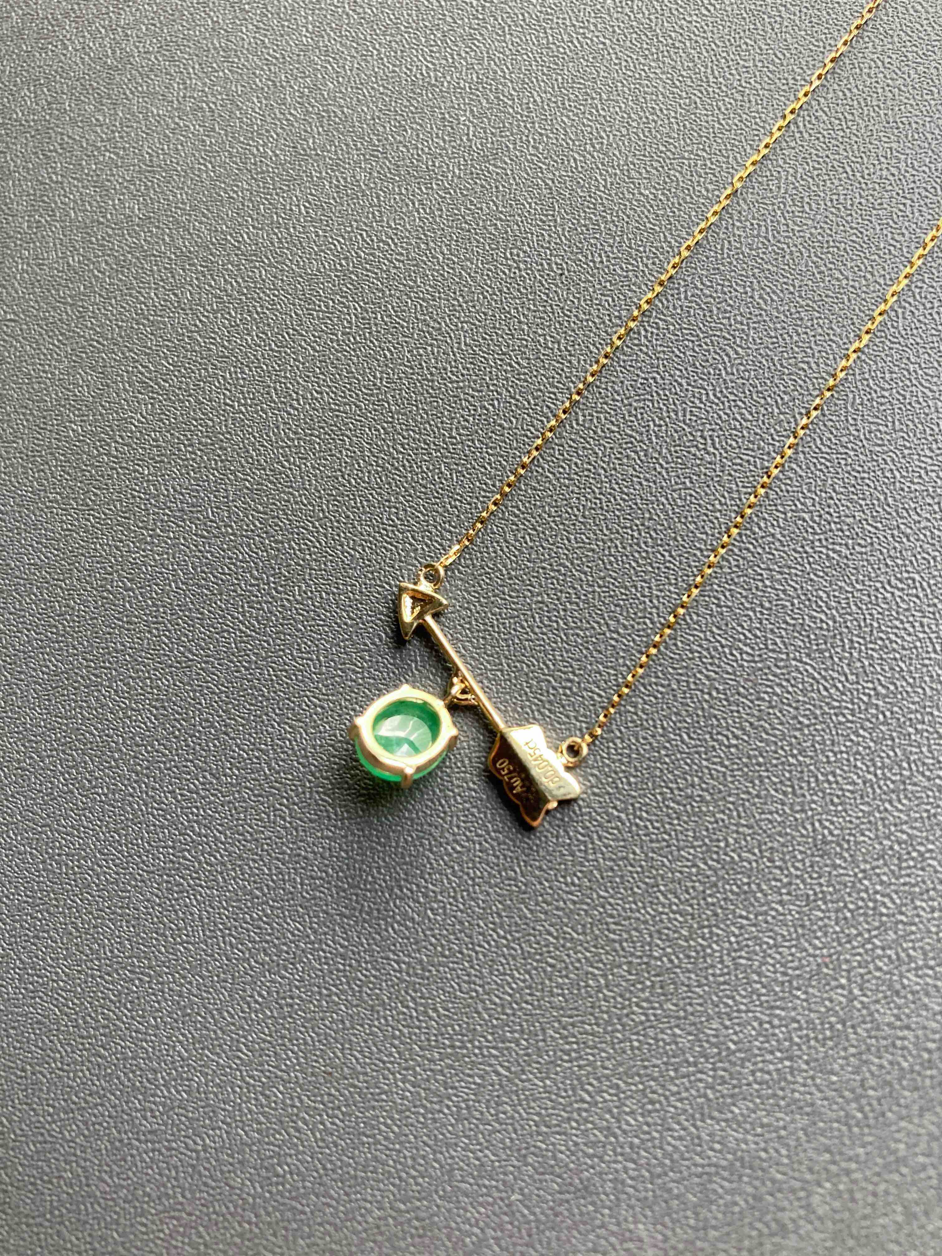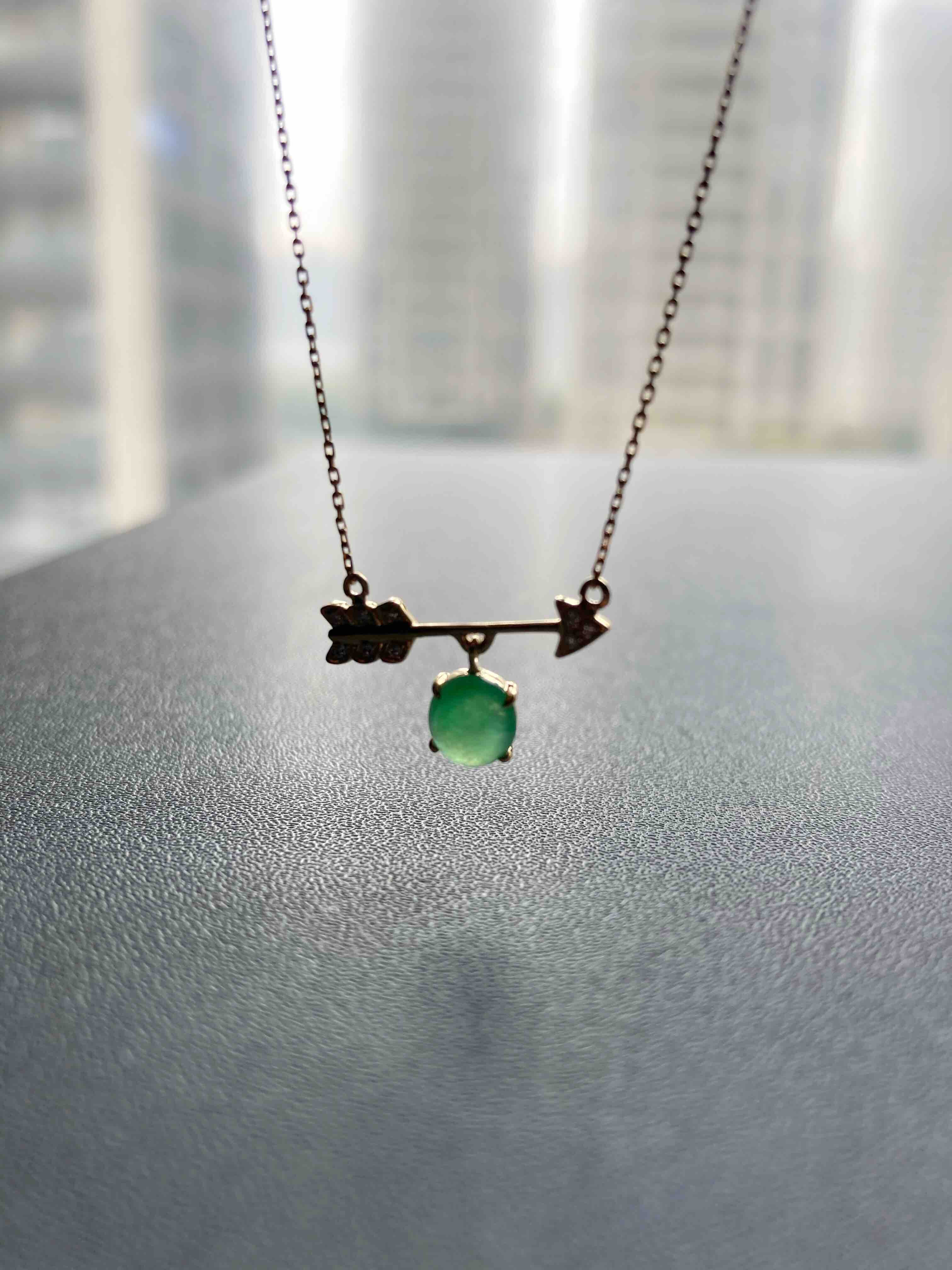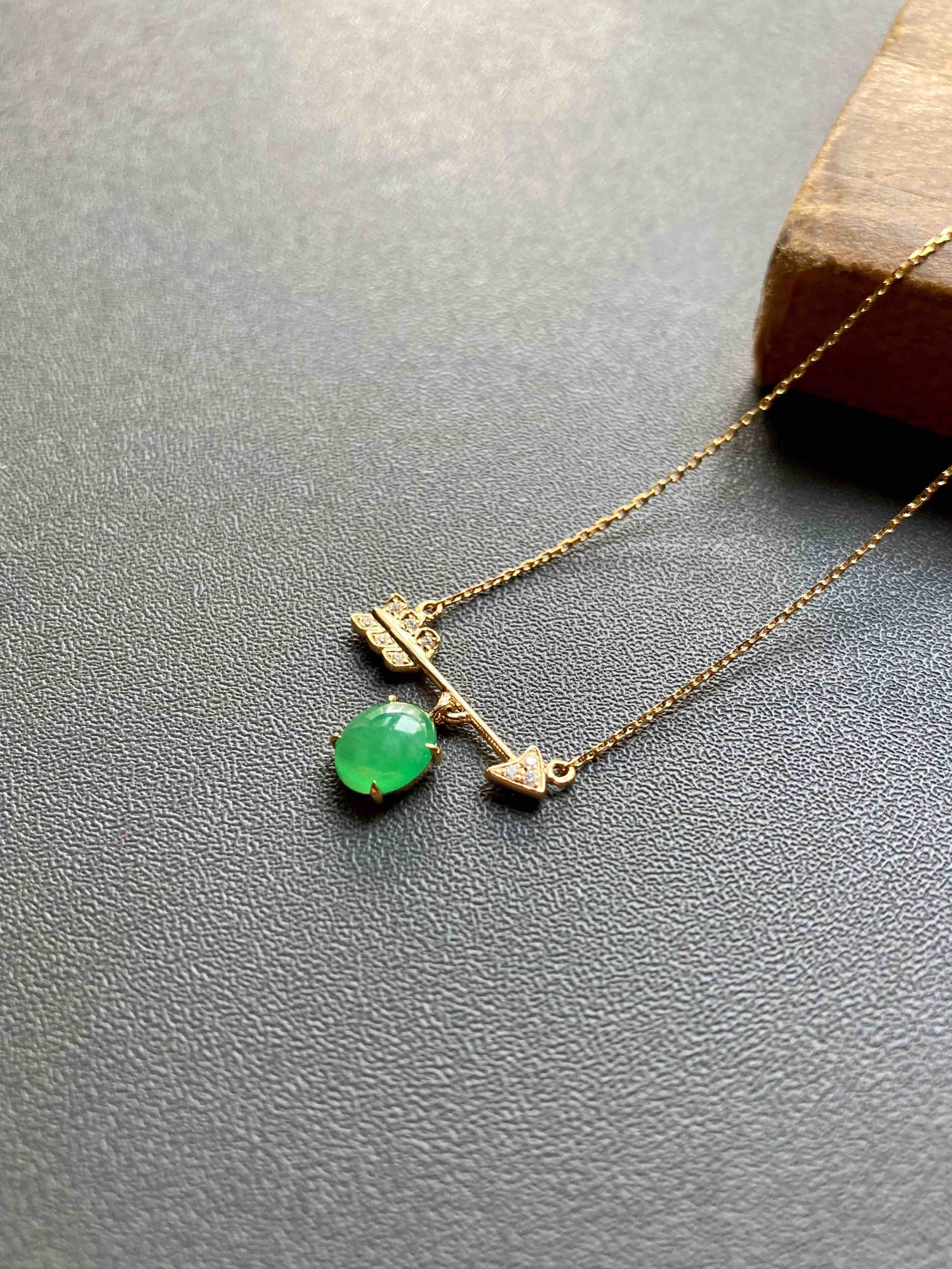 萌萌的阳绿翡翠蛋面锁骨链,缅甸料,蛋面品质特别好,种水晶莹剔透,阳绿艳丽,一支丘比特爱神之箭,设计风格时尚简约,翡翠禄来原创设计系列,只要小四价位你就可以拥有一件设计师作品,还是冰种阳绿翡翠蛋面打造,全18k金钻石镶嵌,实在太划算啦。蛋面6.5×5.8×3mm,链长40cm加5cm延长链
