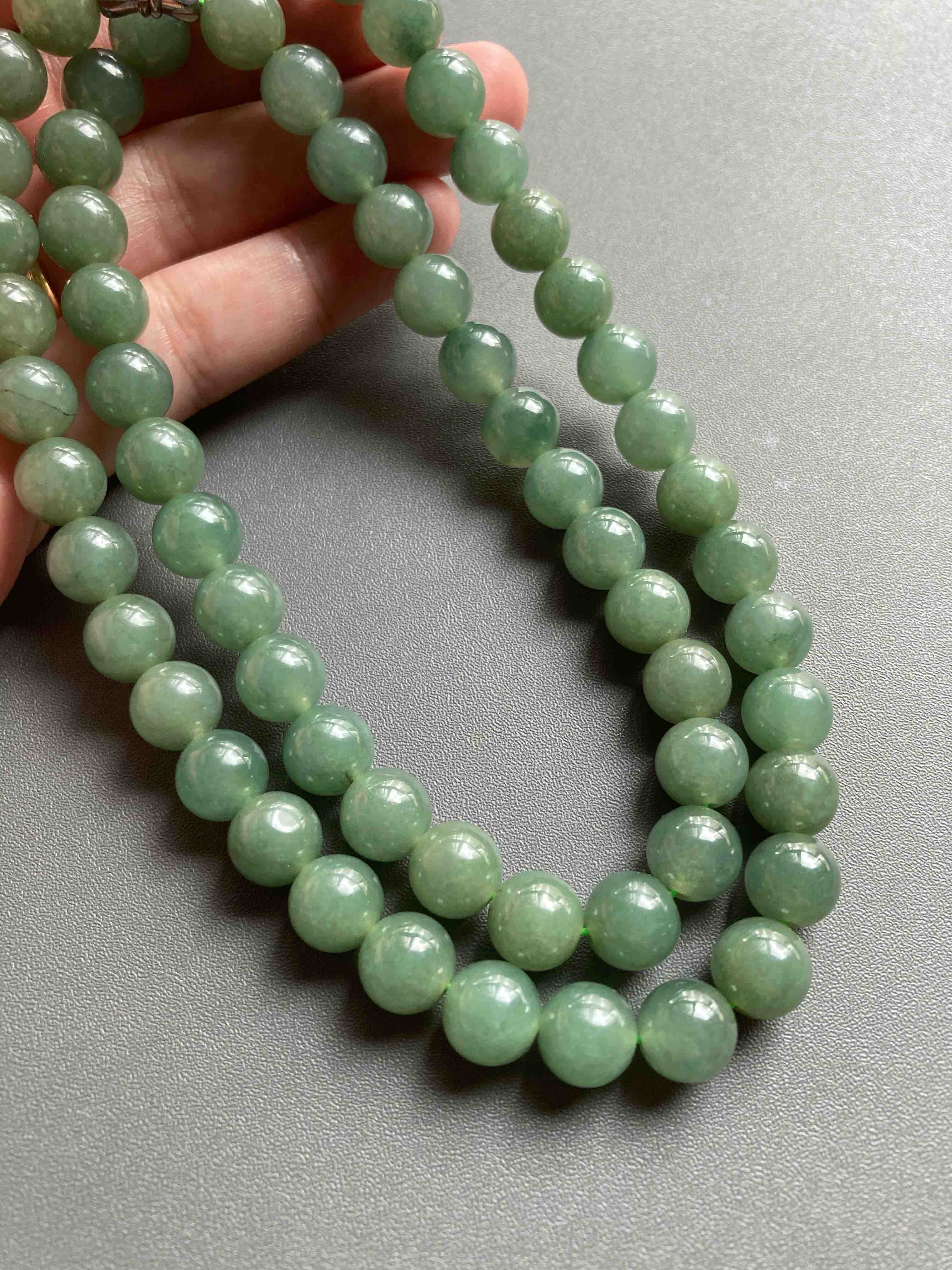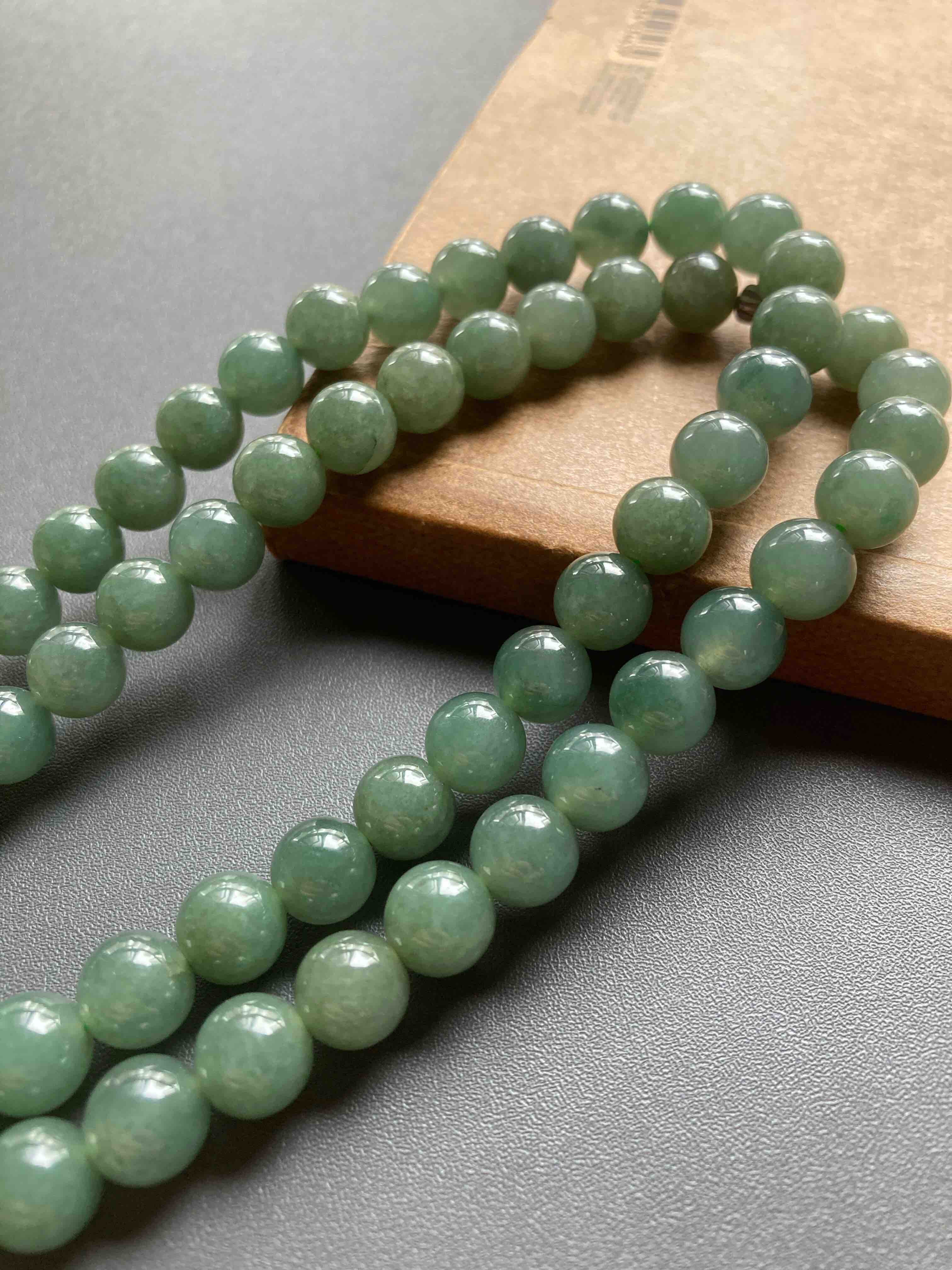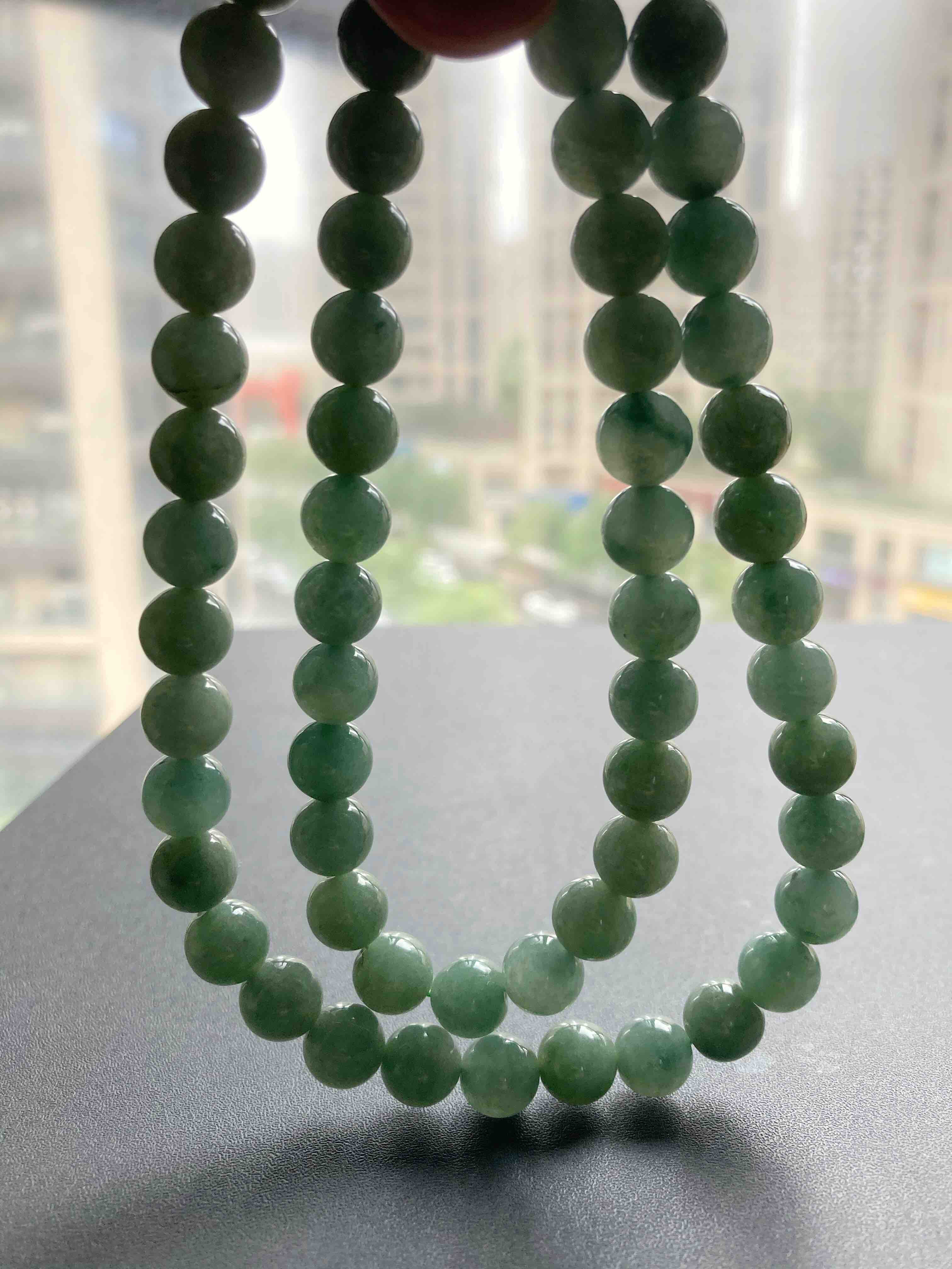 糯冰种晴水绿翡翠大珠串,稀有的翡翠大珠子长串,规格实在太给力,珠子大小9.8mm,总长58cm,糯冰种晴水绿,色浓郁,做项链大气,也可以改单圈手串,可以出三串