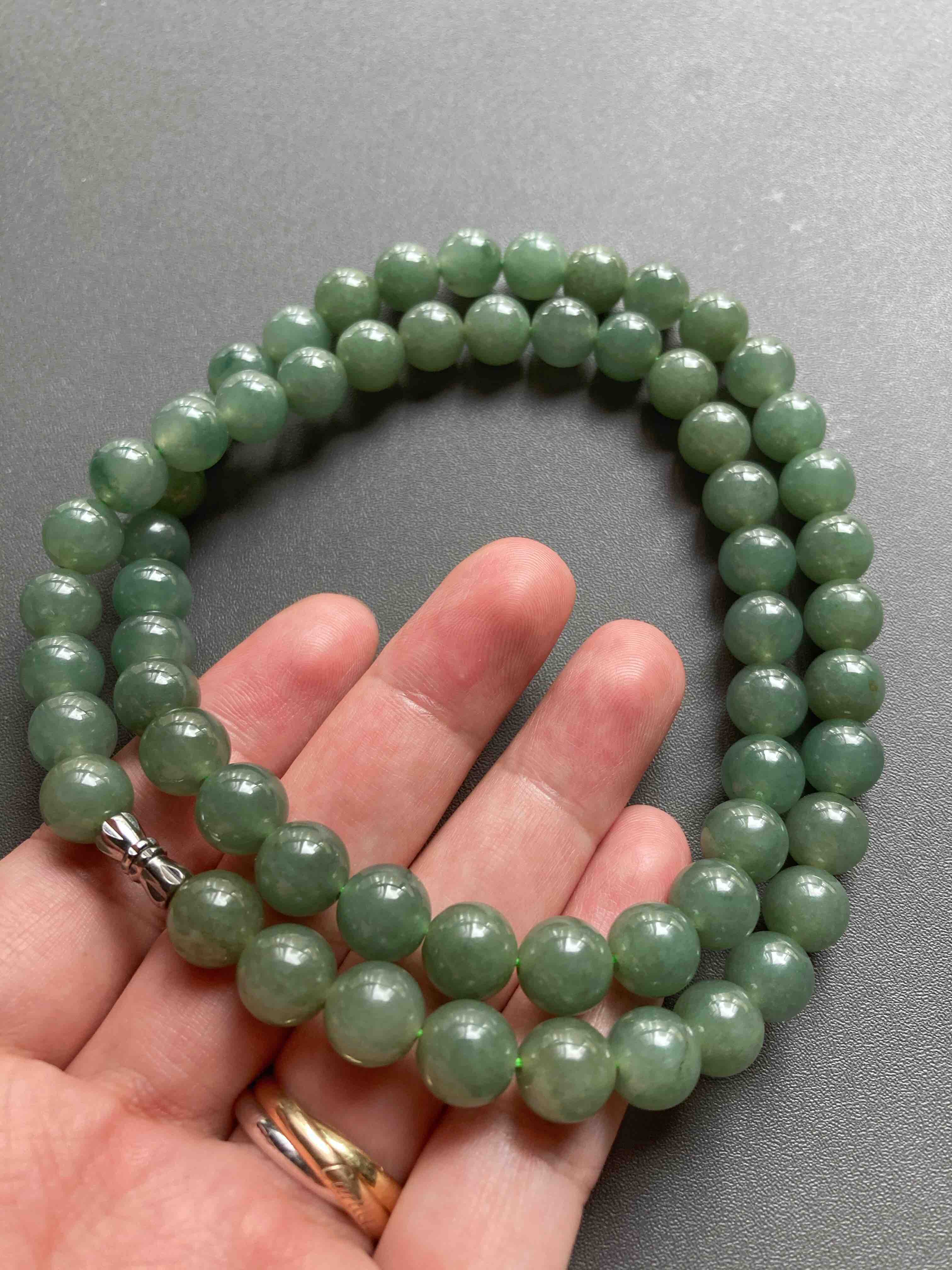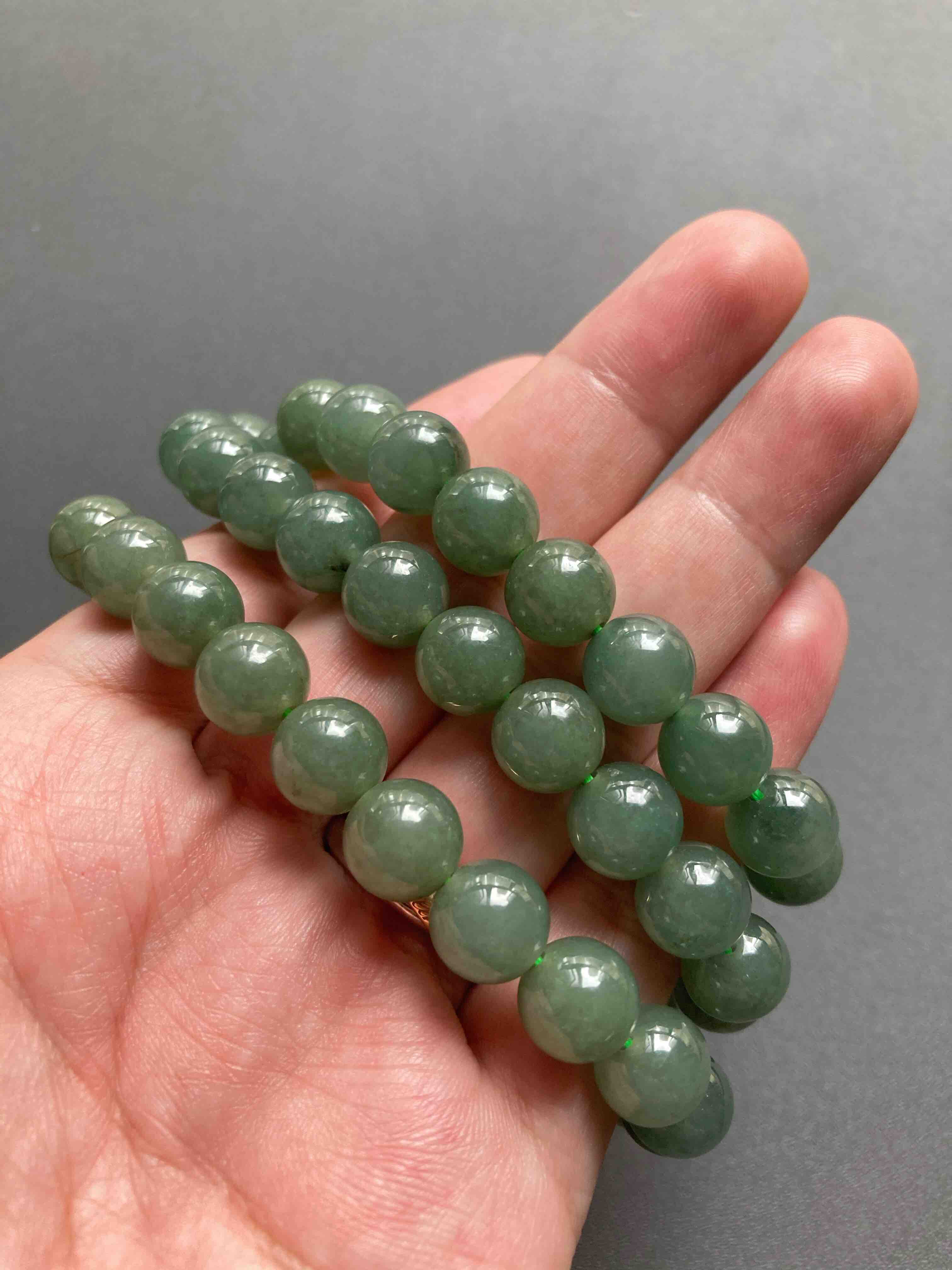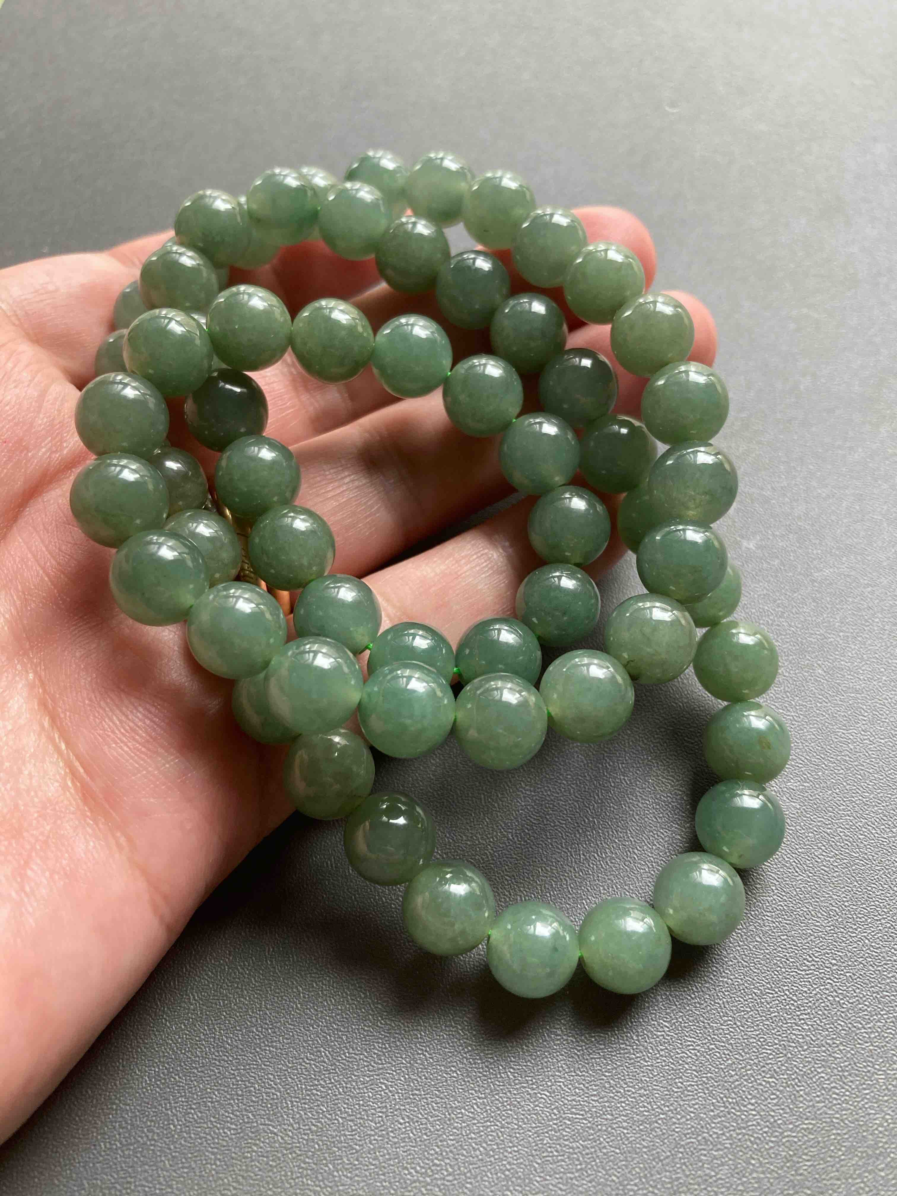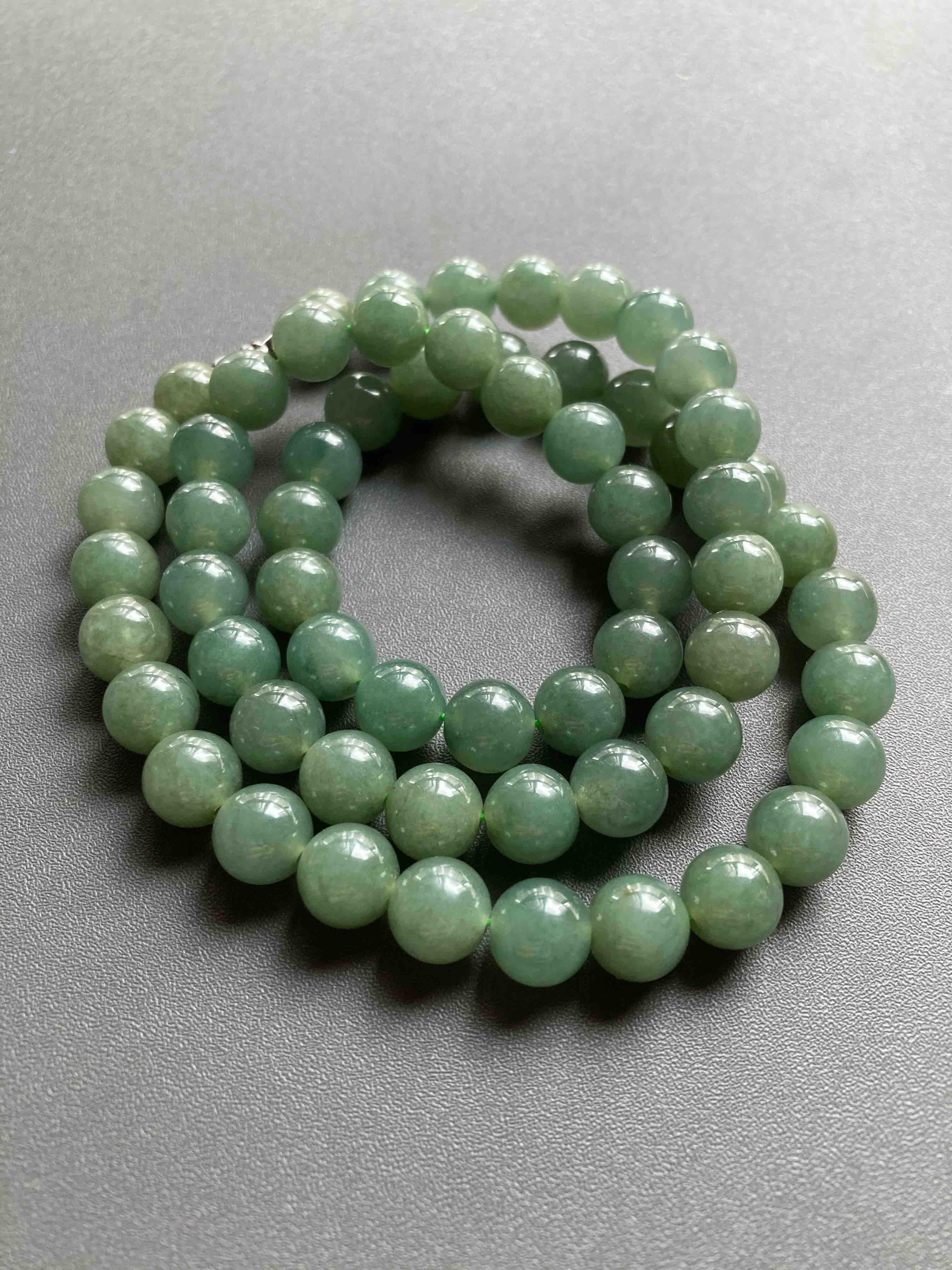 糯冰种晴水绿翡翠大珠串,稀有的翡翠大珠子长串,规格实在太给力,珠子大小9.8mm,总长58cm,糯冰种晴水绿,色浓郁,做项链大气,也可以改单圈手串,可以出三串
