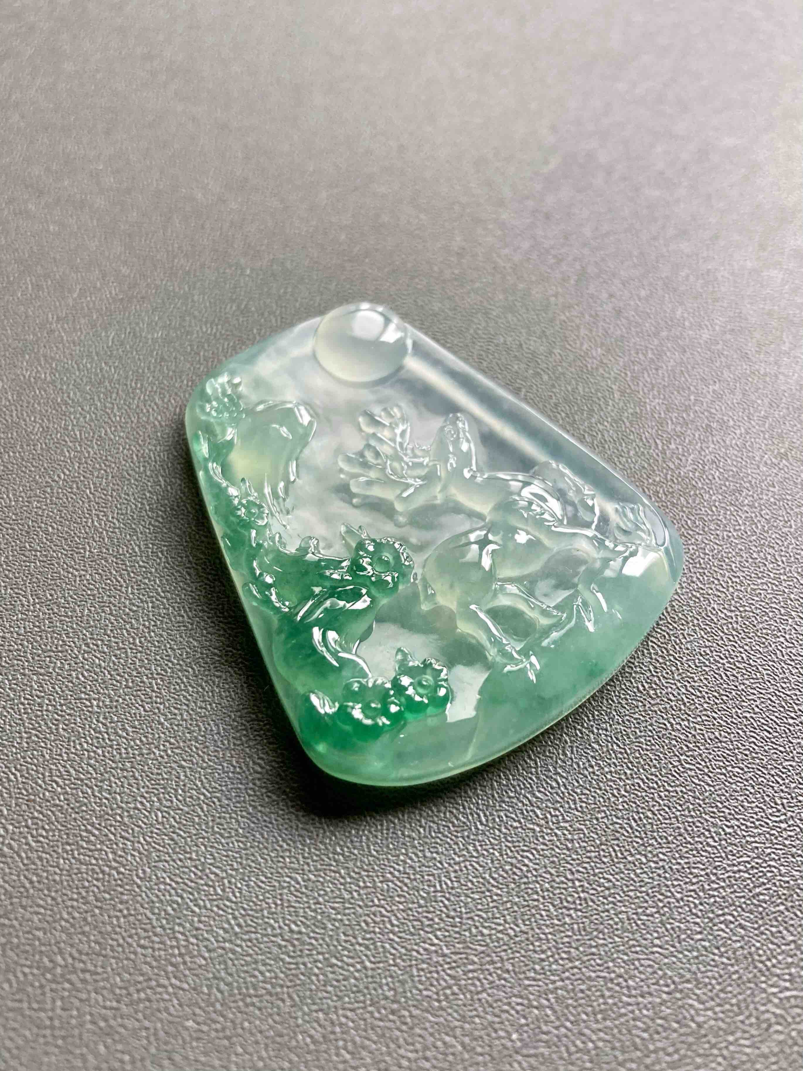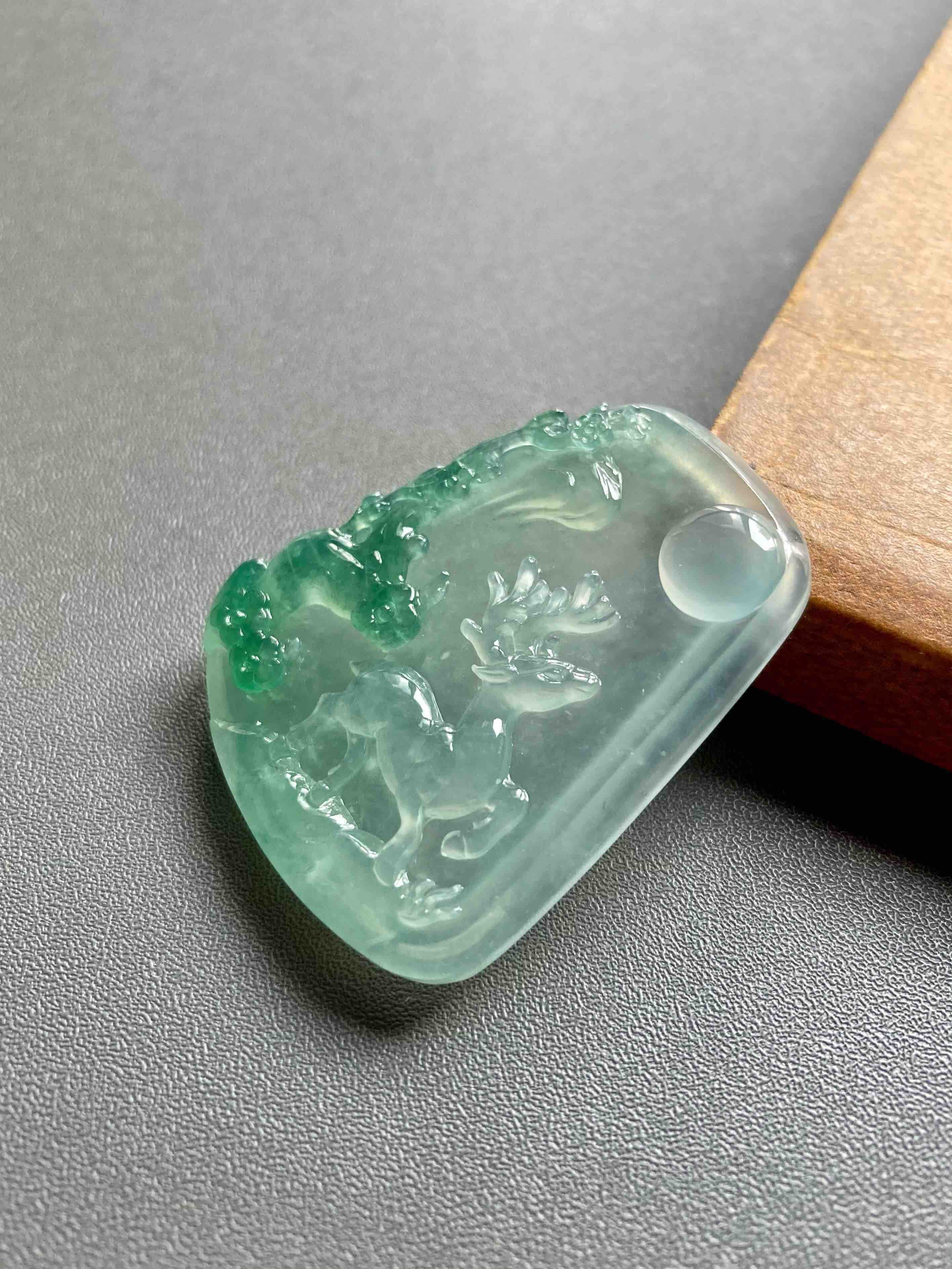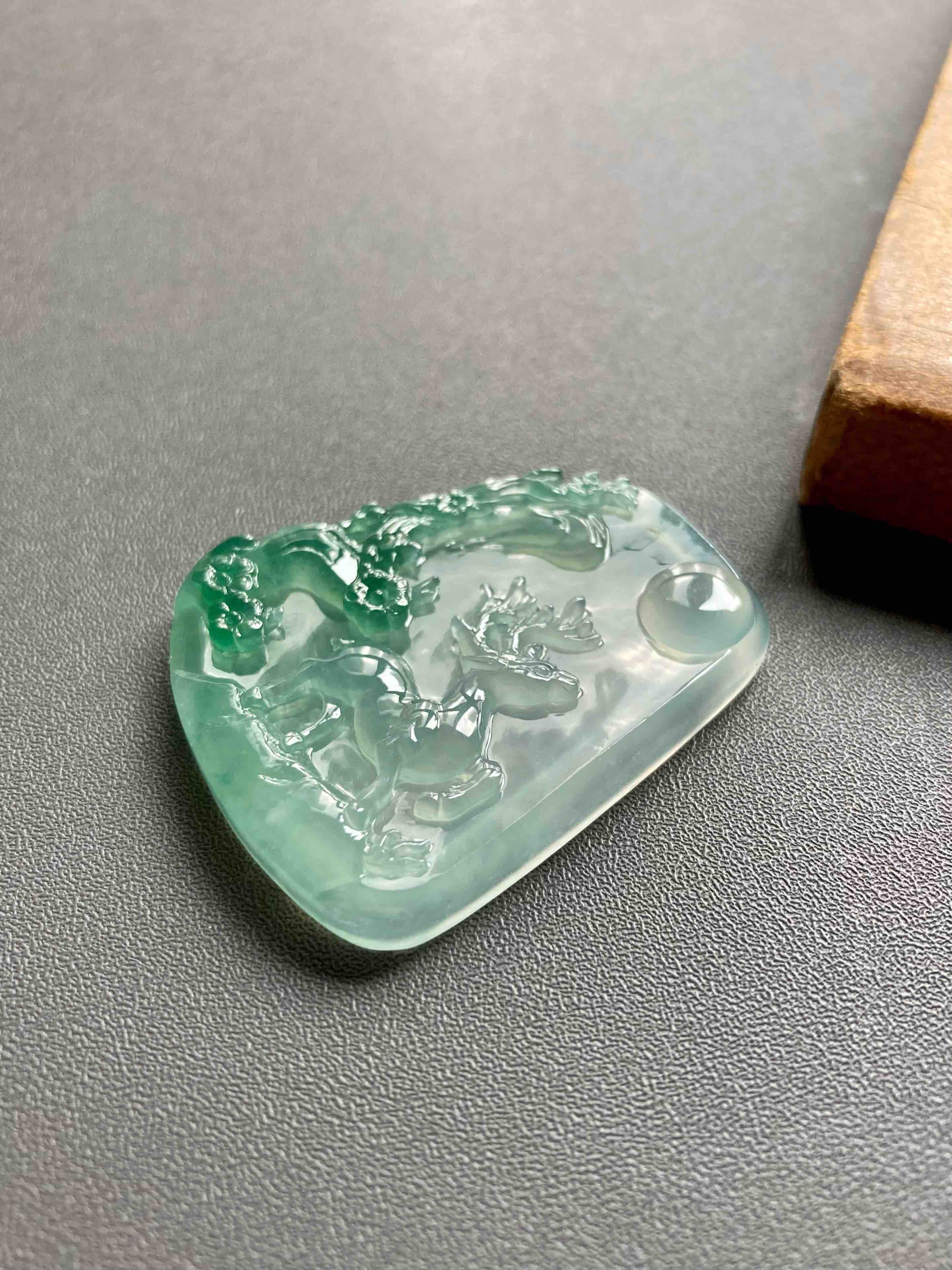 稀有之物,非常大气厚实的一块冰种绿色巧雕翡翠梅花鹿牌,尺寸42.9×34.6×6.8mm,种水晶莹剔透,荧光四射,设计构思非常巧妙,绿色部分雕刻梅花,一只小鹿活灵活现,自然与人文的结合,意境优美。鹿,寓意福禄,梅花,通梅花榜,有高中及第,金榜题名的美意