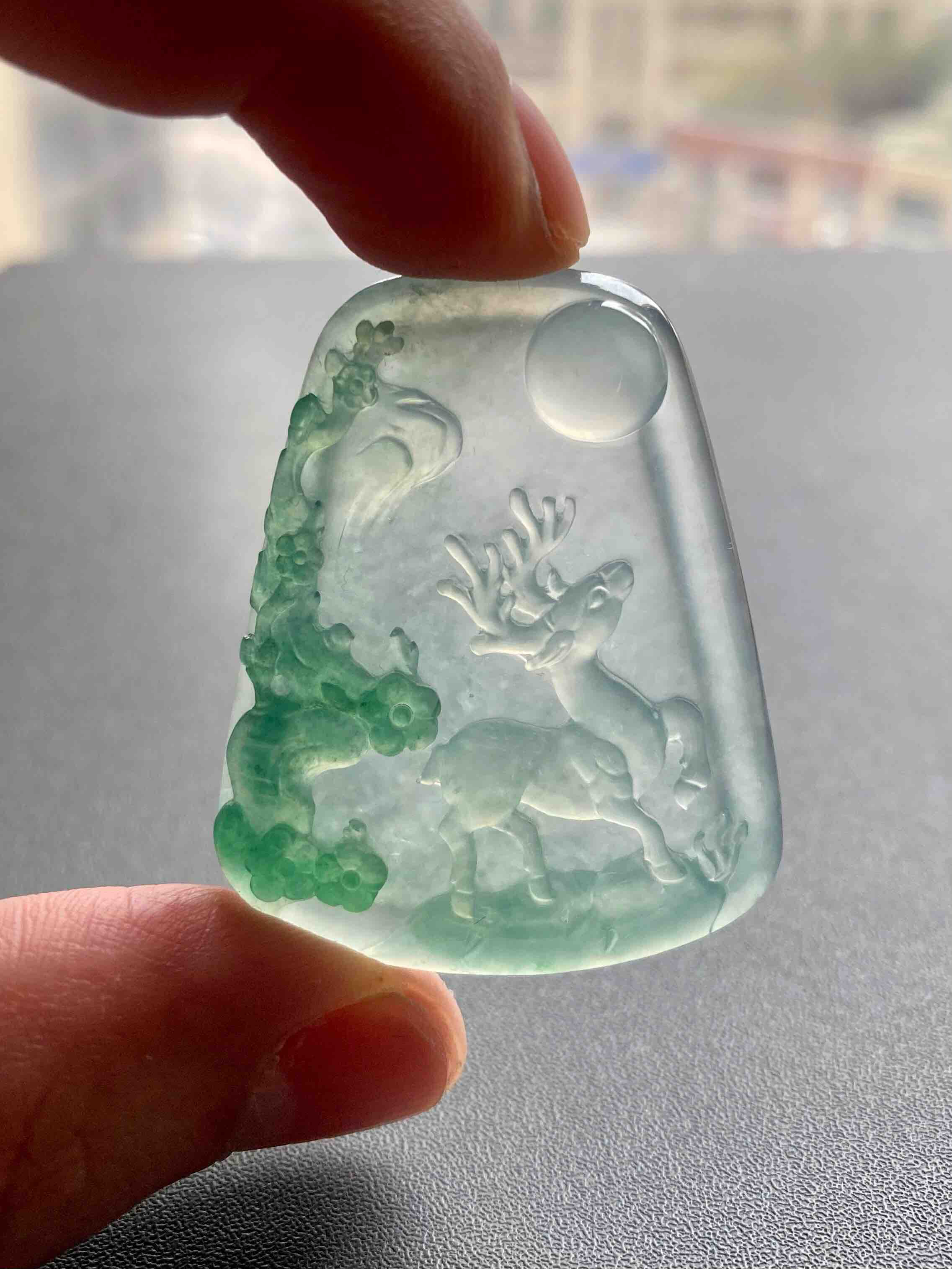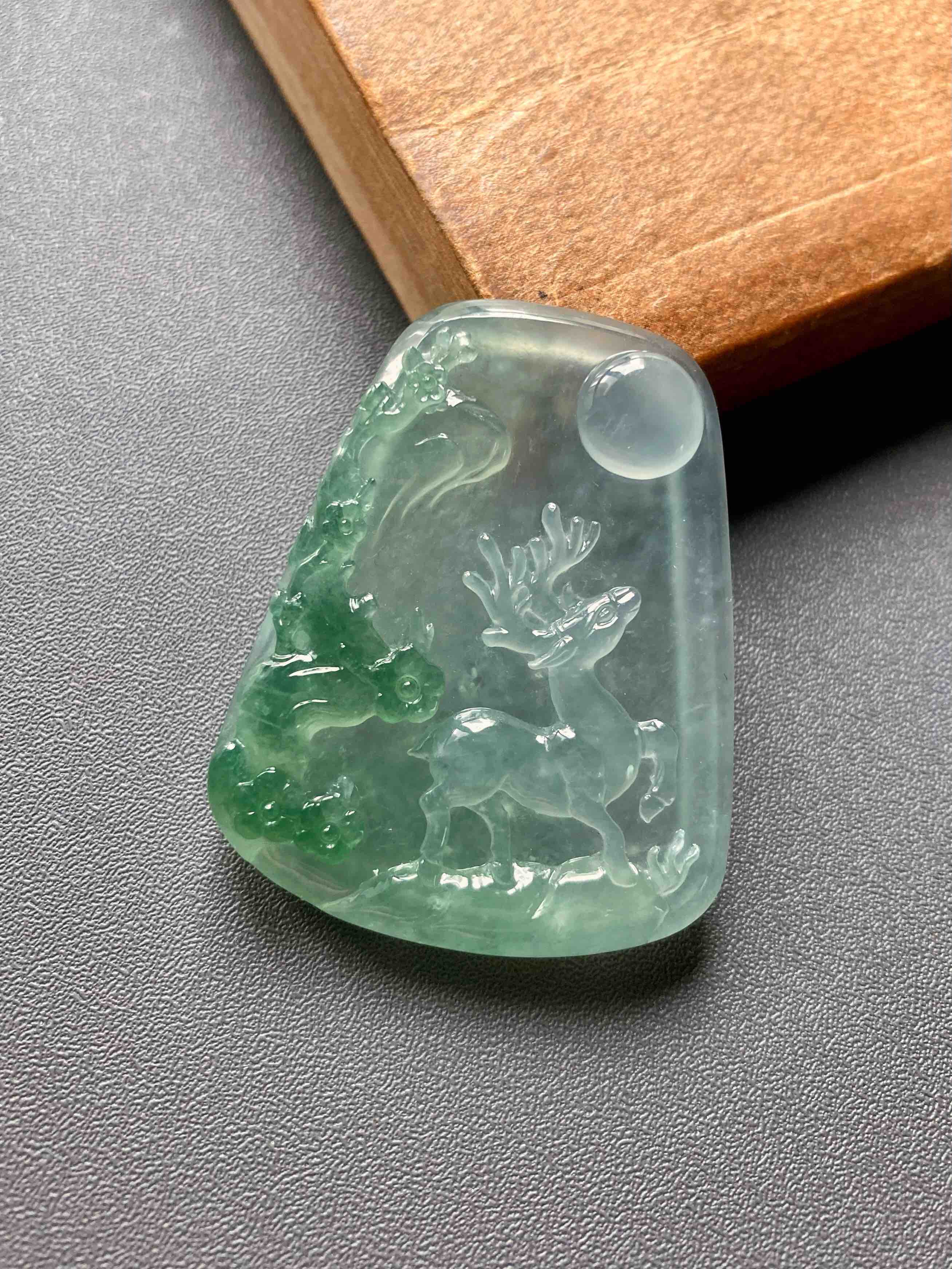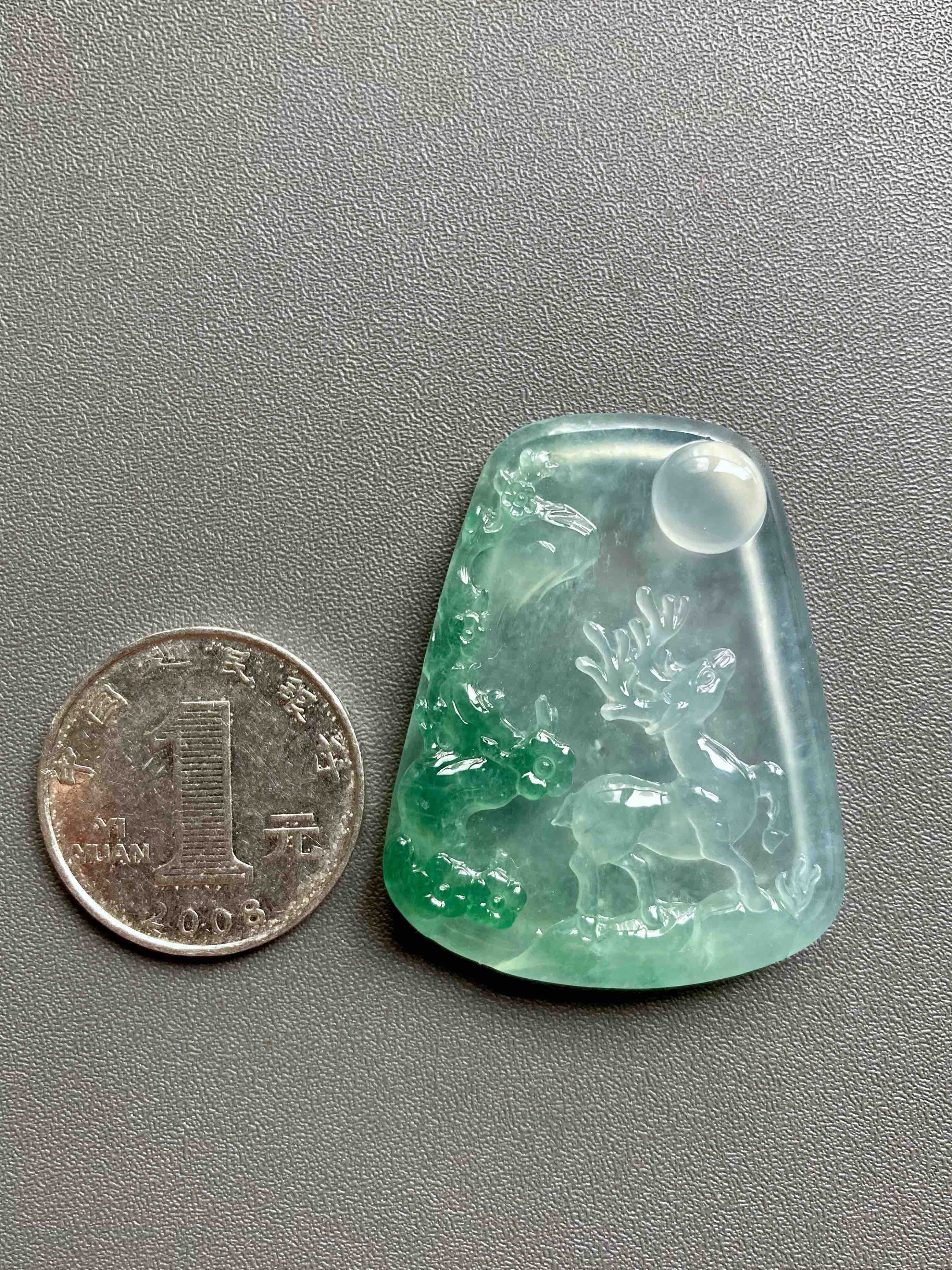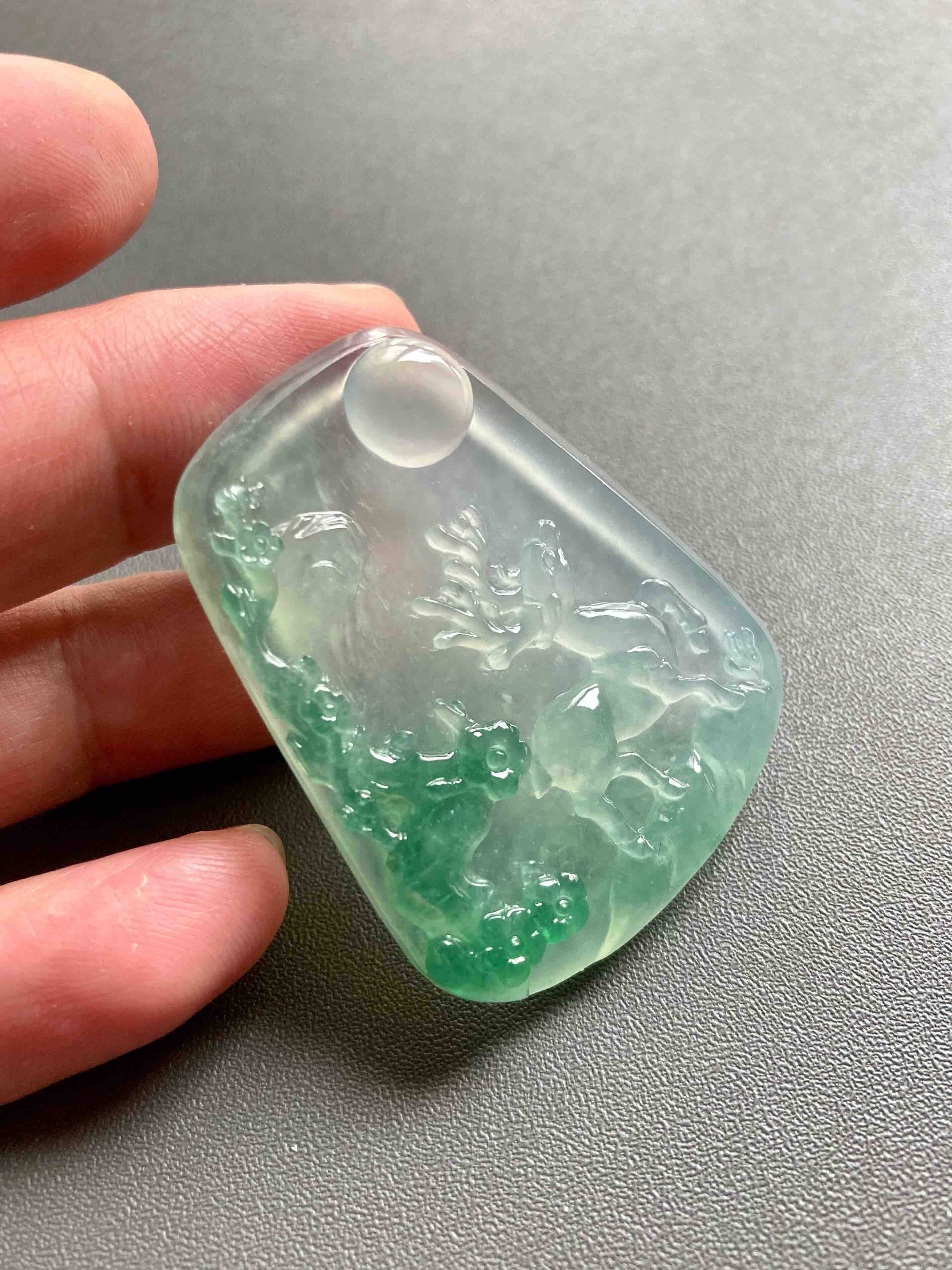 稀有之物,非常大气厚实的一块冰种绿色巧雕翡翠梅花鹿牌,尺寸42.9×34.6×6.8mm,种水晶莹剔透,荧光四射,设计构思非常巧妙,绿色部分雕刻梅花,一只小鹿活灵活现,自然与人文的结合,意境优美。鹿,寓意福禄,梅花,通梅花榜,有高中及第,金榜题名的美意