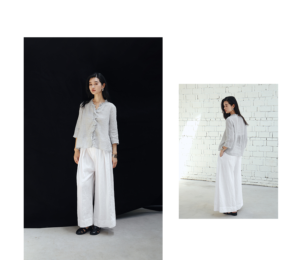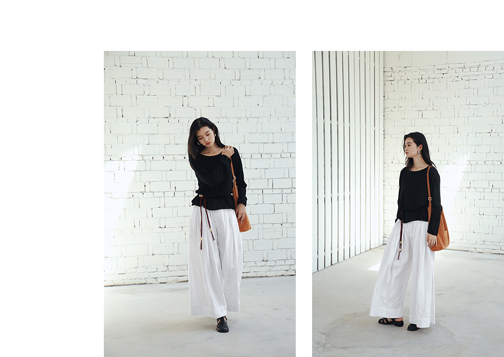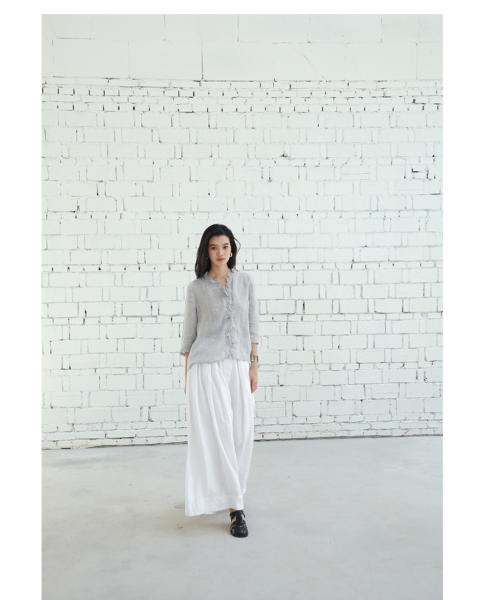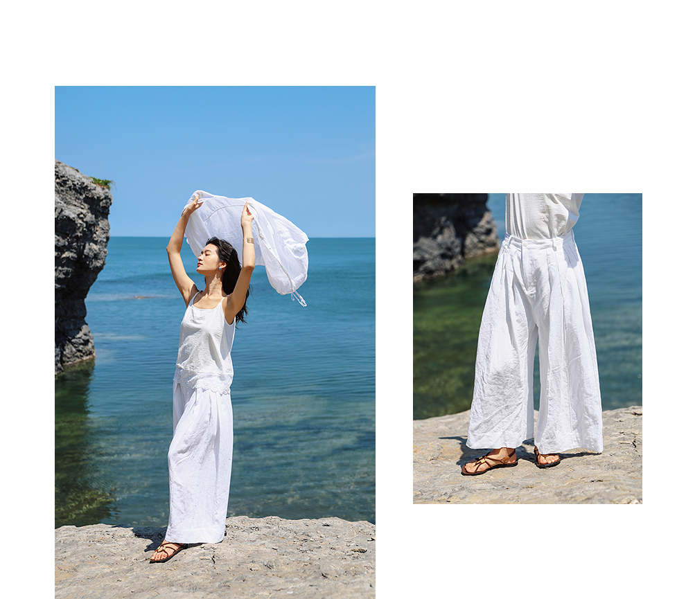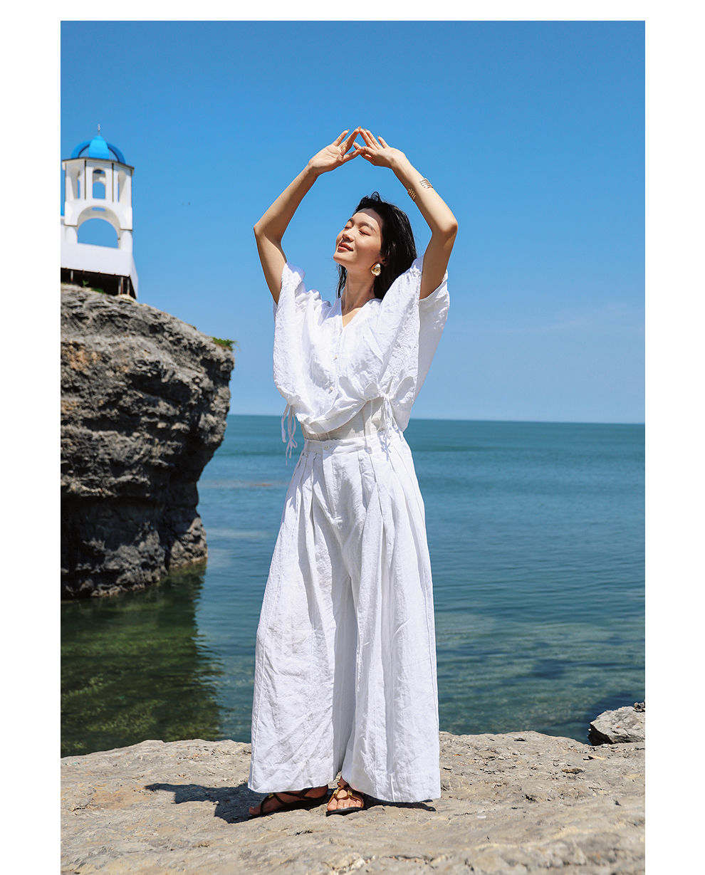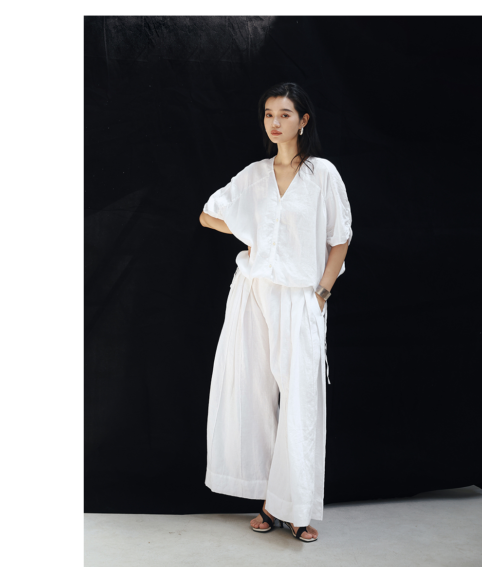 绽放旅行女装459朵/【黑白灰系列·白武士】纯亚麻阔腿裙裤休闲裤