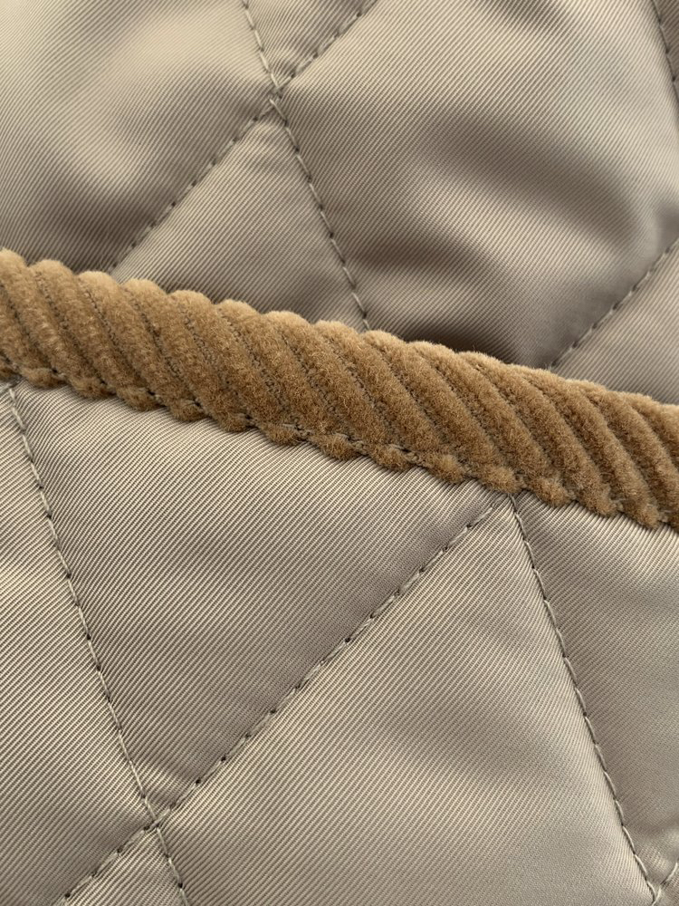 古董灯芯绒打造对称撞色领型,特意保留原始布料的微磨毛触感,每次低头整理衣领, 都像在抚摸祖父书房的老沙发。