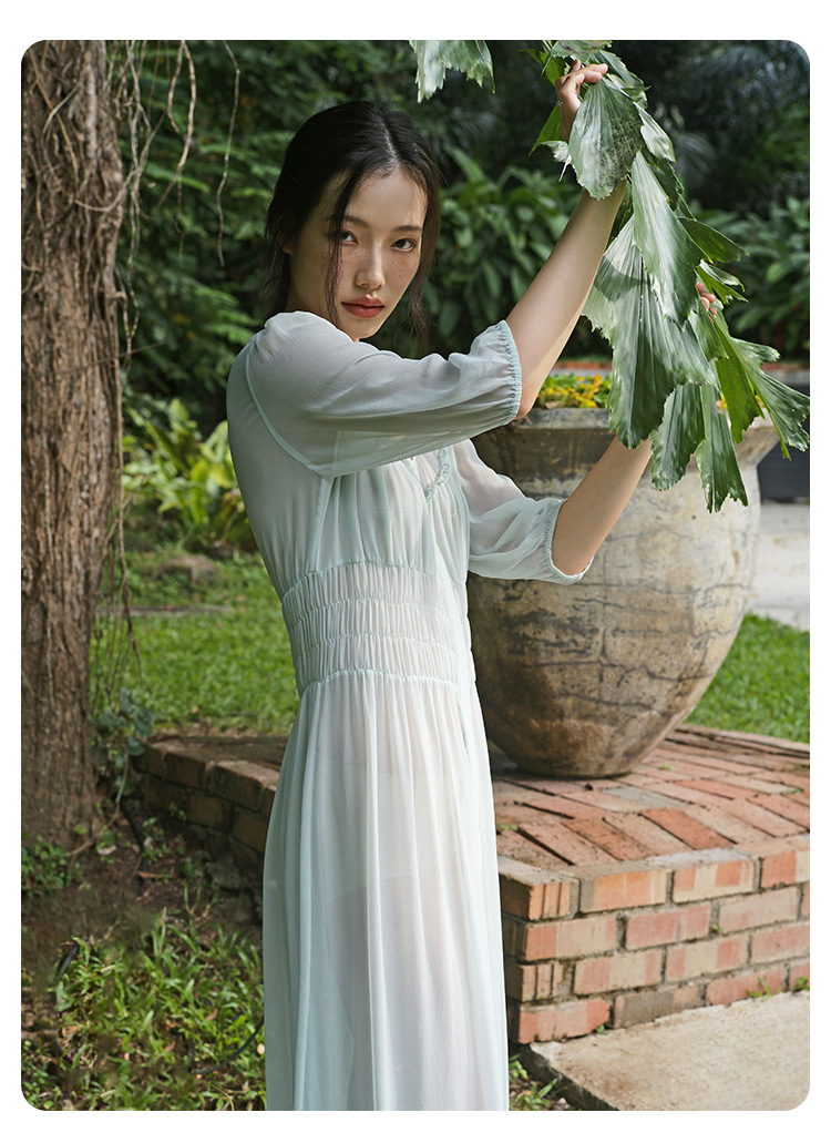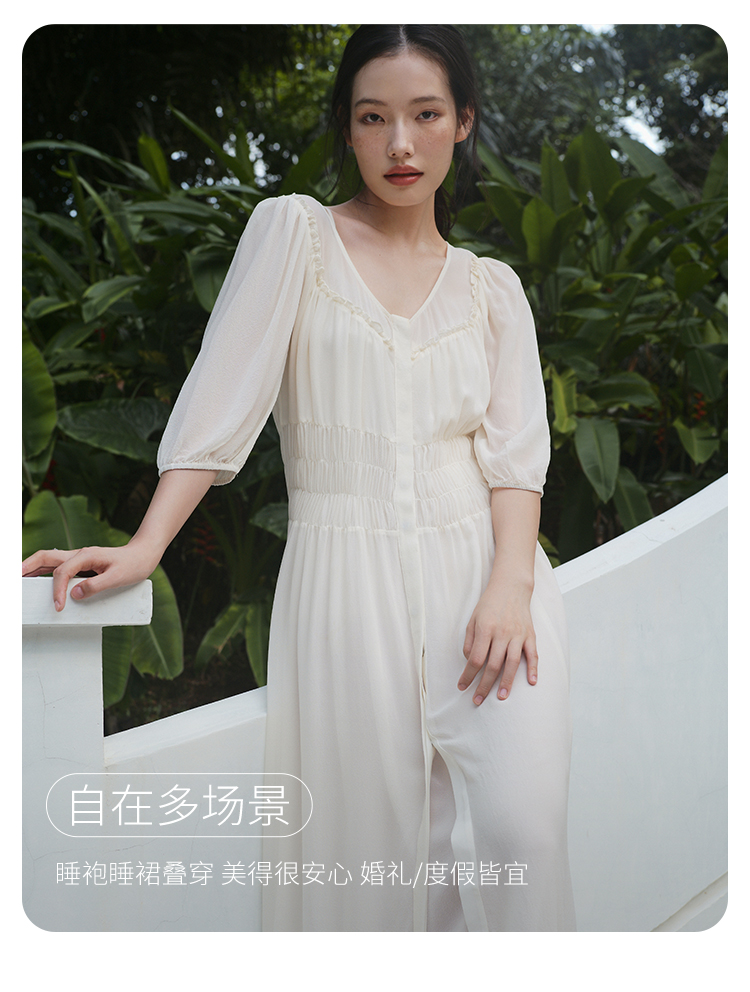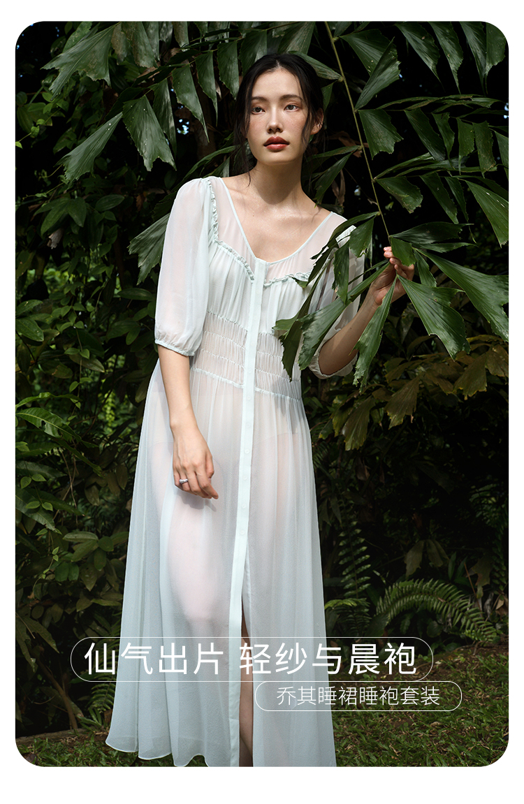 桑罗乔其纱睡裙睡袍套装蕾丝拼接桑蚕丝仙气轻纱晨袍浪漫度假