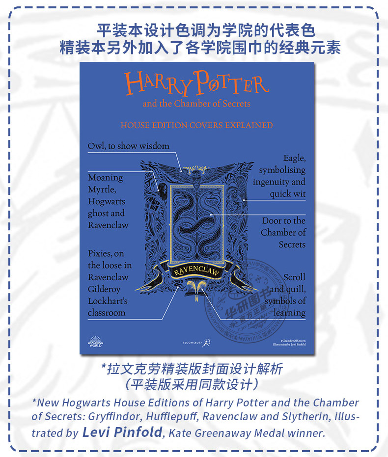 继去年魔法石20周年纪念版之后,今年又逢密室出版20周年,英国Bloomsbury出版社再次推出这套广受哈迷欢迎的学院纪念版。配以凯特·格林纳威大奖得主Levi Pinfold的插图和封面设计,加之每个学院的额外特色内容,带领我们回到霍格沃茨,重温魔法的魅力。