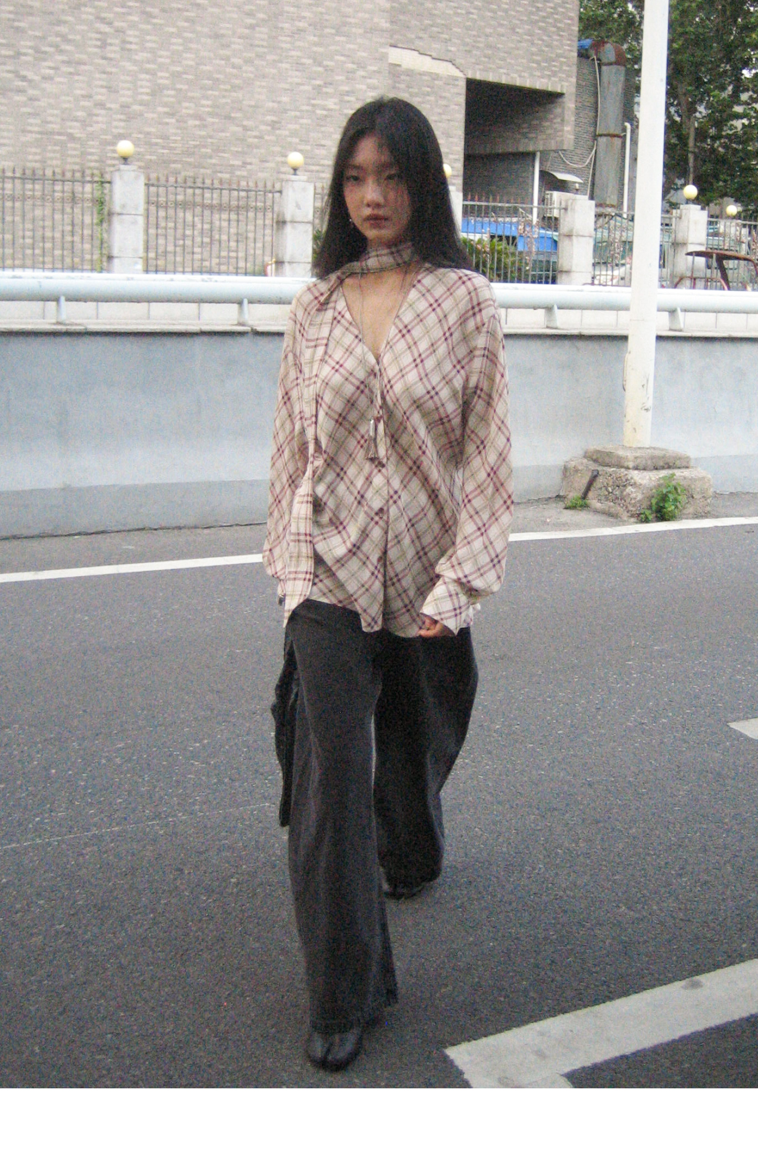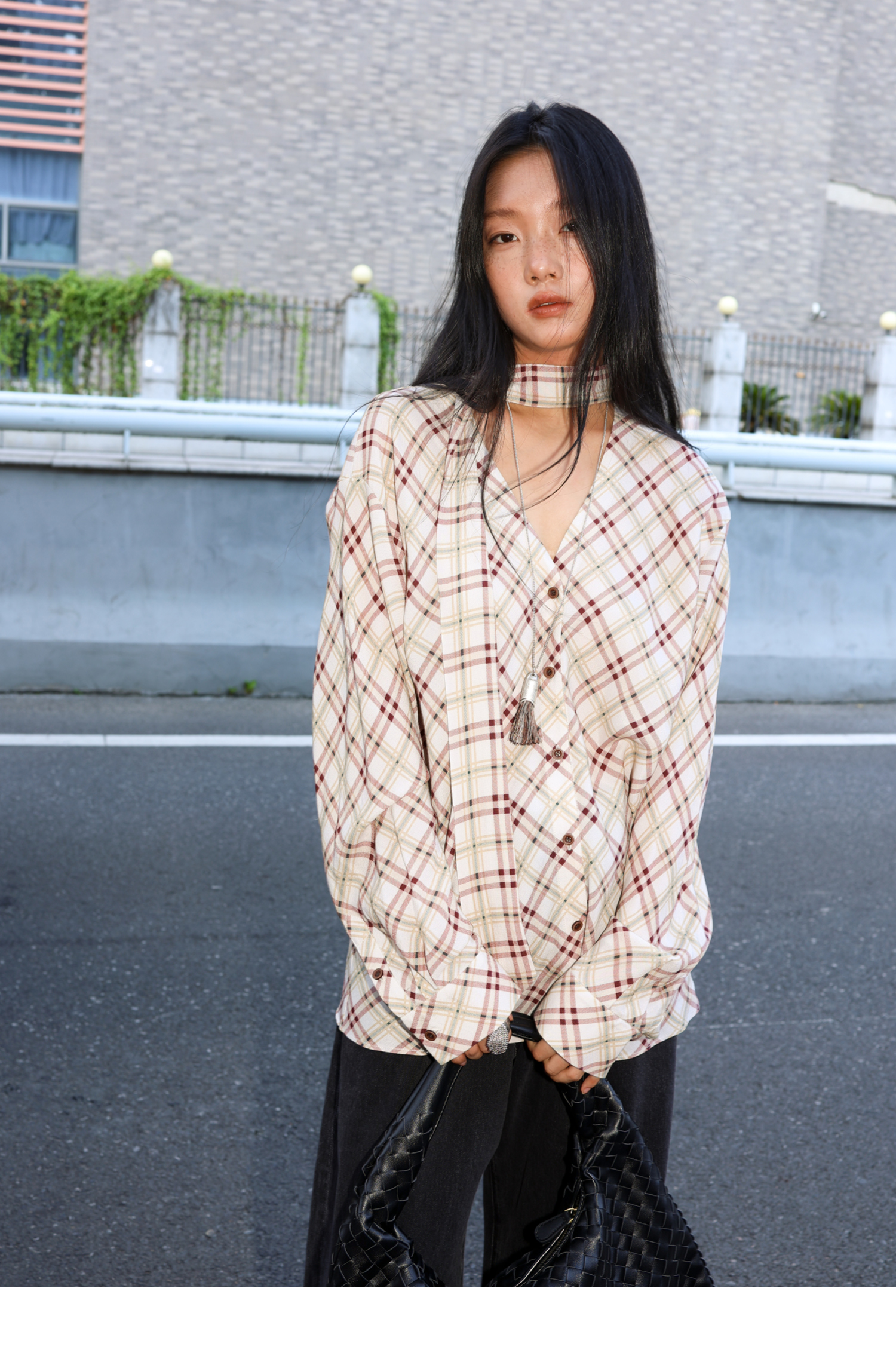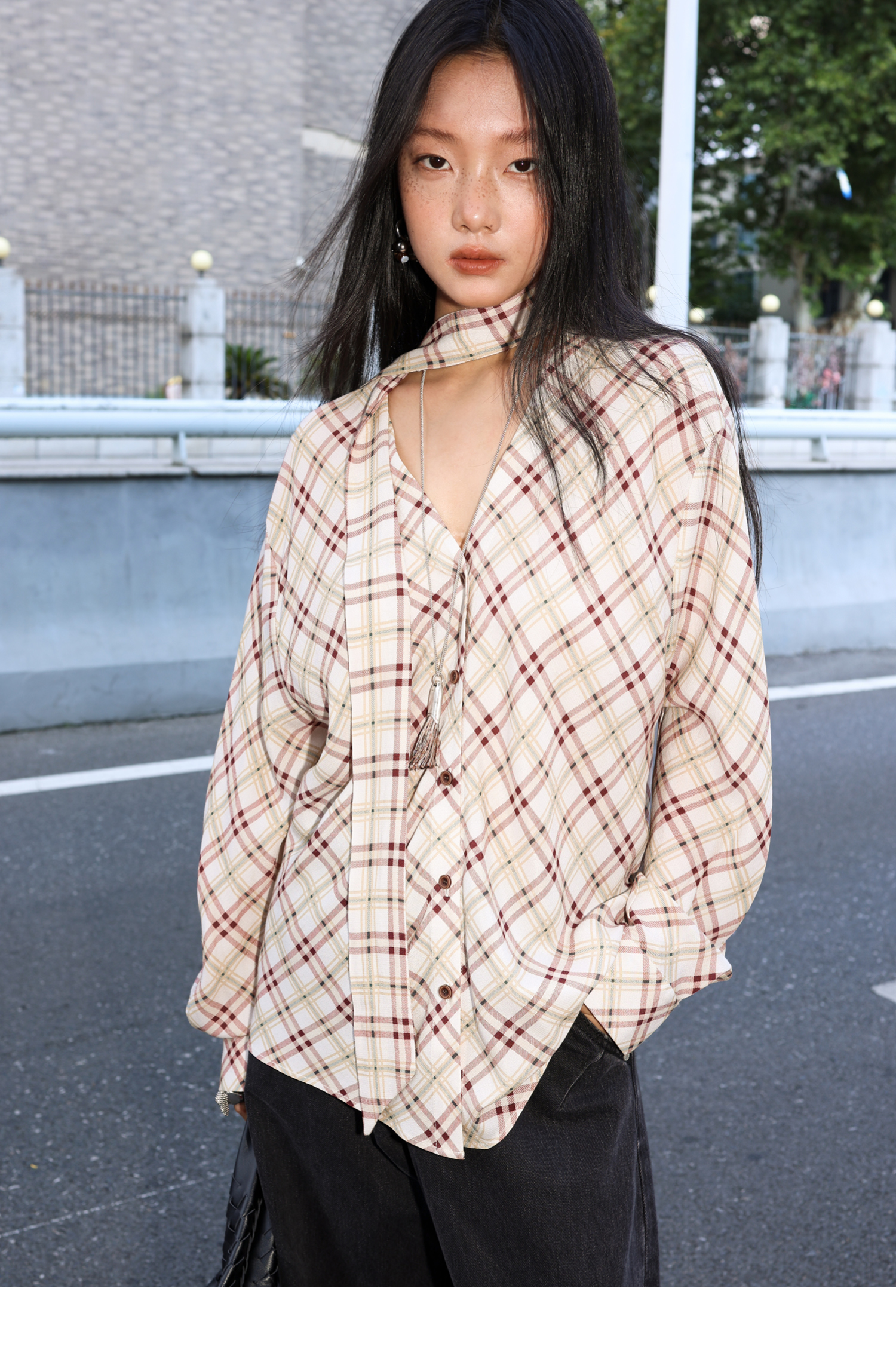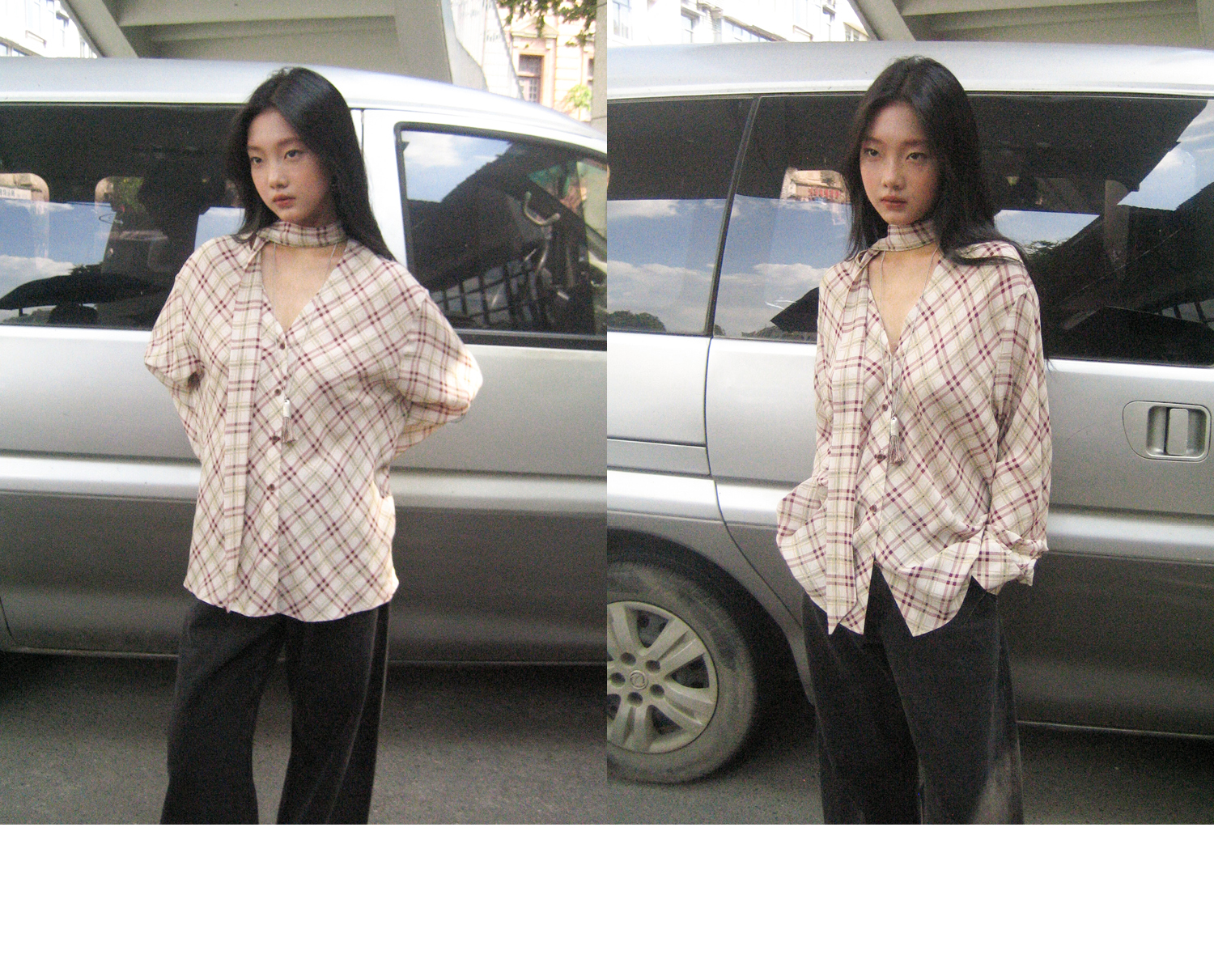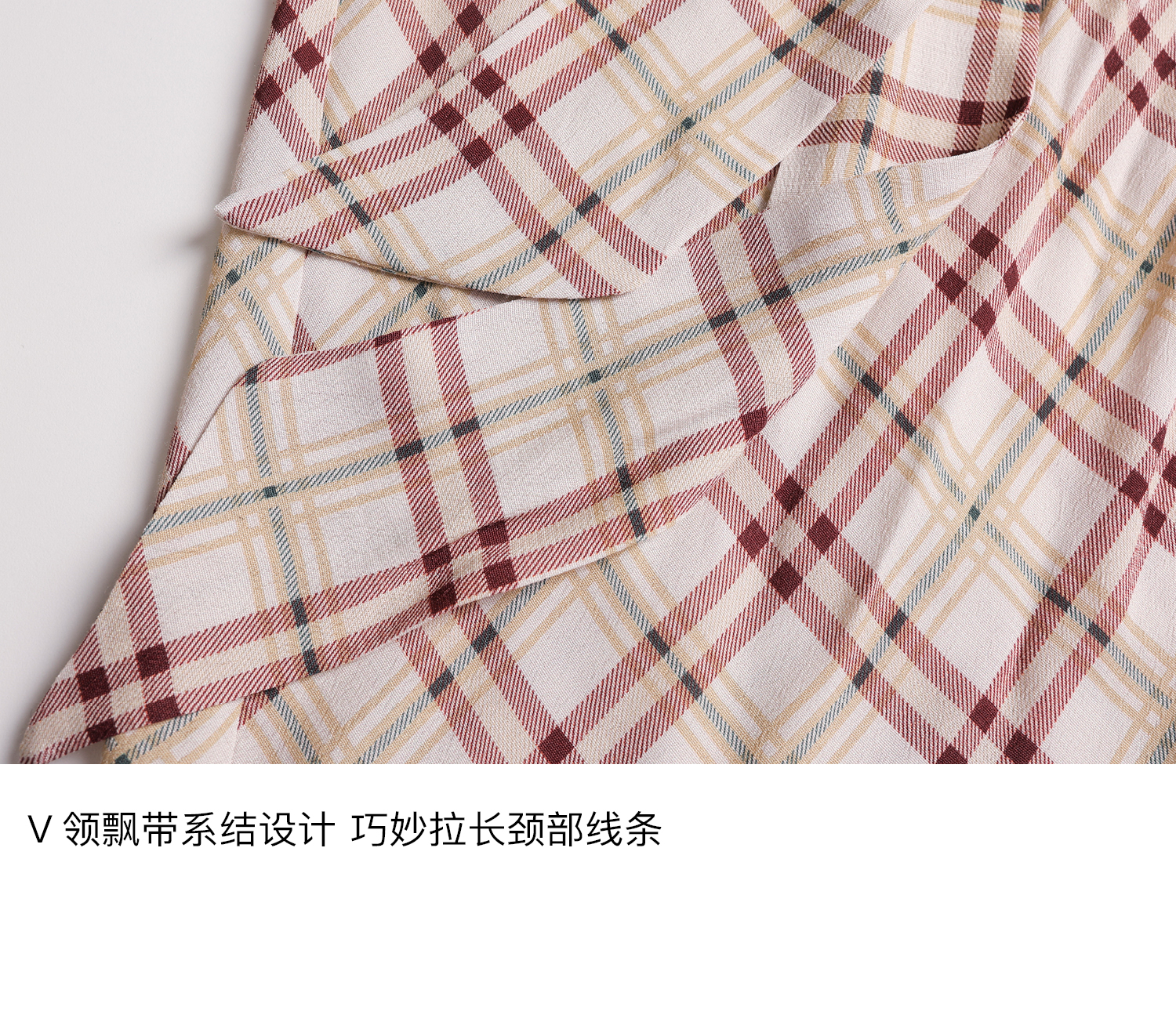 素舶 天丝轻盈柔顺雪纺格纹v领飘带设计感长袖衬衣