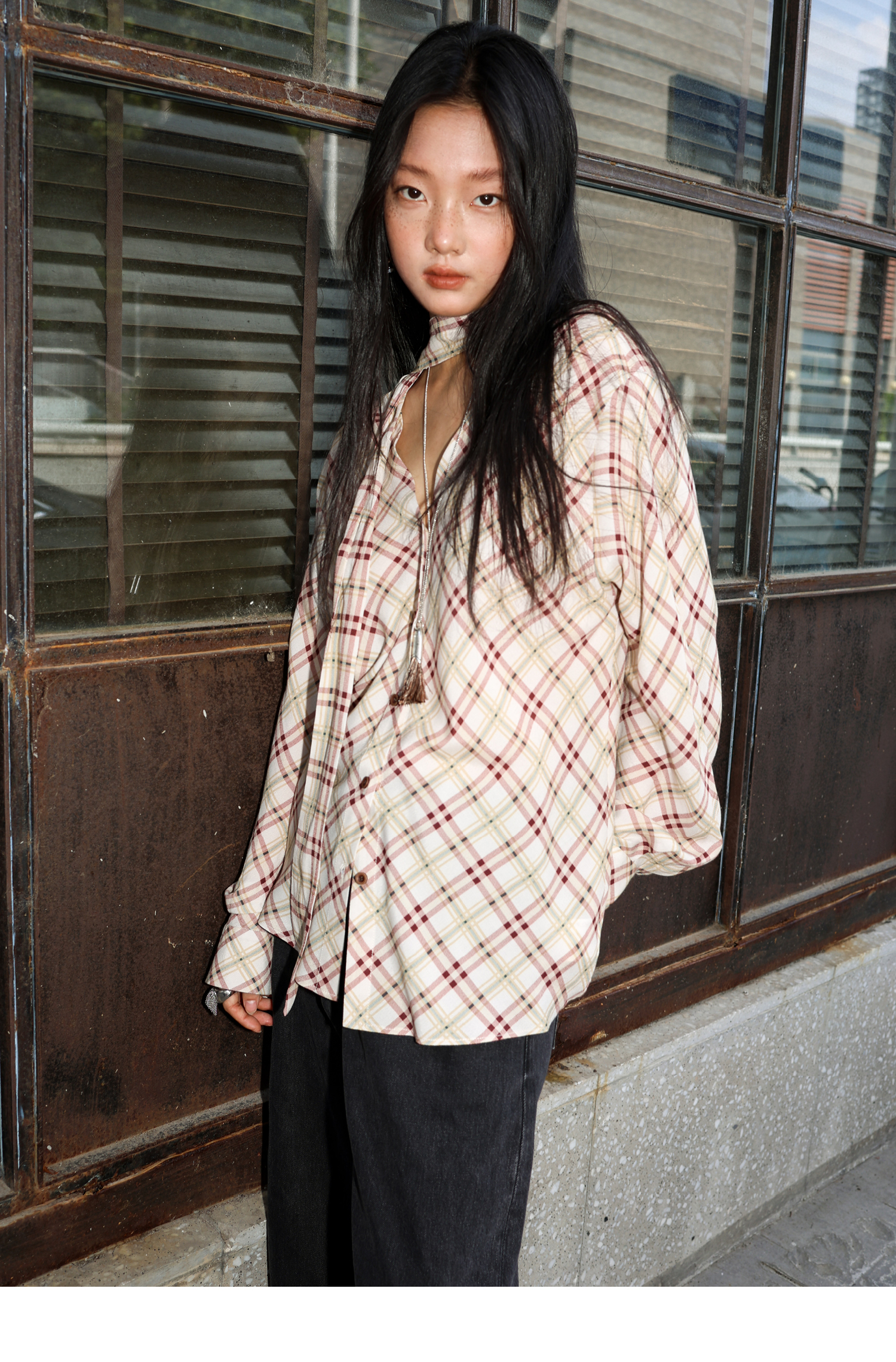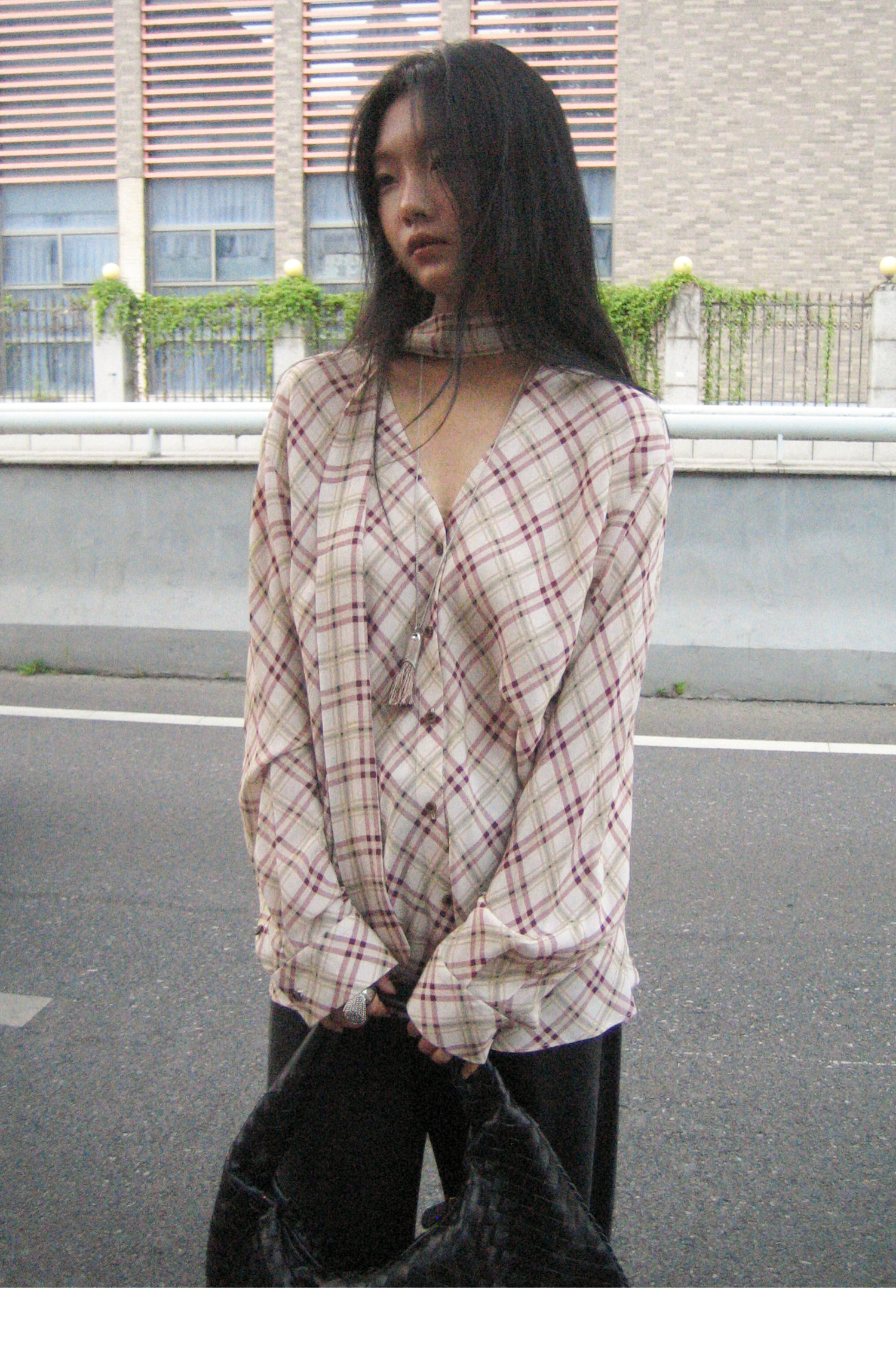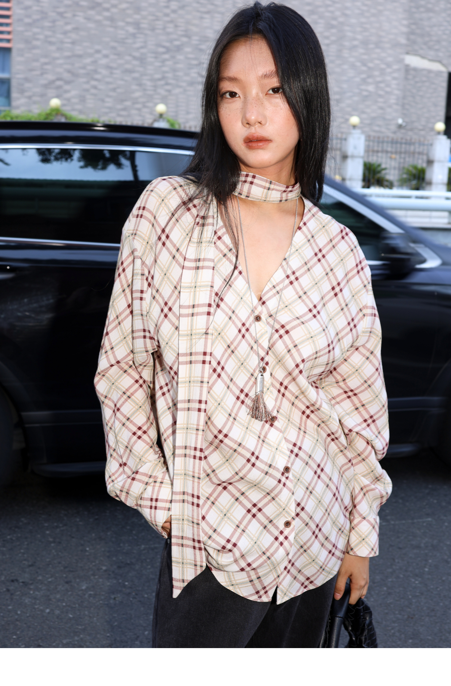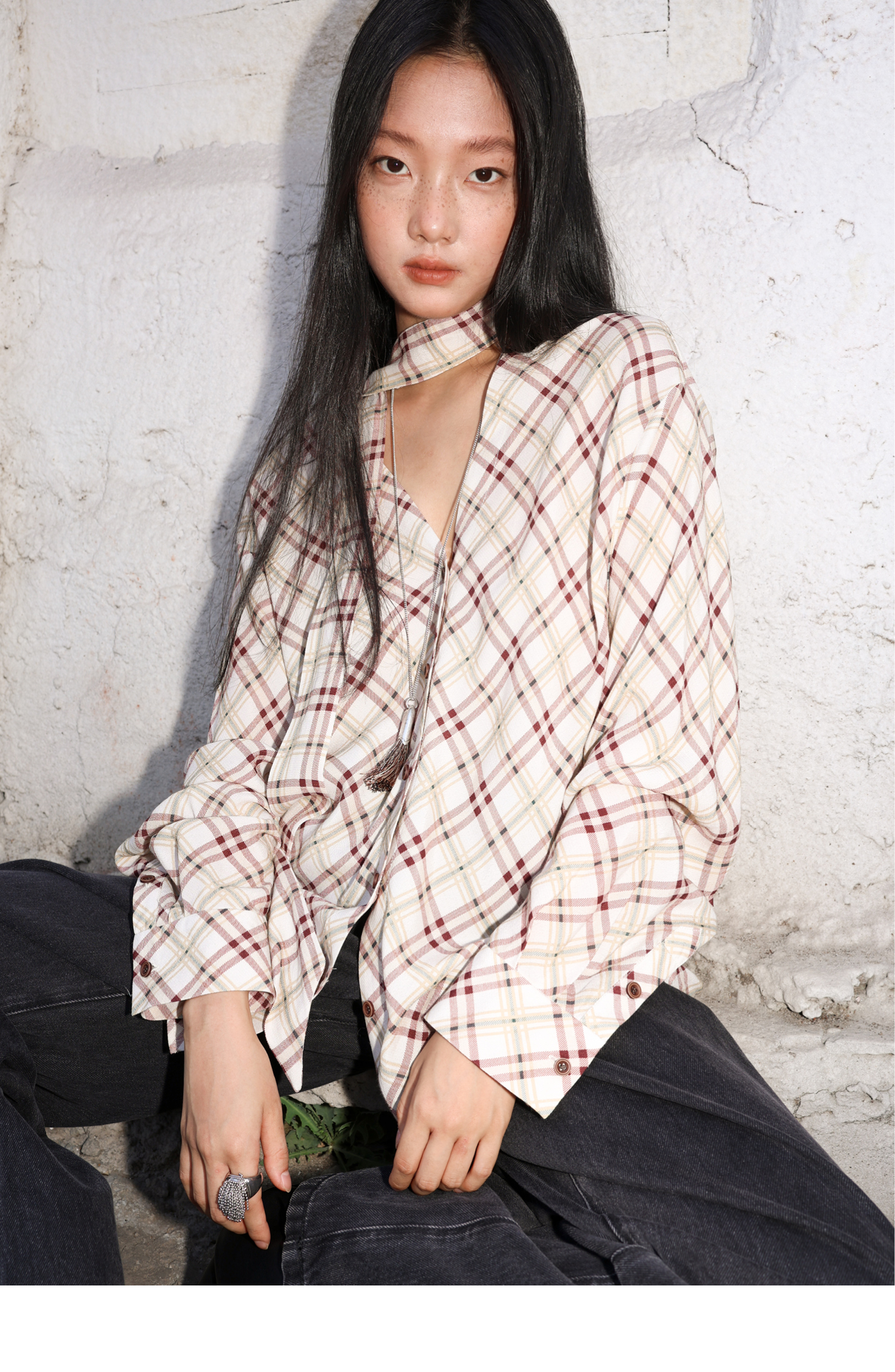 素舶 天丝轻盈柔顺雪纺格纹v领飘带设计感长袖衬衣