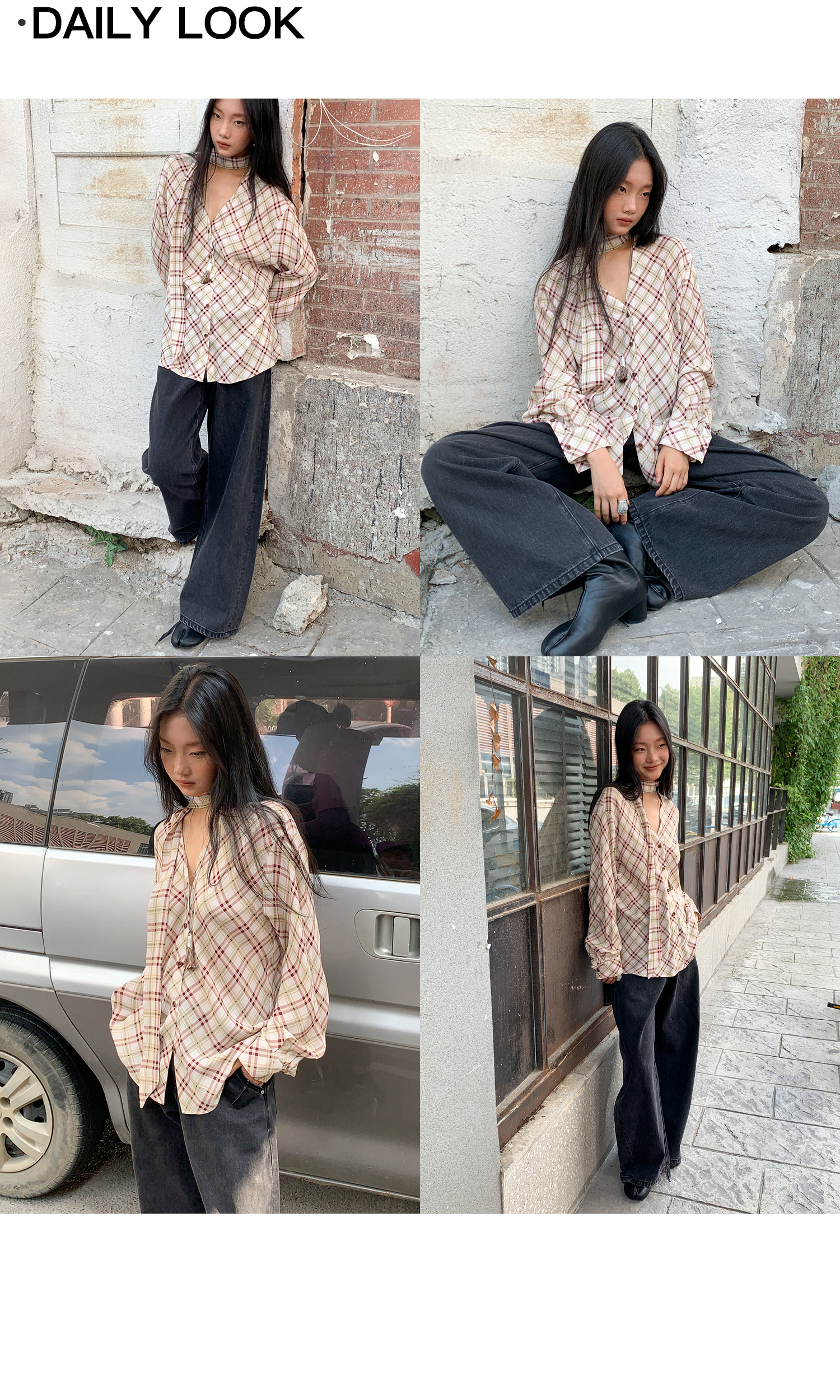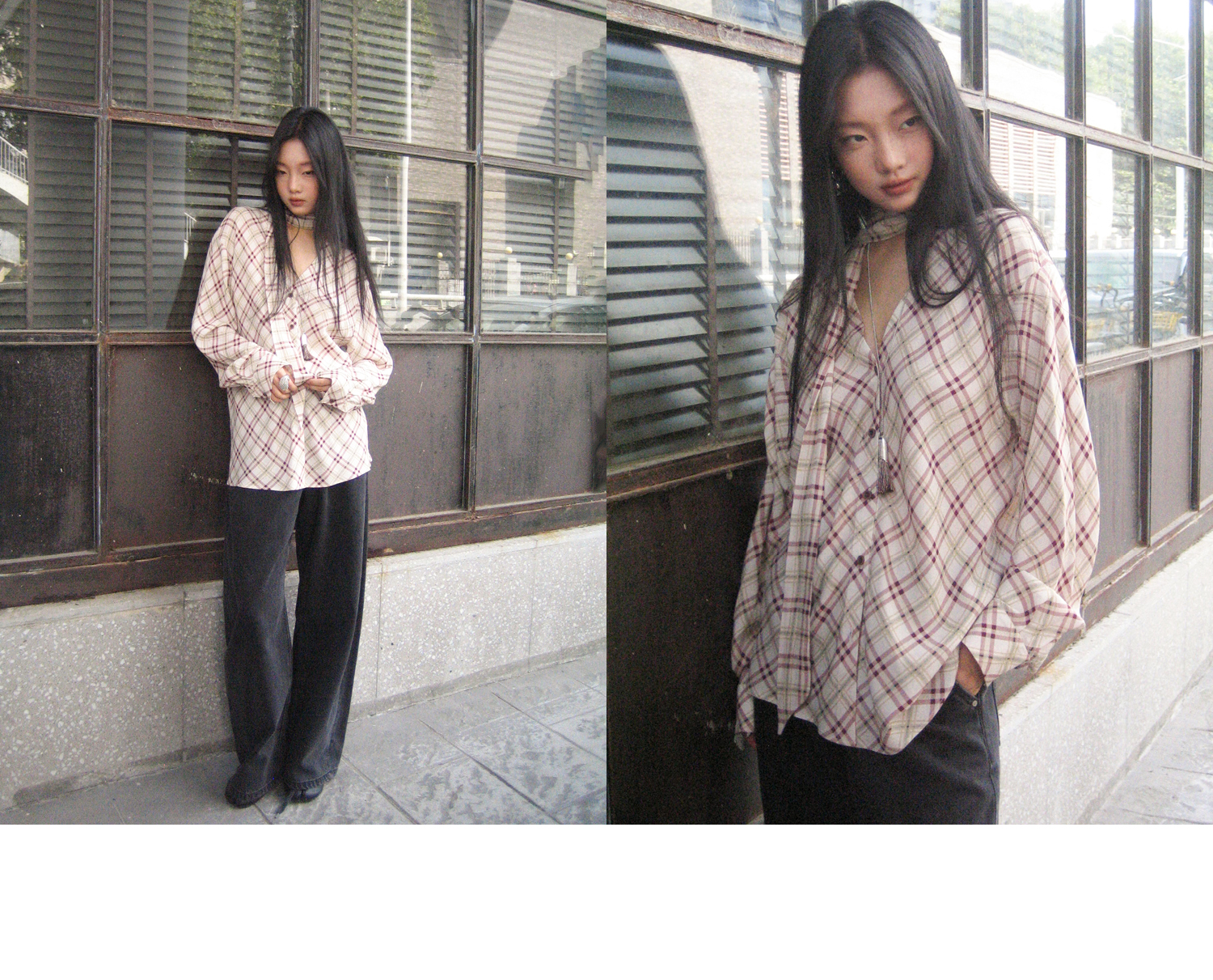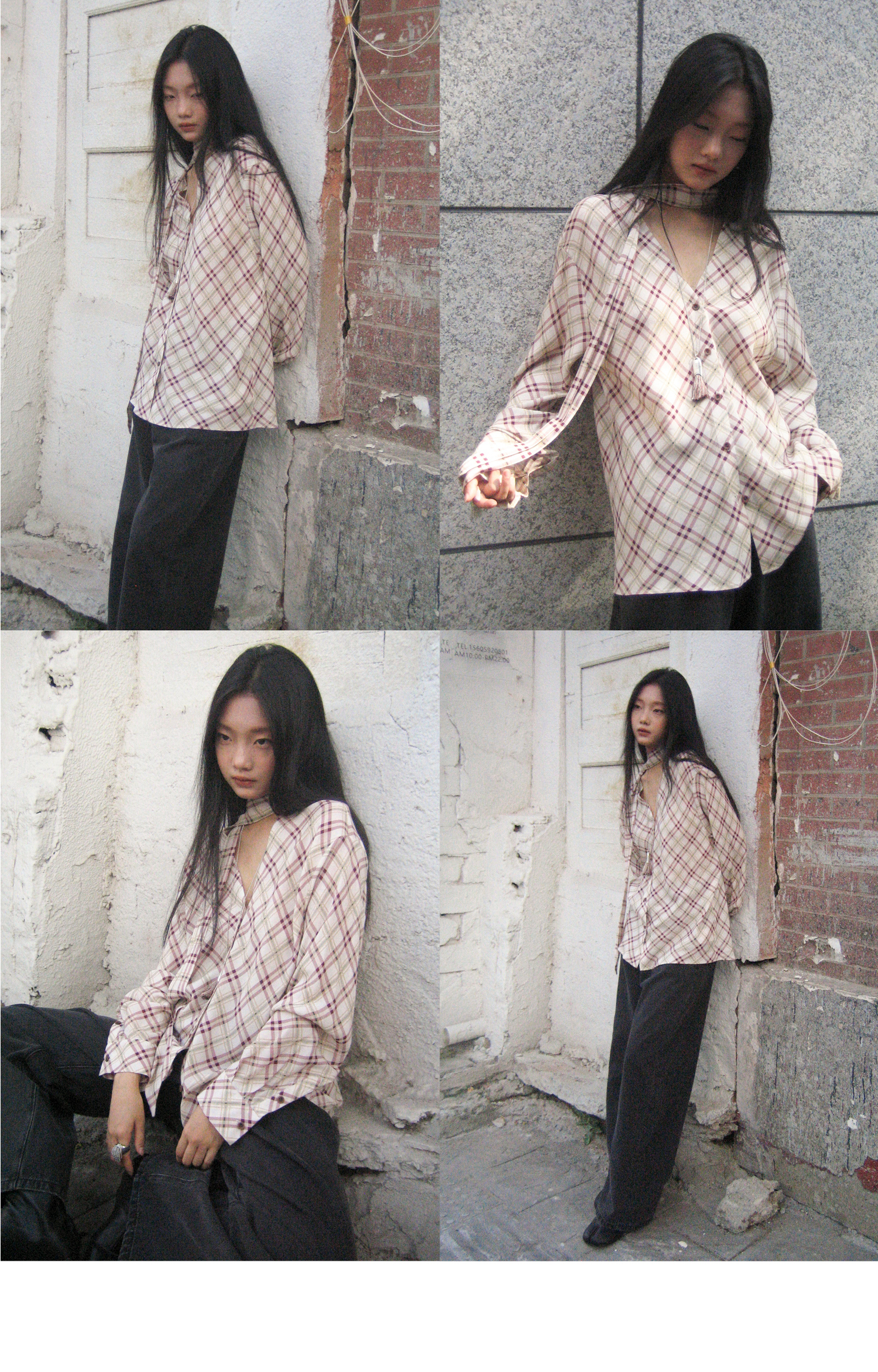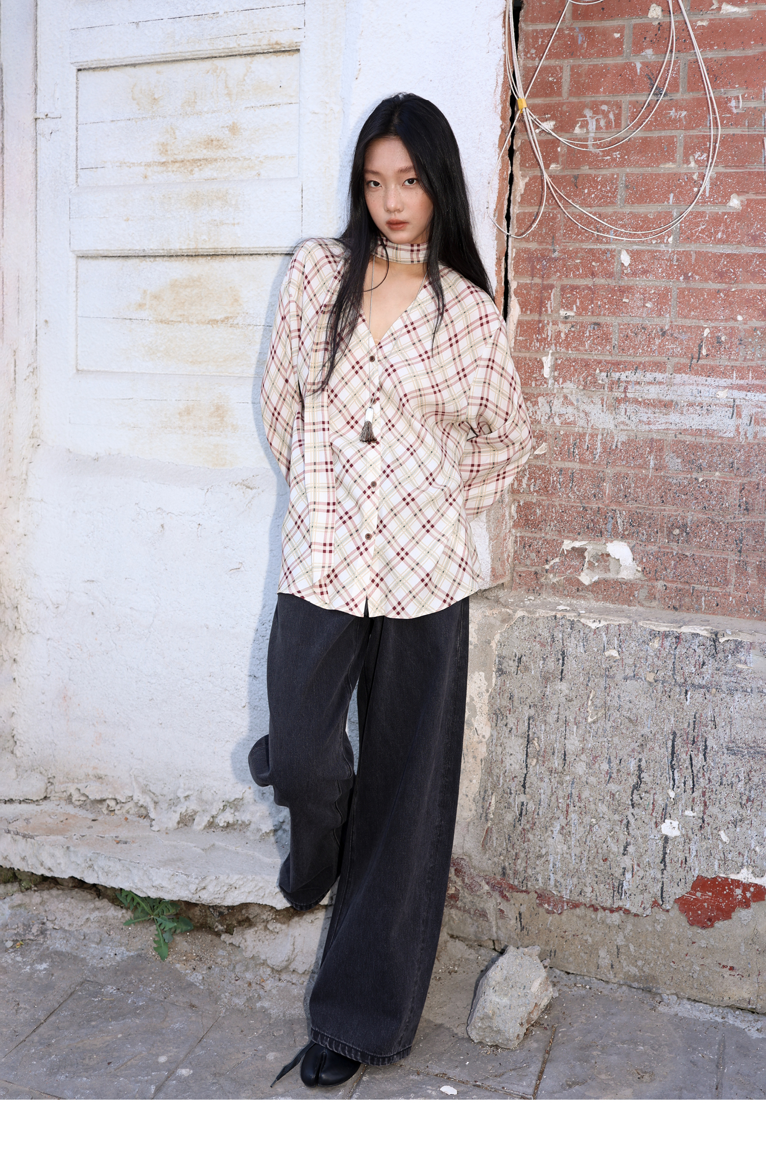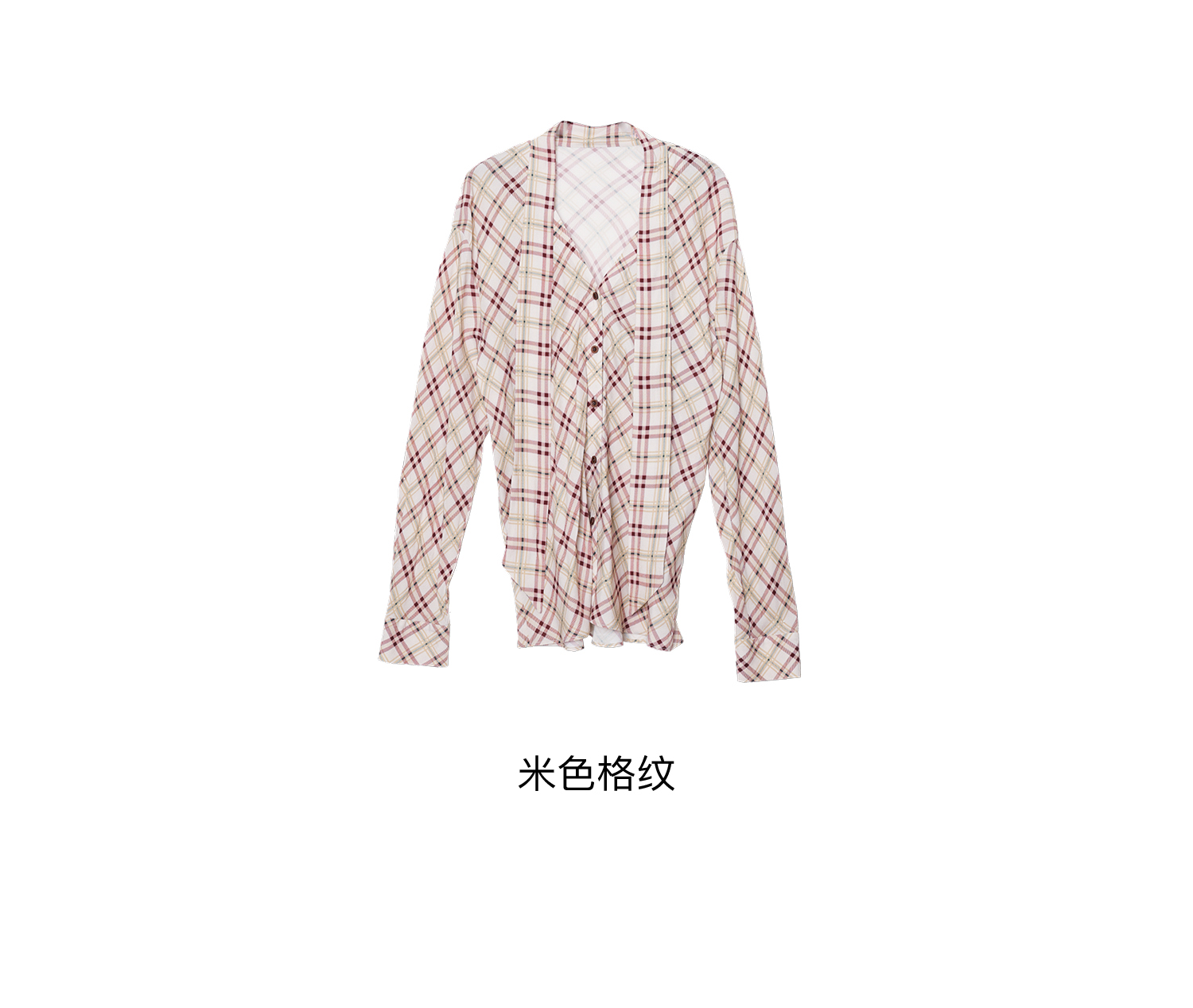 素舶 天丝轻盈柔顺雪纺格纹v领飘带设计感长袖衬衣