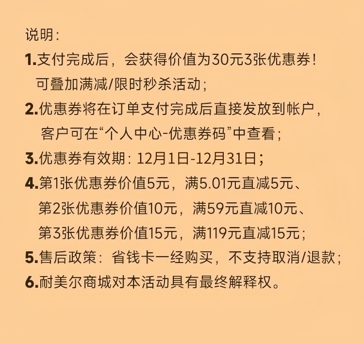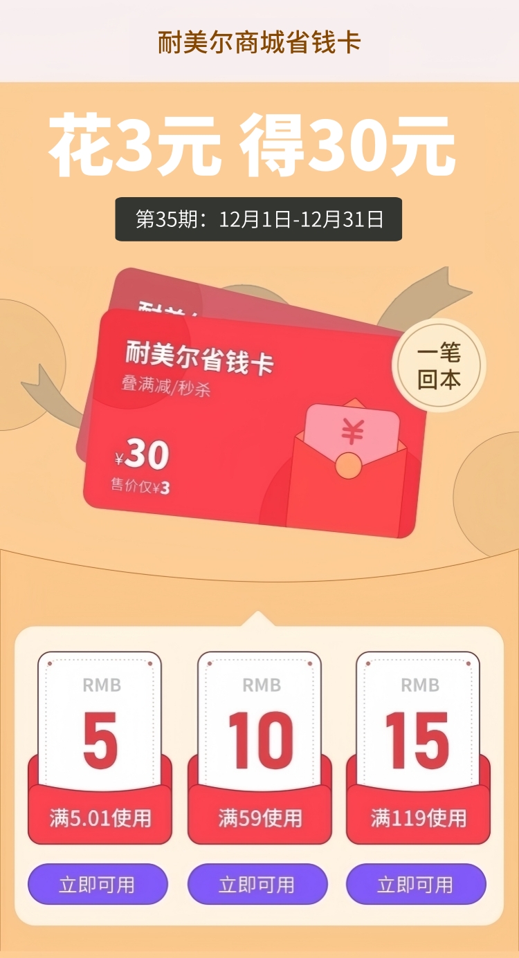 耐美尔商城省钱券包,花3元得30元