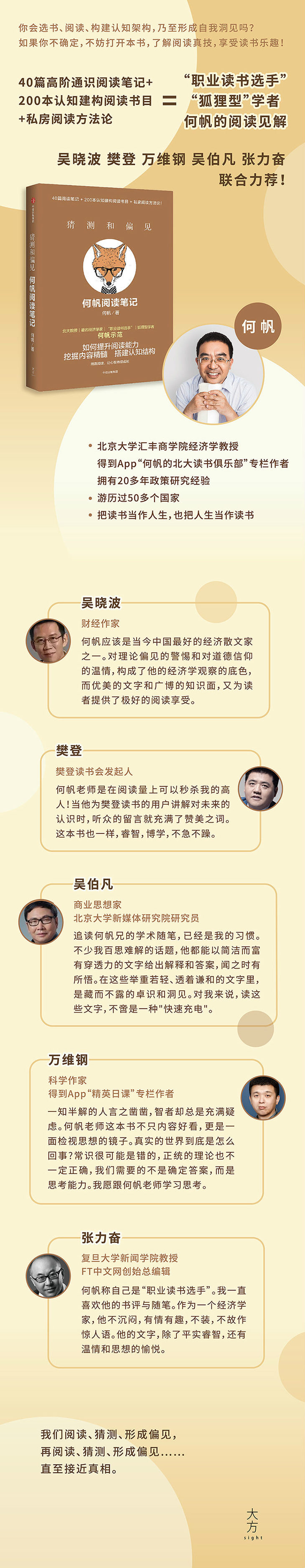何帆老师是在阅读量上可以秒杀我的高人!当他为樊登读书的用户讲解对未来的认识时,听众的留言就充满了赞美之词。这本书也一样,睿智,博学,不急不躁。 ——樊登 樊登读书会发起人