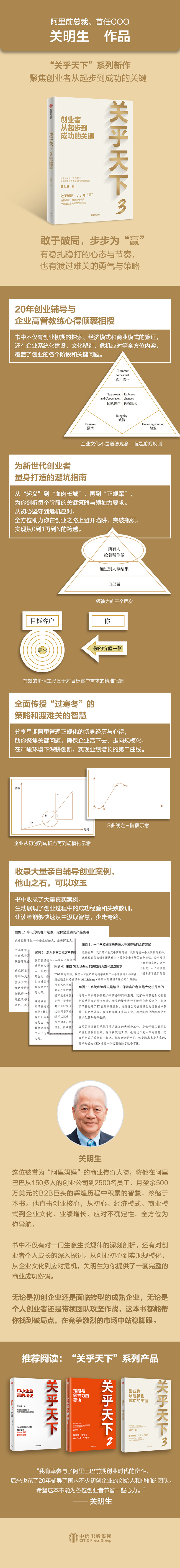 5.“关乎天下”系列荐:《关乎天下》讲中小企业赢的秘诀,阐述了企业经营管理的基本框架,并分享了阿里早年经营的故事,是一个企业经营的通识框架,面向广泛的商业管理者;《关乎天下2》讲策略与领袖力的要诀,是写给生意已有所成,但总觉“心累”和“身累”的中小企板们,如何通过他人拿结果,发展生意发展人;《关乎天下3》则是写给新世代的创业者们,帮助其建立稳扎稳打的心态与节奏,以及渡过难关的勇气与策略。无论你是处于从0到1的起心动念阶段,还是处于从1到3的规模化困顿期,无论你是自己单枪匹马开始创业,还是正带领团队为上规模攻坚作战,都能从这本书中获得一位创业先行者的经验分享。