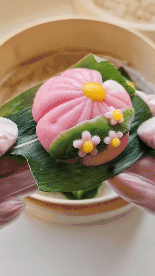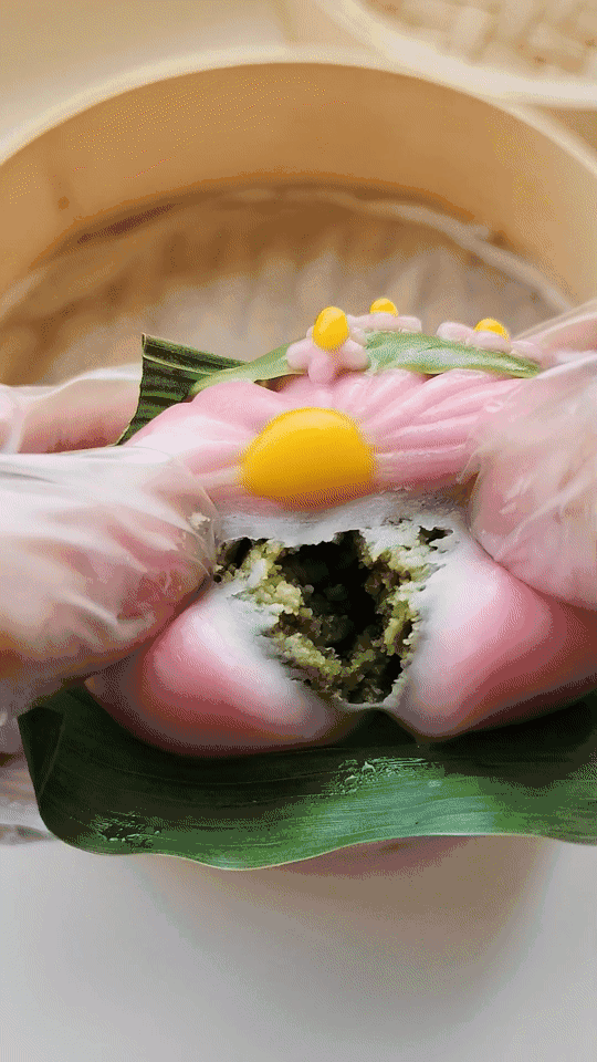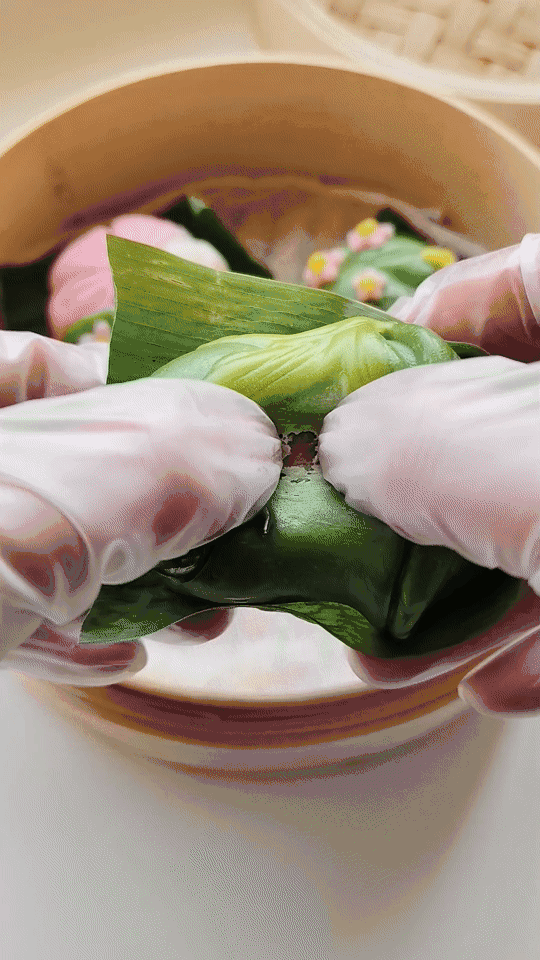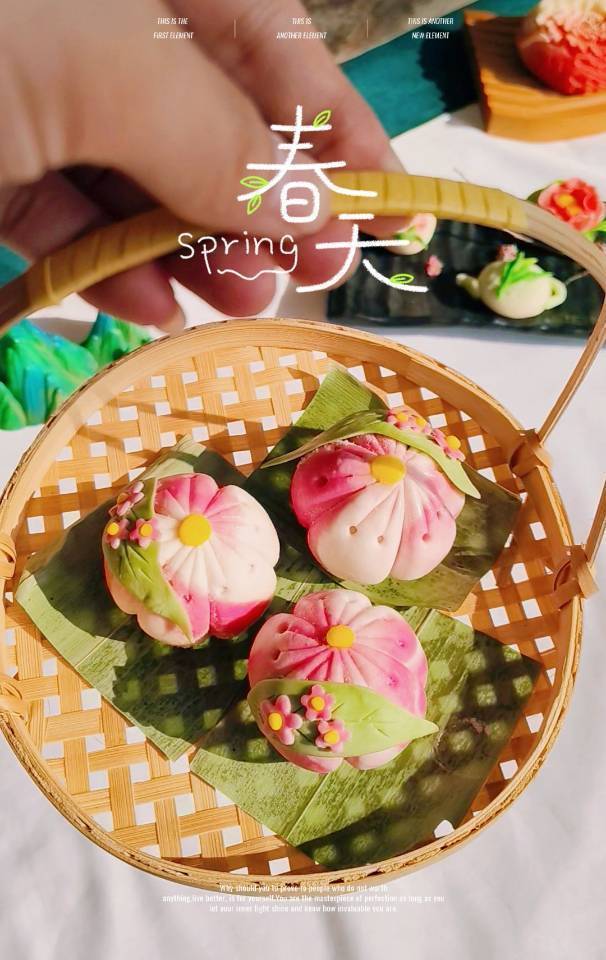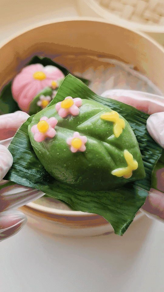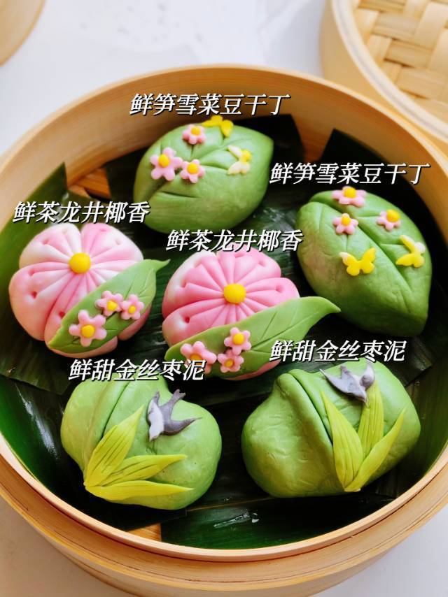 【口味】:鲜茶龙井椰香馅(桃花形状)/鲜甜金丝枣泥馅(竹子形状)/鲜笋雪菜香干馅(叶子形状)各*2枚