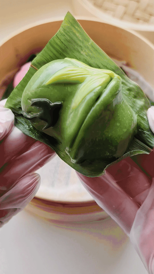 先把水煮开,水开后,中小火,上汽蒸8-10分钟,蒸完后可以表面刷层素油,保持不结皮(0添加,新鲜艾草制皮)