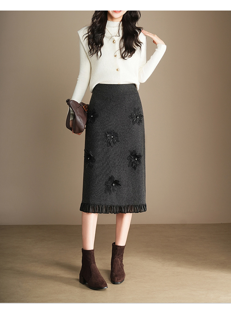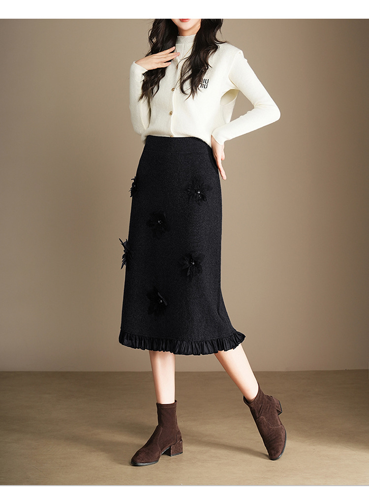 YGLR-A071-Y时尚花边+手工花半身裙高腰包臀裙中长款针织毛线裙包臀裙 商品图1