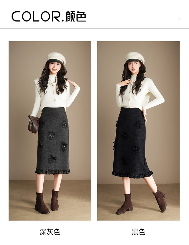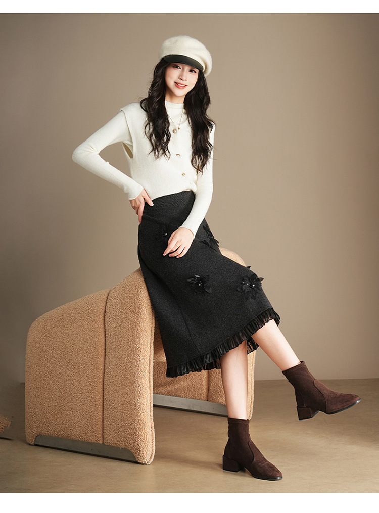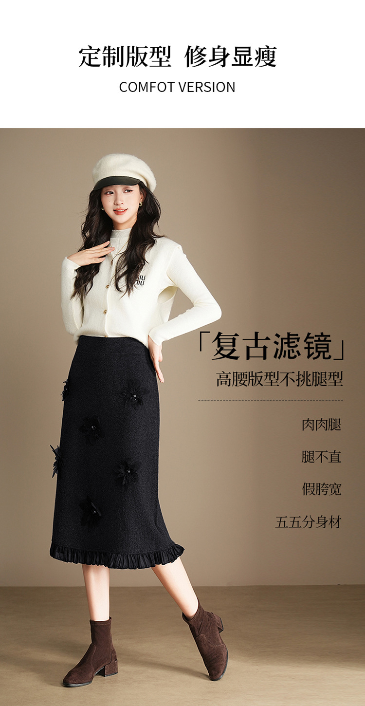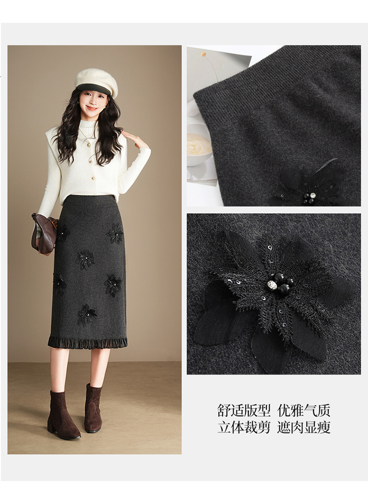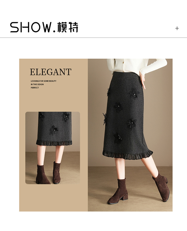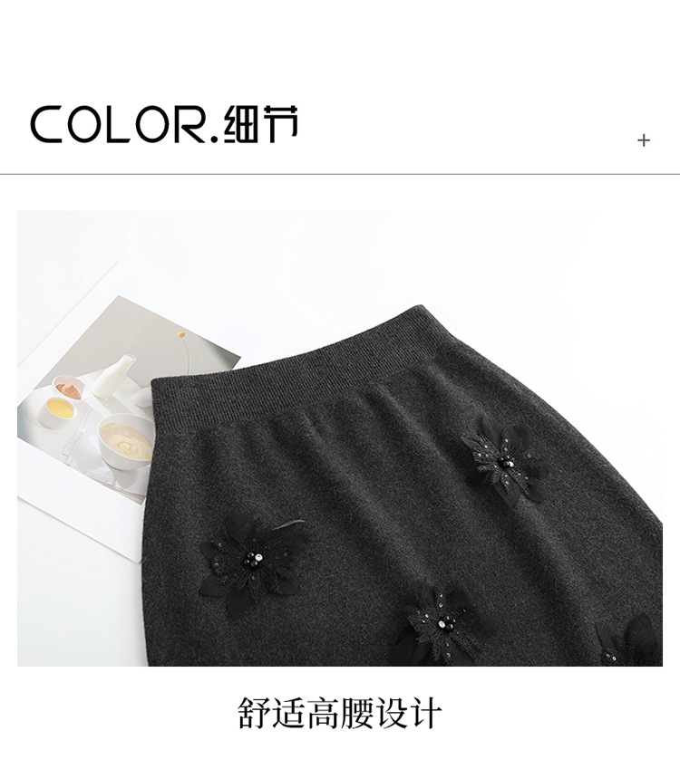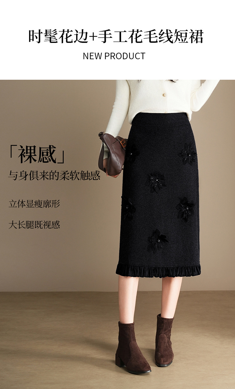 YGLR-A071-Y时尚花边+手工花半身裙高腰包臀裙中长款针织毛线裙包臀裙 商品图4