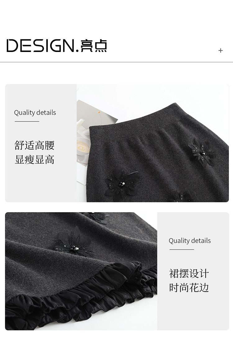 YGLR-A071-Y时尚花边+手工花半身裙高腰包臀裙中长款针织毛线裙包臀裙 商品图3