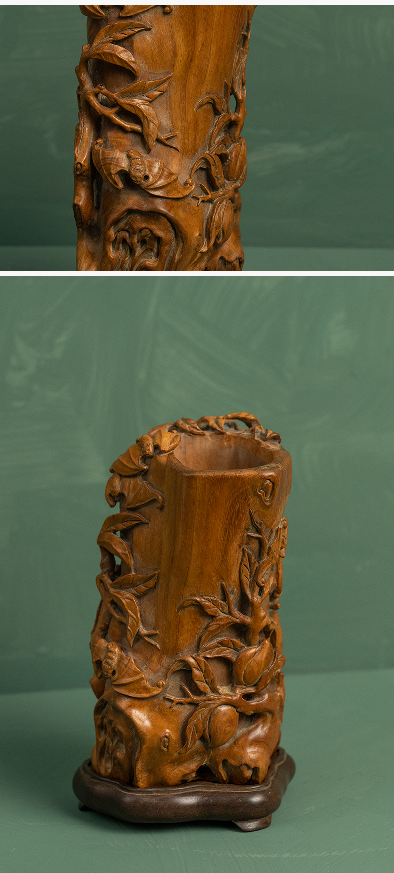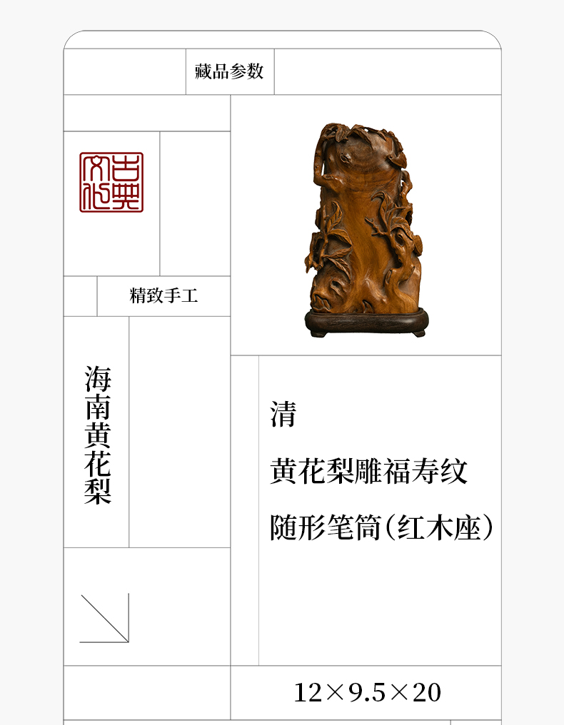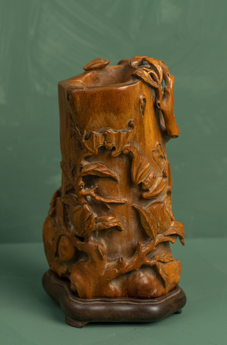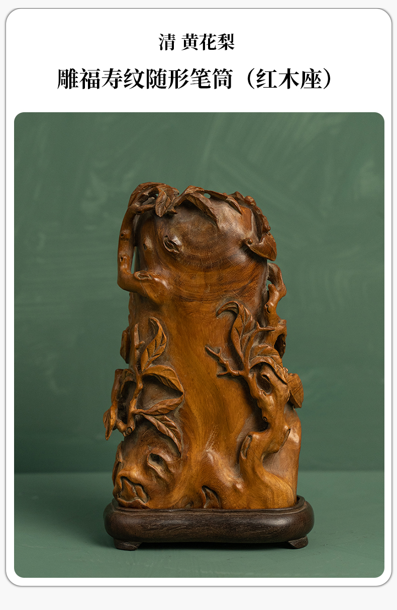 清 黄花梨雕福寿纹随形笔筒(红木座)