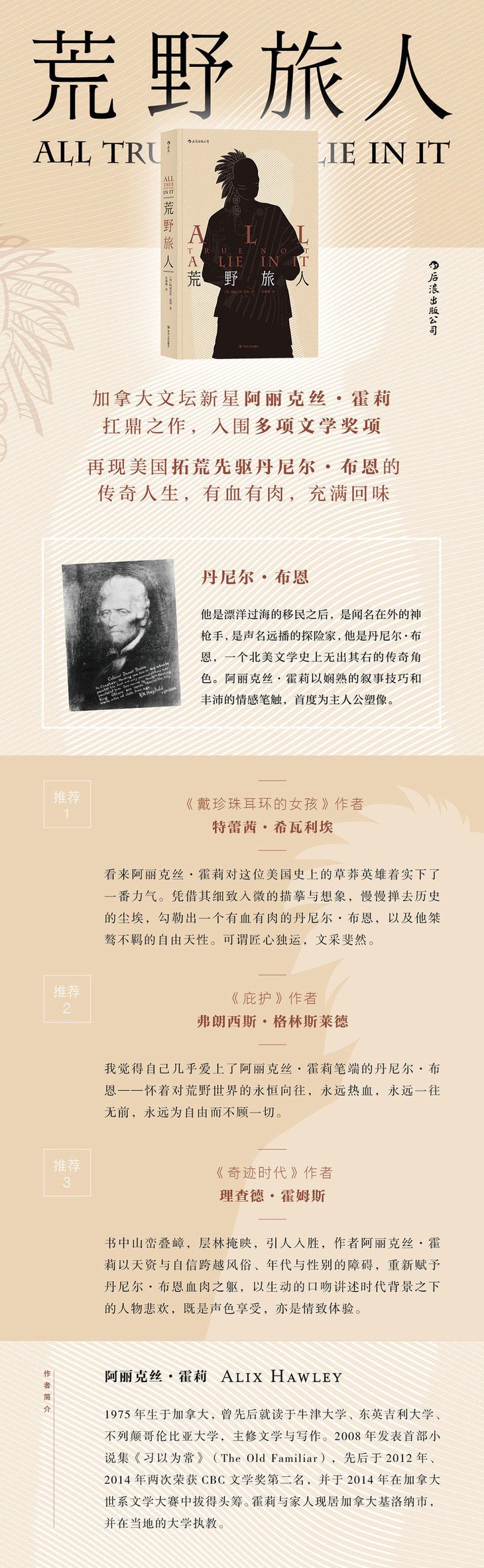 他是丹尼尔·布恩,一个北美文学史上无出其右的传奇角色。阿丽克丝·霍莉以娴熟的叙事技巧和丰沛的情感笔触,以本书故事,首度为主人公塑像。