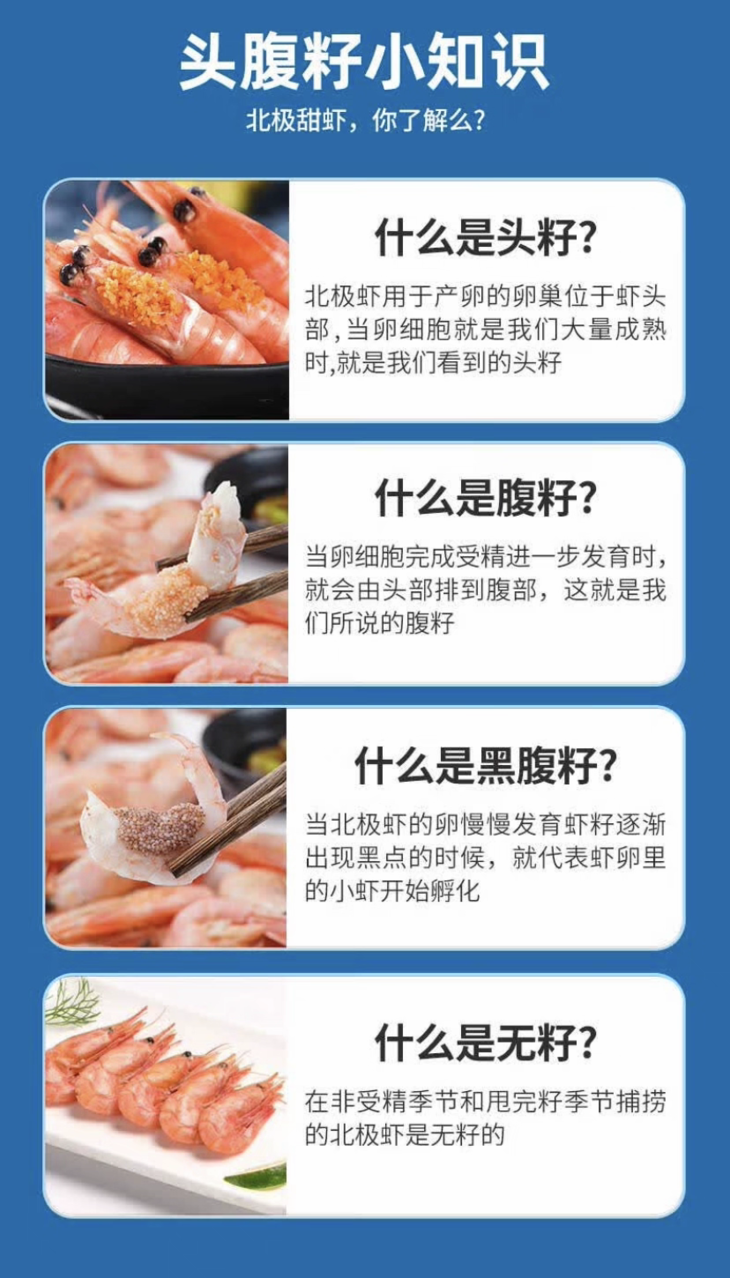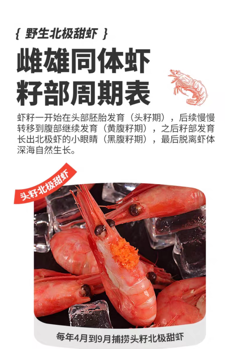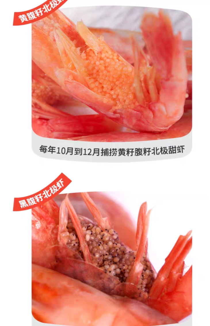 北极甜虾在不同的时期分为无籽,头籽(头籽也叫虾膏,已发育但尚未排出的虾卵)和腹籽(受精后的卵,腹籽分红腹籽和黑腹籽)三种。头籽收到后后会存在少量腹籽,属于正常情况,介意者慎拍。如遇大比例腹籽,拍照联系客户反馈处理。