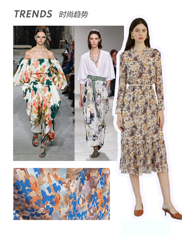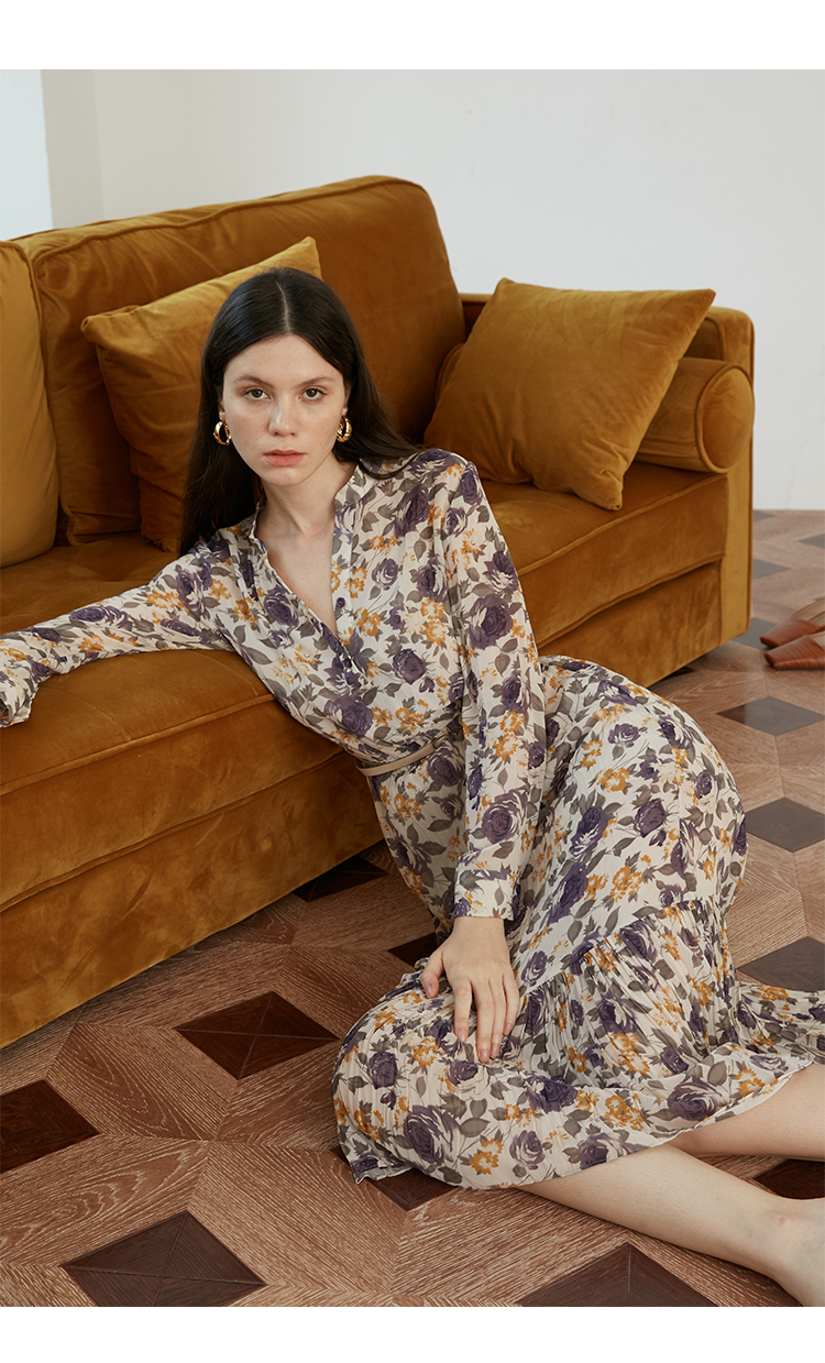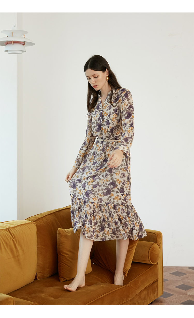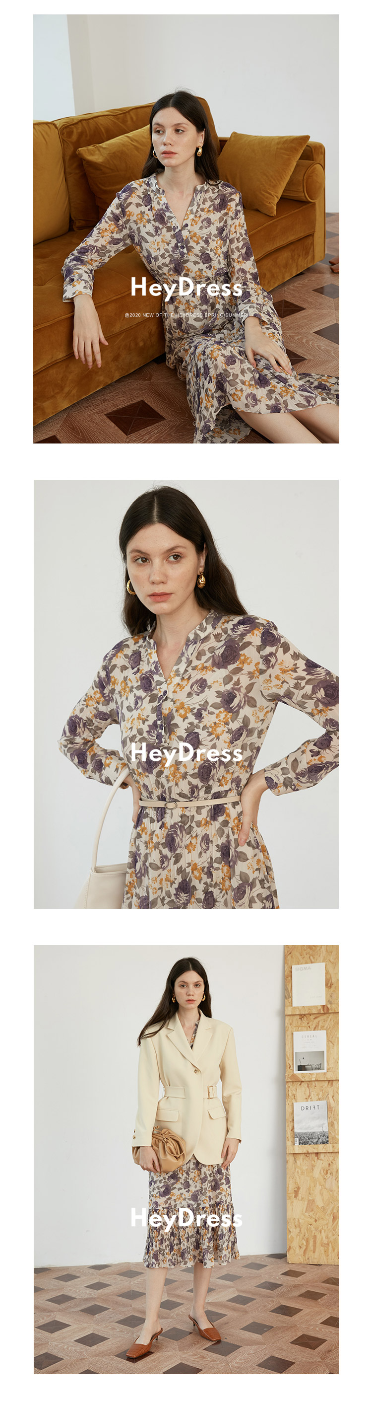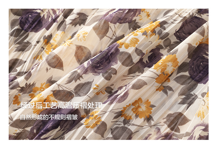 穿上碎花裙的你,自有风情! 干净清新的奶油底色, 晕染蔓延出层层墨韵般黄紫色的花影 柔和自然蜷蜷温柔, 浪漫的要掐出水来。 大面积的花色使用隐隐绰绰, 别有一番艺术情绪, 斑斓的色彩及褶皱肌理的叠加, 上身一刻很美! 整体气质偏向轻熟一些的风格, 恬淡幽静,朦胧的文艺美感一触即发。 初秋的轻盈浪漫体现的恰到好处~ 予生命一身温柔的想象,出片率很高哦。