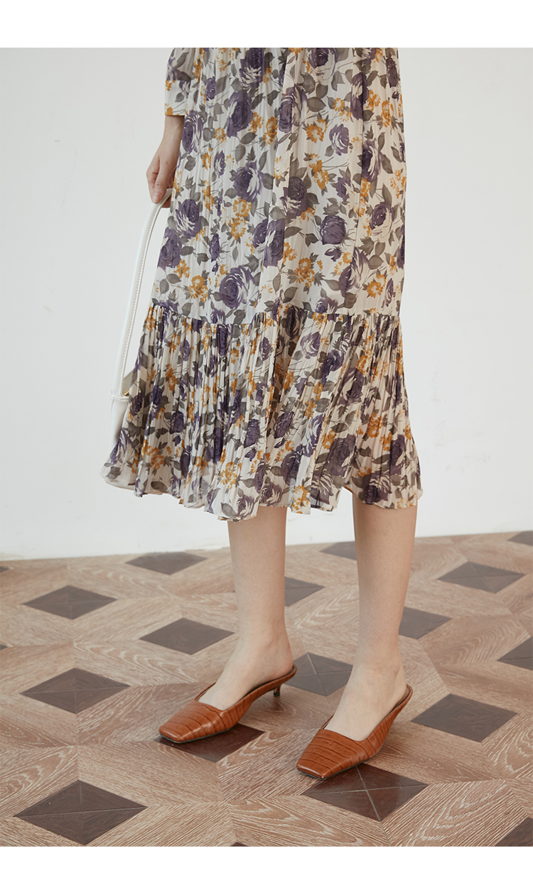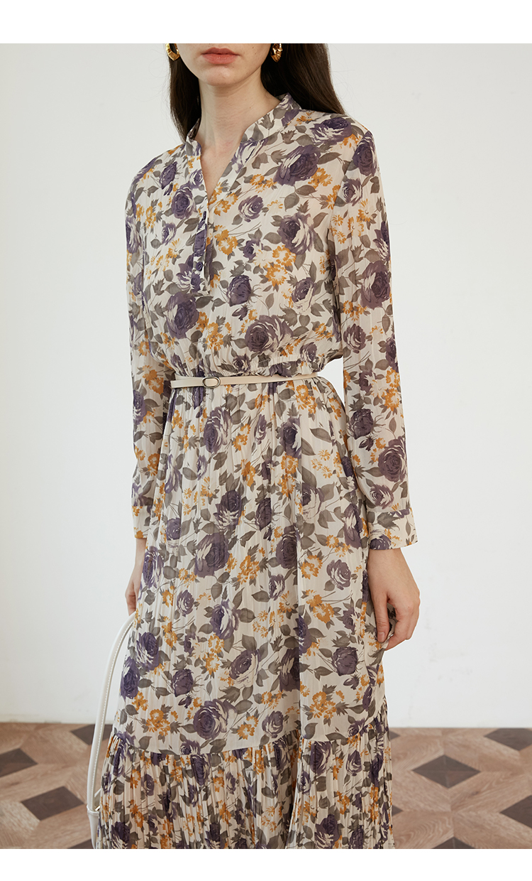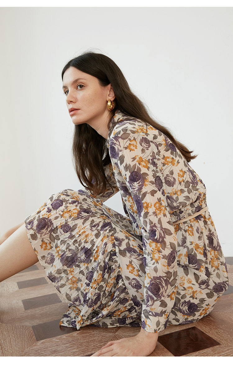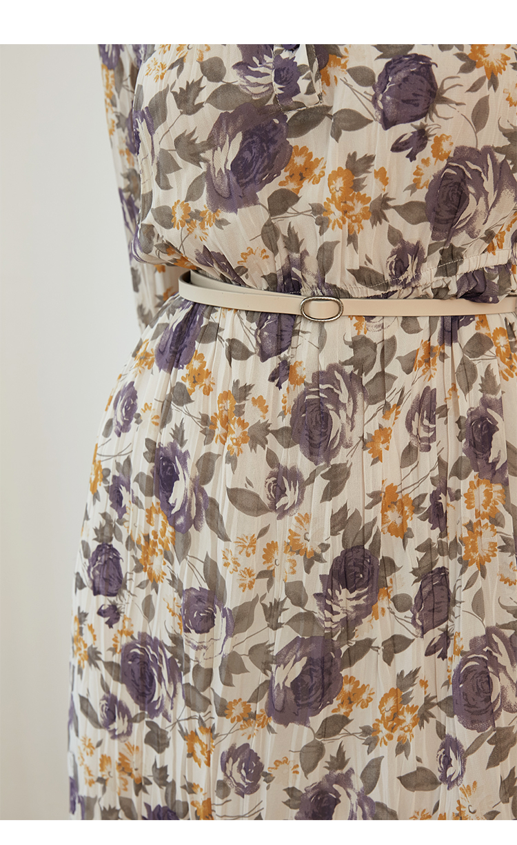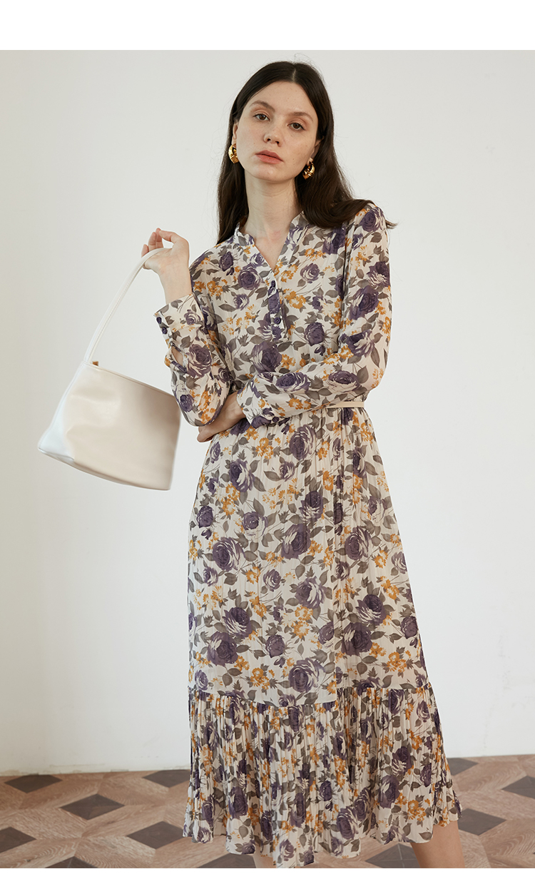 穿上碎花裙的你,自有风情! 干净清新的奶油底色, 晕染蔓延出层层墨韵般黄紫色的花影 柔和自然蜷蜷温柔, 浪漫的要掐出水来。 大面积的花色使用隐隐绰绰, 别有一番艺术情绪, 斑斓的色彩及褶皱肌理的叠加, 上身一刻很美! 整体气质偏向轻熟一些的风格, 恬淡幽静,朦胧的文艺美感一触即发。 初秋的轻盈浪漫体现的恰到好处~ 予生命一身温柔的想象,出片率很高哦。