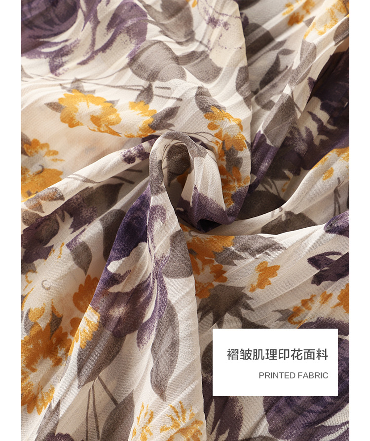 面料成分/Composition 面料名称:褶皱肌理印花雪纺面料 面料成分:100%聚酯纤维 |