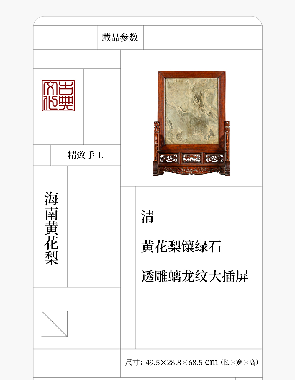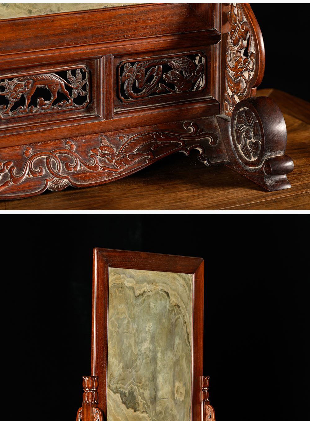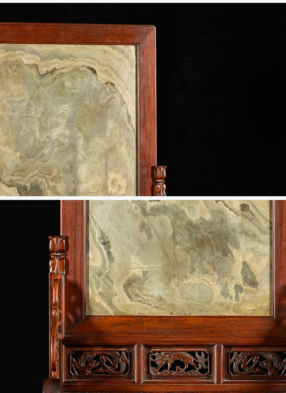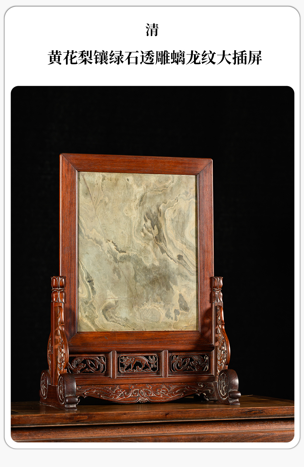 清 黄花梨镶绿石透雕螭龙纹大插屏