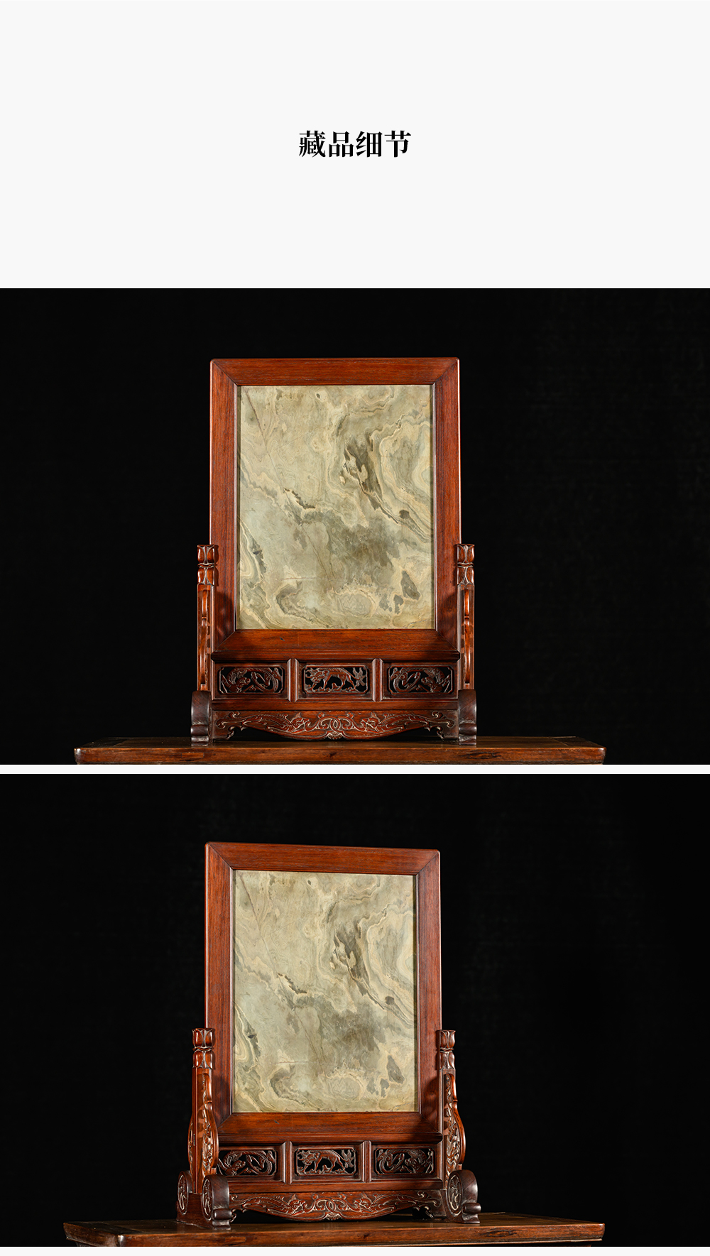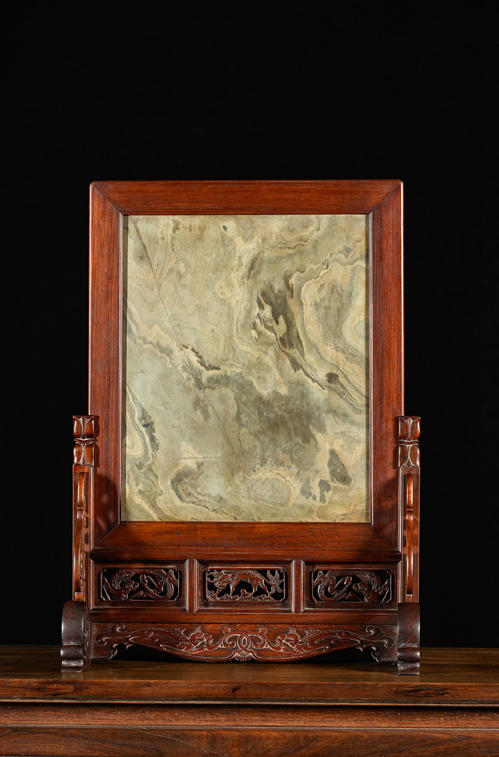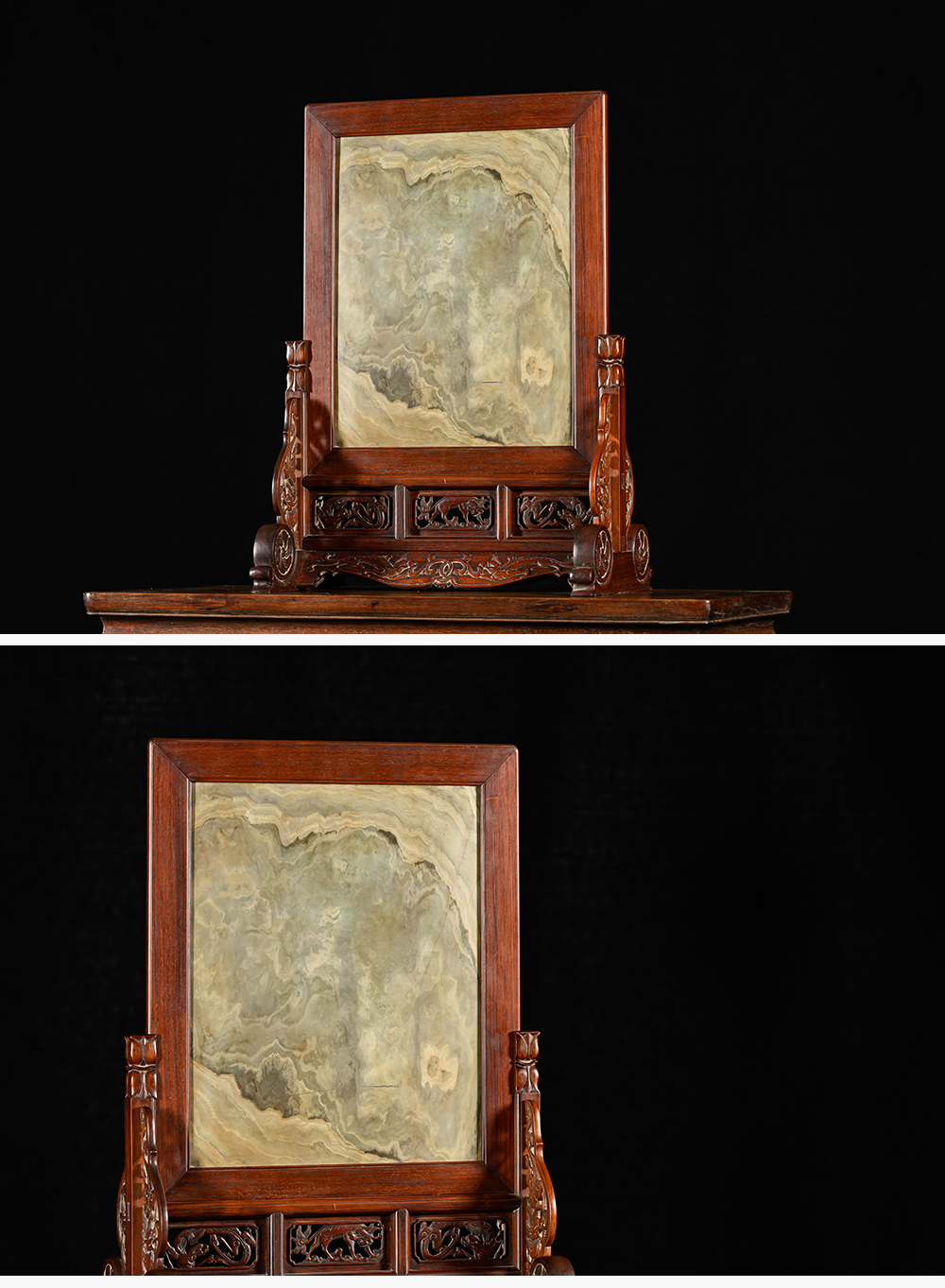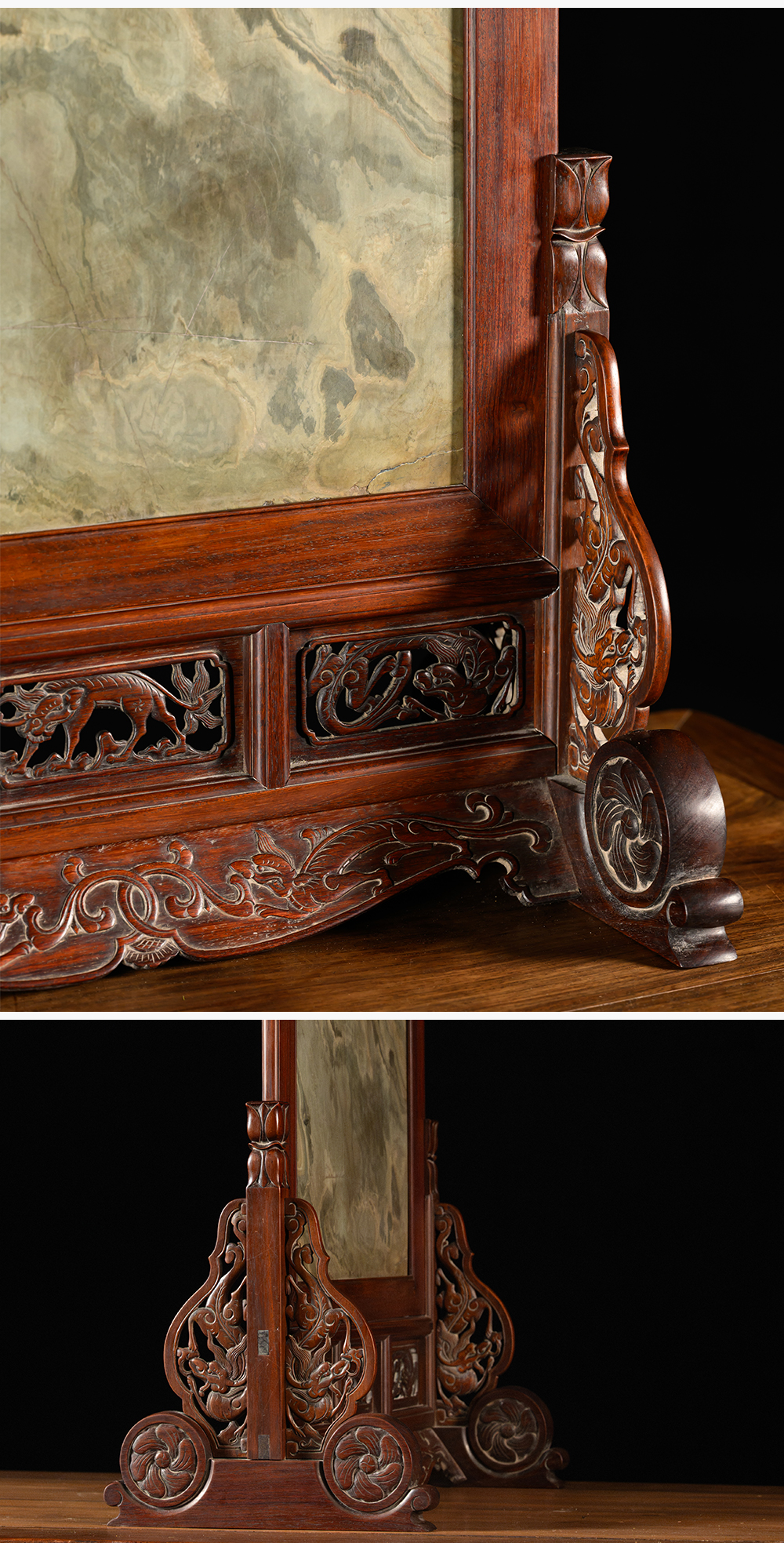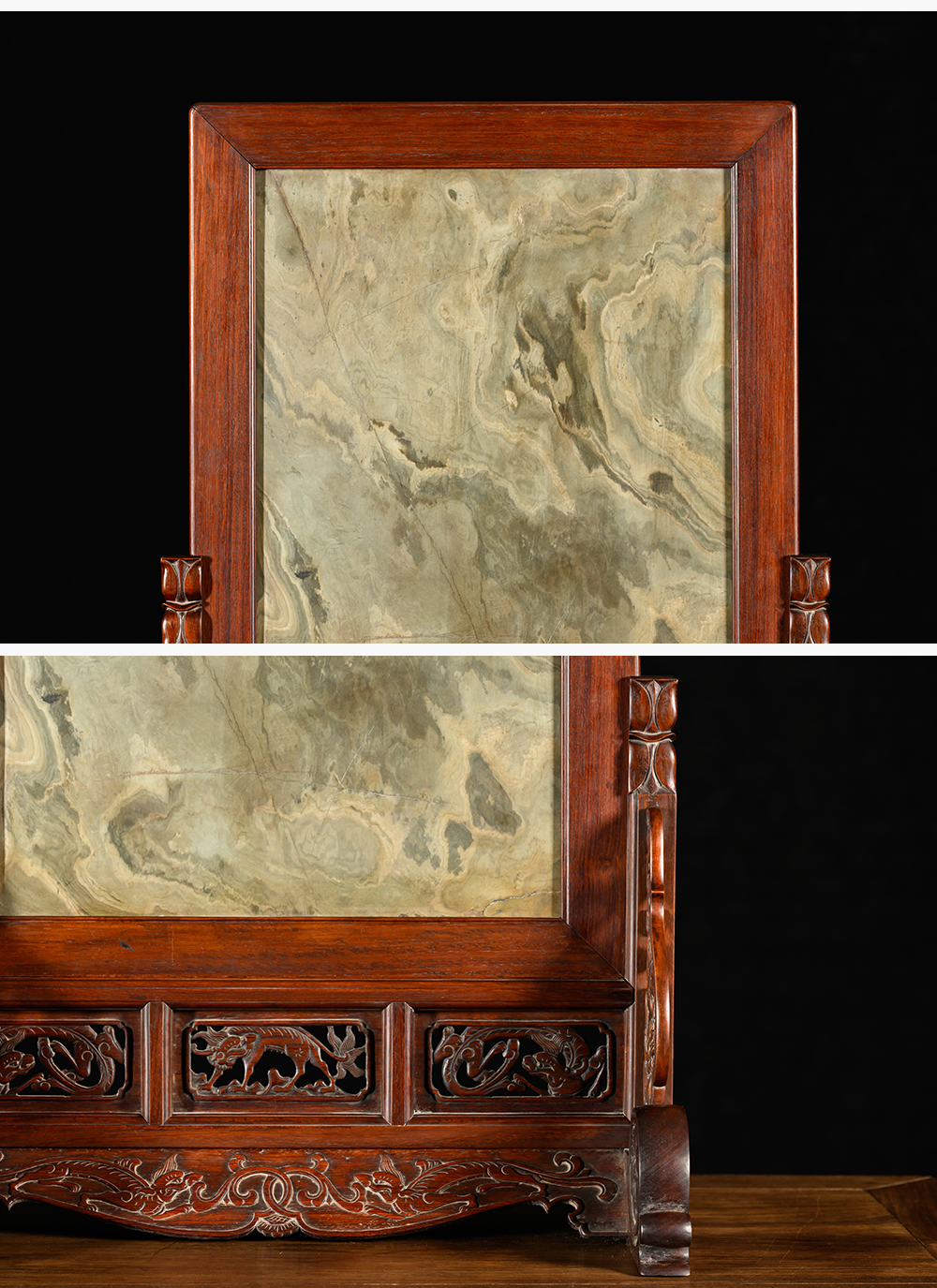 清 黄花梨镶绿石透雕螭龙纹大插屏