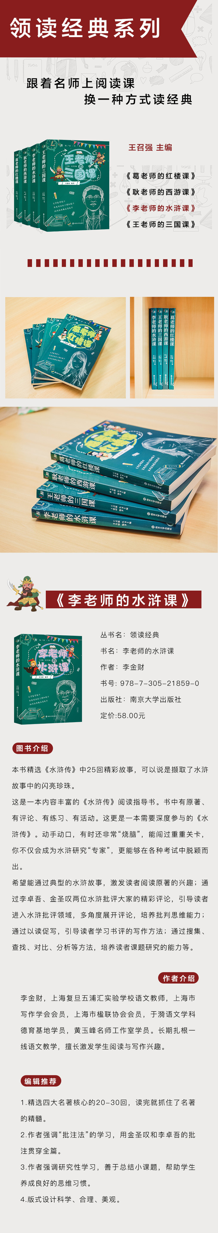 希望能通过典型的水浒故事,激发读者阅读原著的兴趣;通过李卓吾、金圣叹两位水浒批评大家的精彩评论,引导读者进入水浒批评领域,多角度展开评论,培养批判思维能力;通过以读促写,引导读者学习书评的写作方法;通过搜集、查找、对比、分析等方法,培养读者课题研究的能力等。