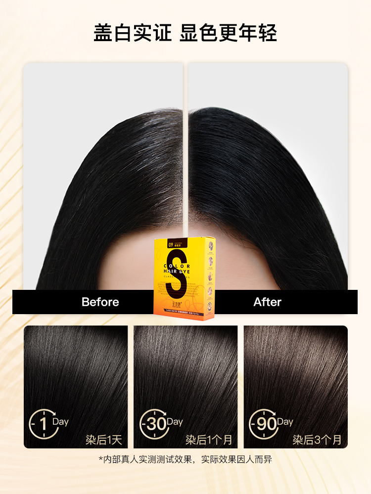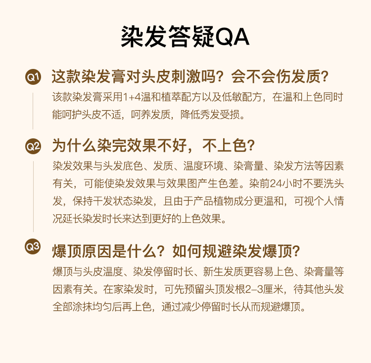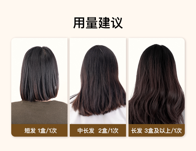 因染发剂上色温和,为避免用量不够导致不上色或上色不满意,建议头发多的增加一盒,也可以加长染发时间,不可按照理发店的标准来使用剂量。