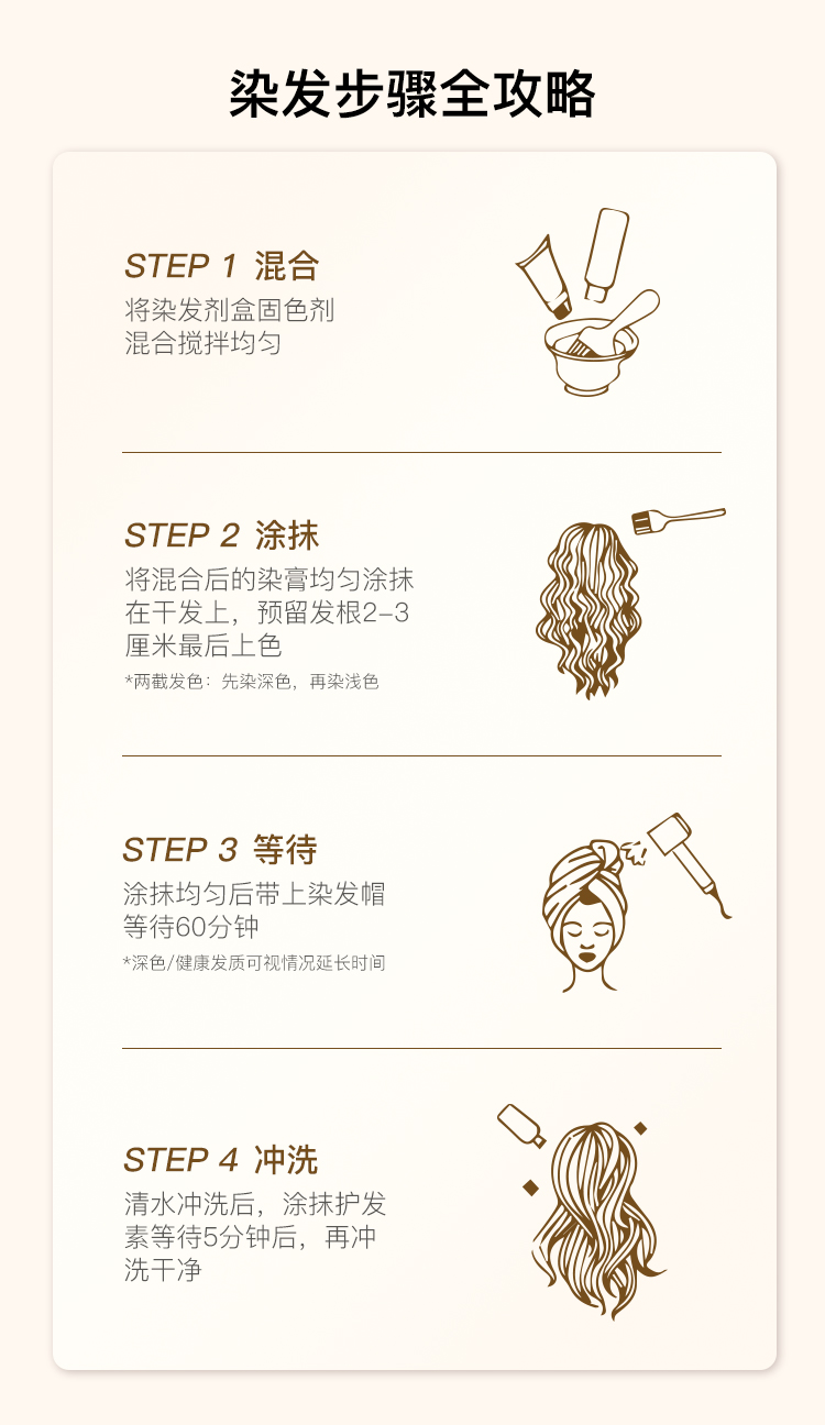 注意:染发剂的成分是相当安全的,但因人而异,不排除敏感体质会有对某种成分产生过敏哦,使用之前可以在耳后涂抹少量染发剂做下过敏测试。