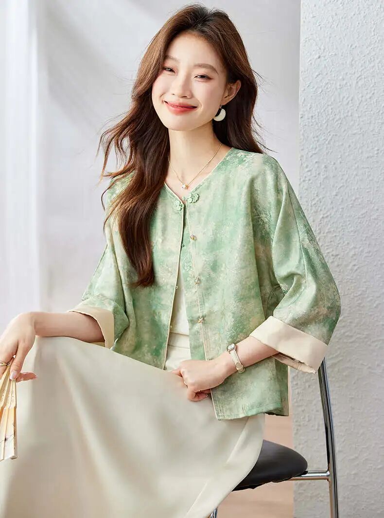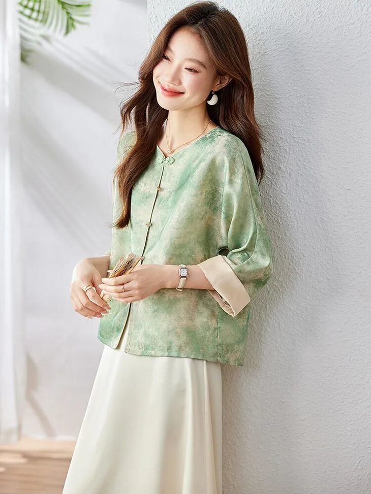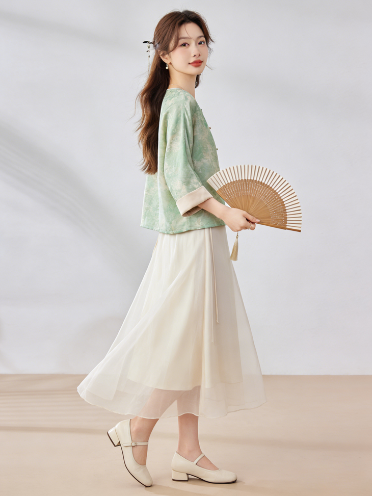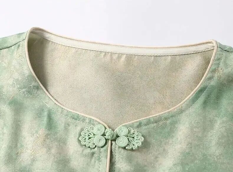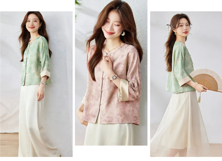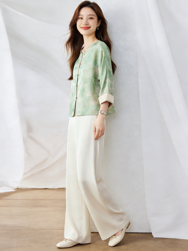 新中式晕染盘扣上衣,清透豆绿与温柔豆沙粉两大配色,
