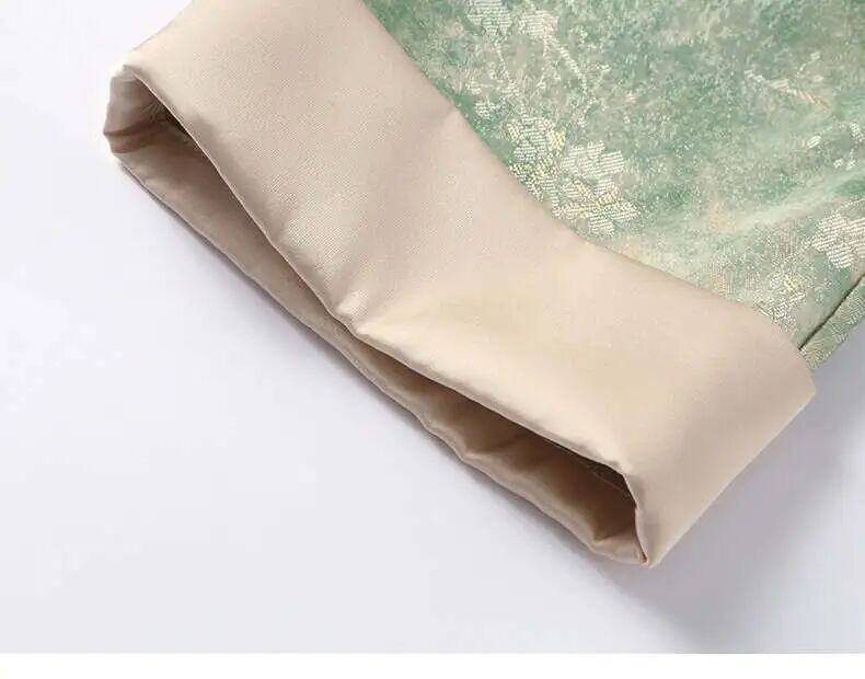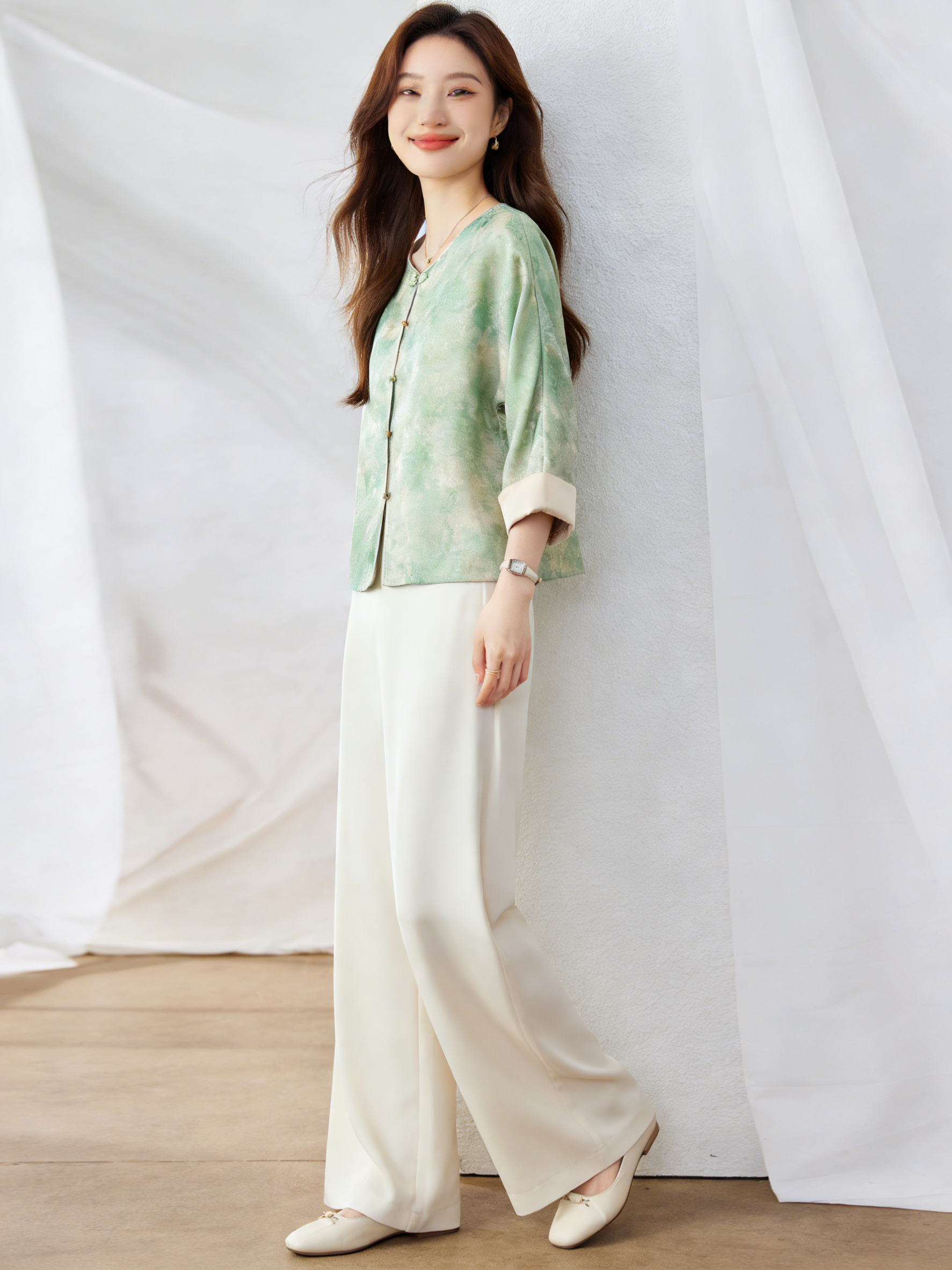 低饱和豆绿色调,像春日刚抽芽的草木,带着朦胧晕染的水墨纹理,深浅渐变自然,温柔又显白,黄皮、黑皮都能轻松驾驭,穿上瞬间自带「降温滤镜」。