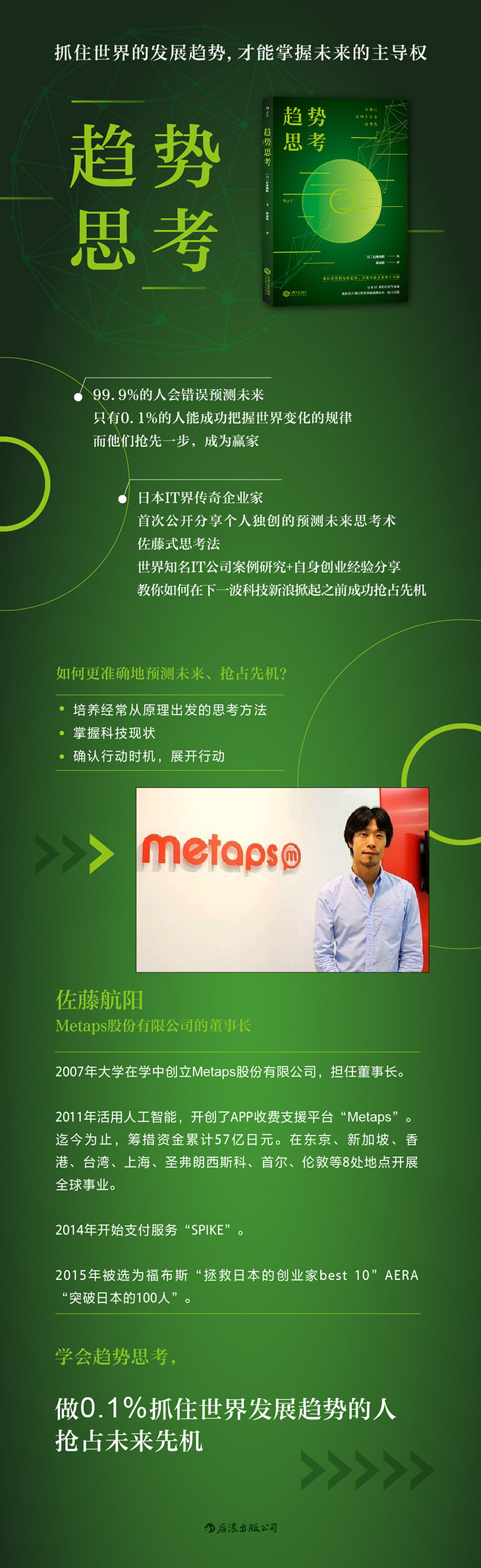 本书作者佐藤航阳,曾一手打造日本IT界传奇公司——Metaps,并开展了全球性事业。在这本书中,作者从科技、国家等几个方面出发,分析应该如何识别社会的发展规律。并且深入分析了全世界知名IT公司案例,结合个人亲身的创业经验,提出了一套能够预测未来的具有普遍性的思考体系,告诉读者如何用线来思考并理解社会变化的原理与原则。书中更有作者独特的“佐藤式思考法”,让你能够从瞬息万变的科技变动中看出未来的方向,抢占先机!