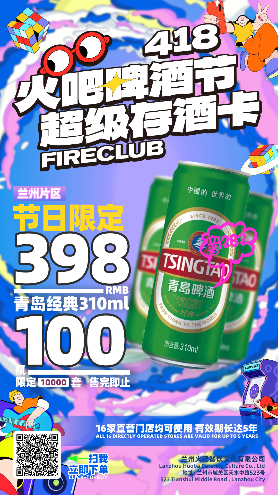 【兰州通用】4月8日火吧啤酒节—超值存酒卡—398元100瓶青岛经典310ml听装