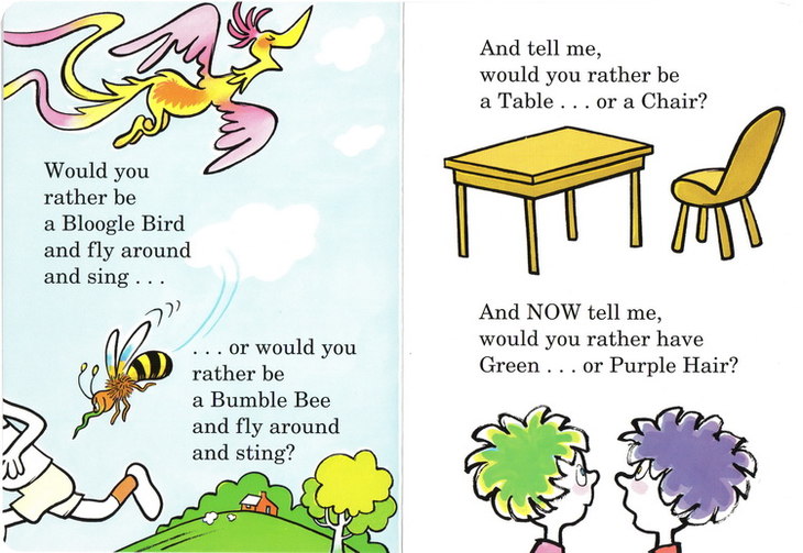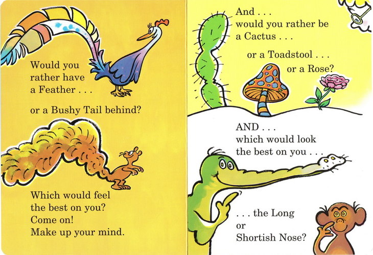 Would you rather be a clarinet . . . a trombone . . . or a drum? (How would you like to have someone going boom-boom on your tum?) Beginning readers are asked to ponder these–and a host of other odd choices–in this charming, provocative book by Dr. Seuss that encourages children to let their imaginations fly.