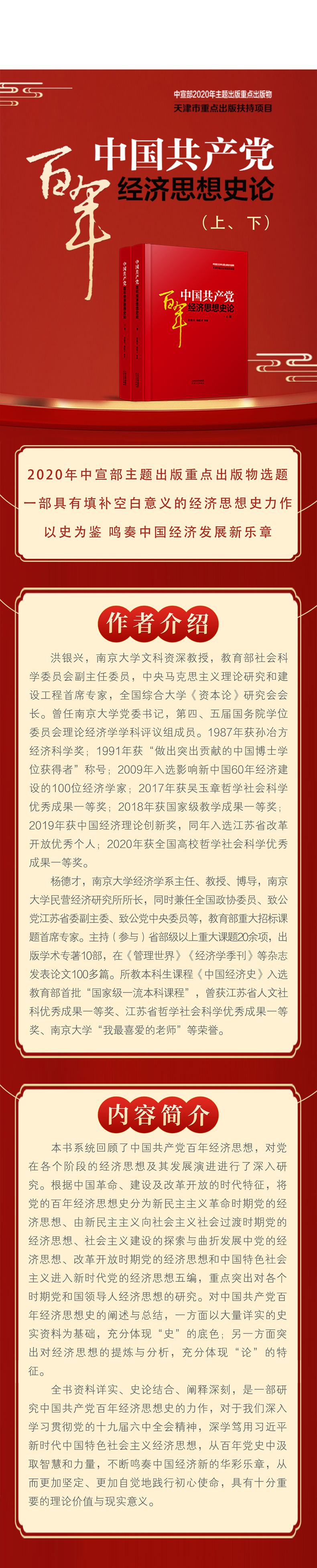 本书视角宏阔、论理扎实、结构严密,全景式地呈现了百年来中国共产党经不断探索所取得的丰富的、独有的经济思想。既有助于形成中国特色、中国风格、中国气派的中国特色社会主义政治经济学,又可为其他发展中国家探索经济发展之路贡献中国智慧。相信出版后会受到理论界、政策研究界人士的广泛关注与重视。