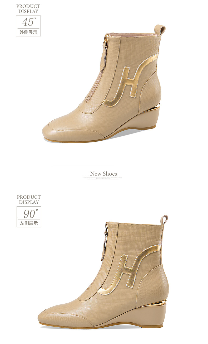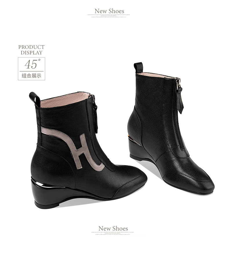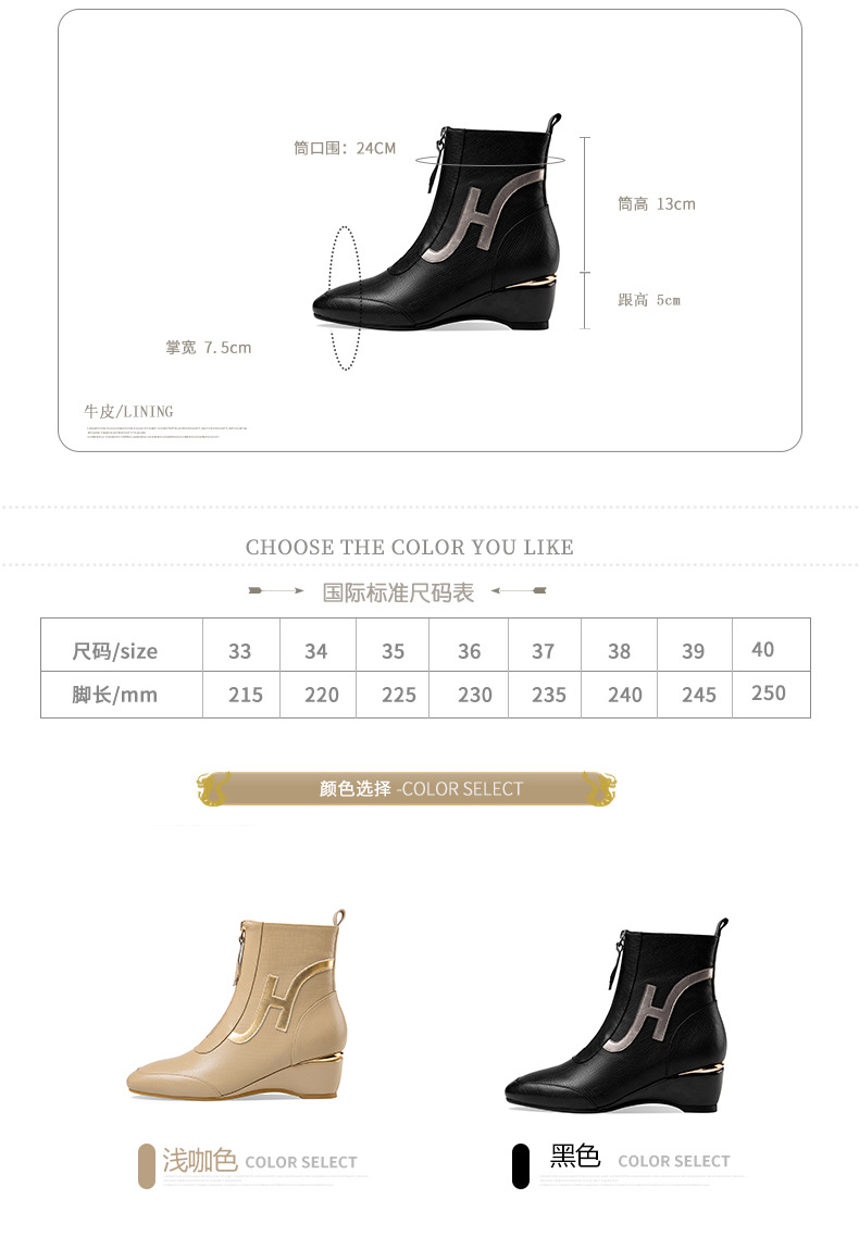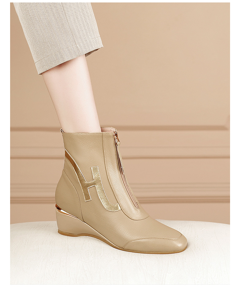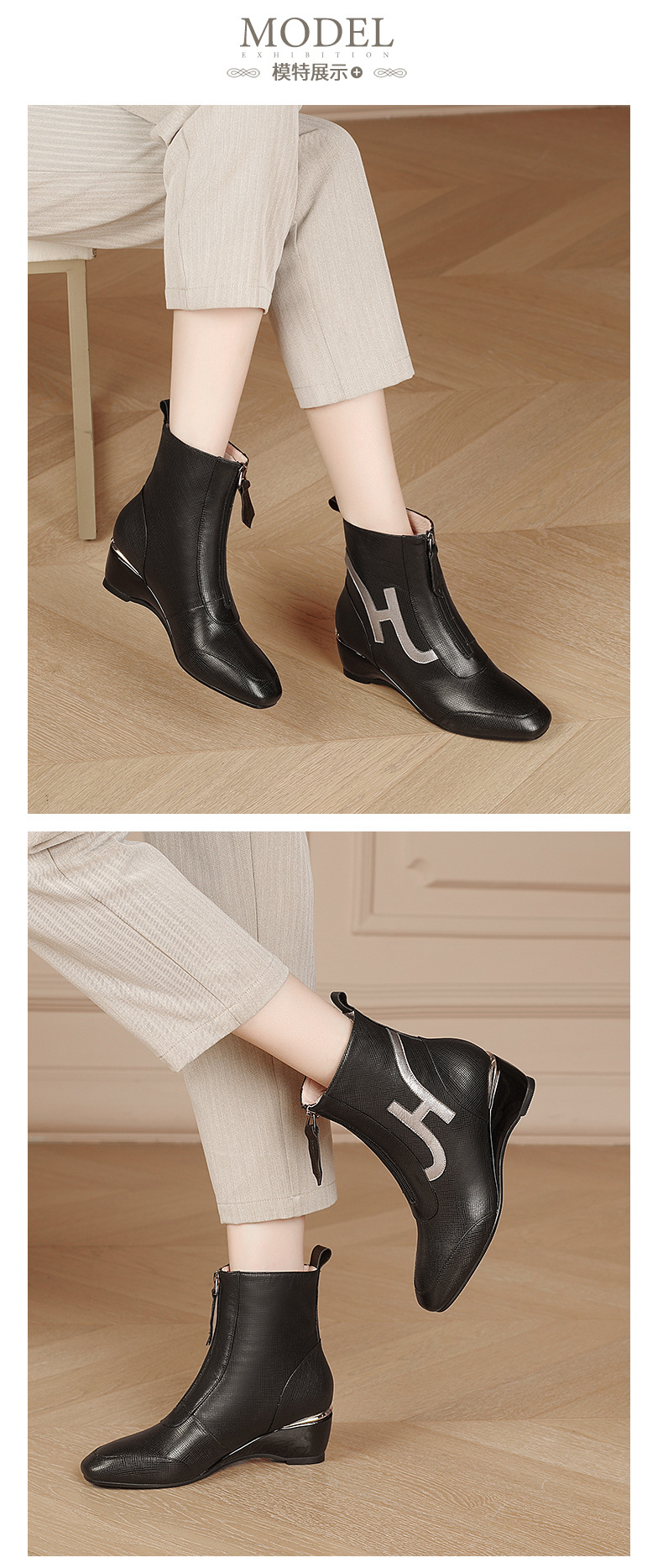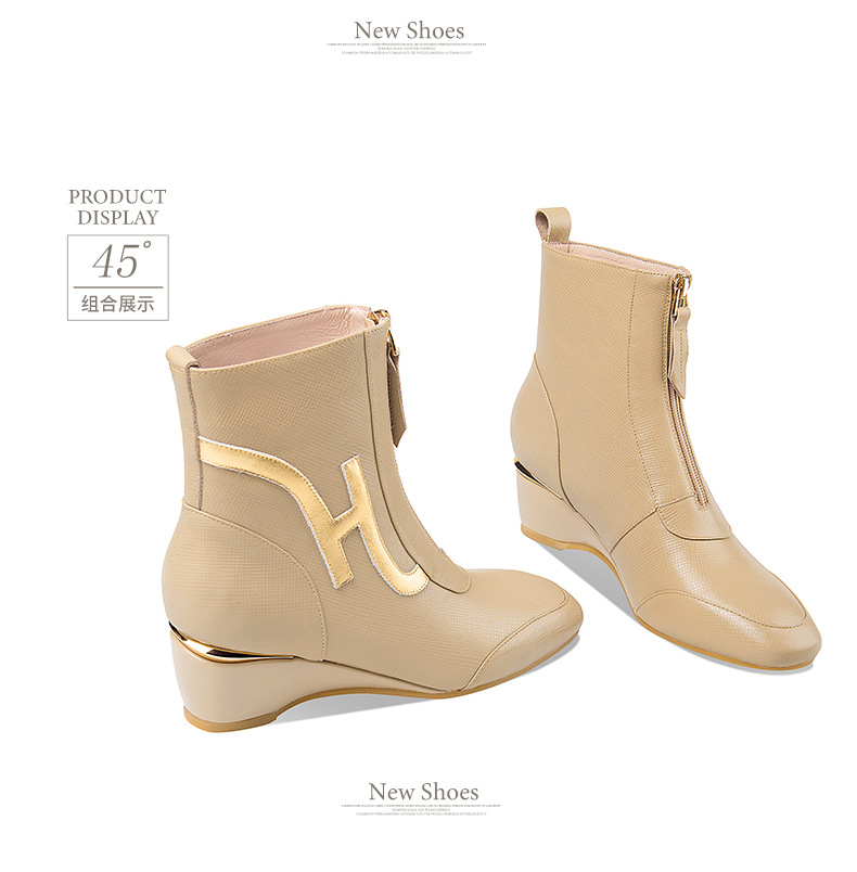 圆头平底靴子,前拉链拼色坡跟裸靴LD-7053