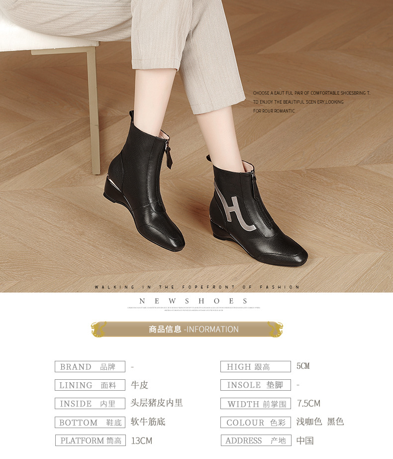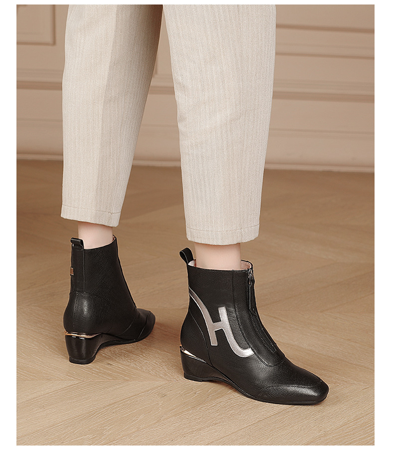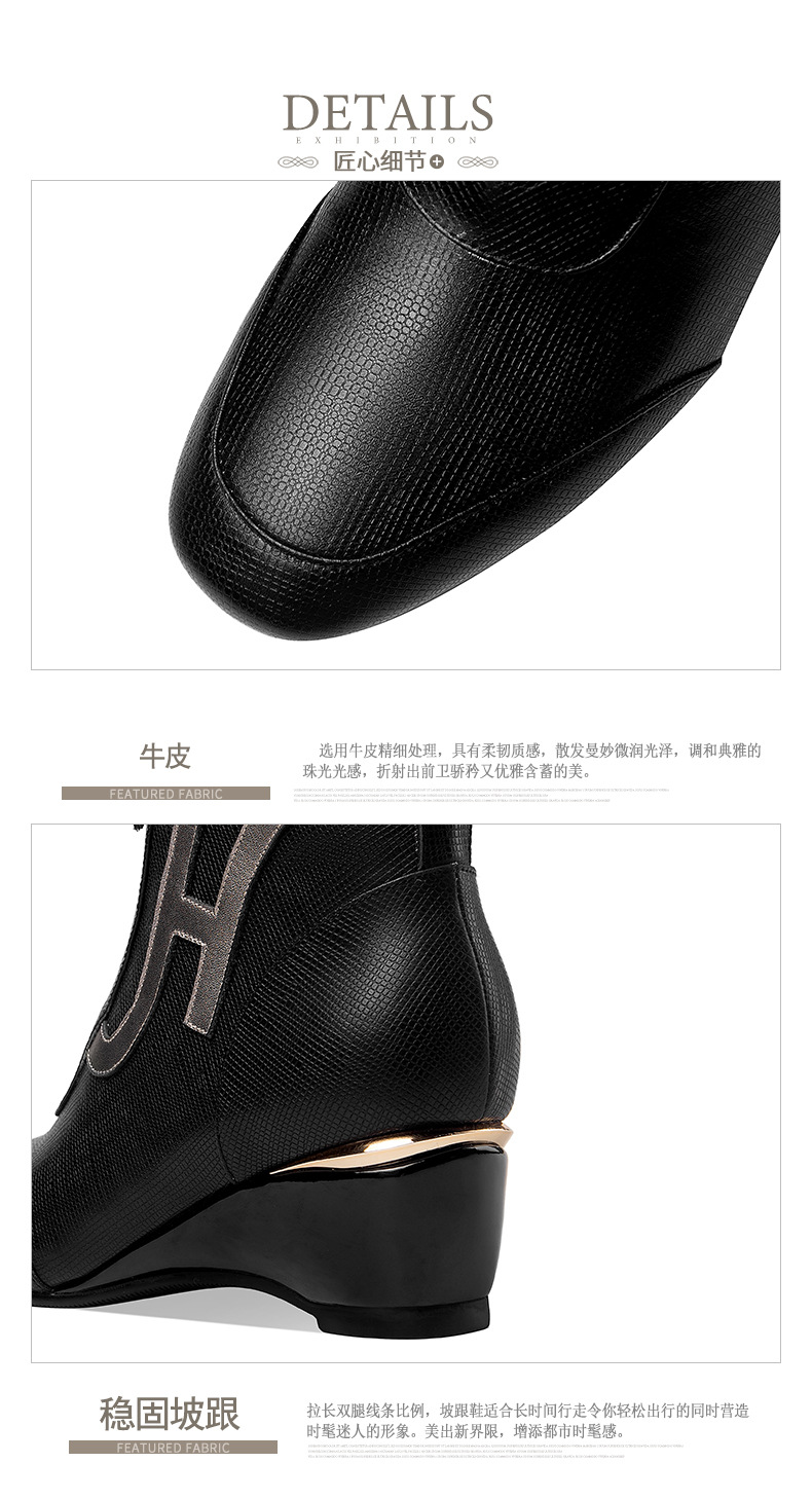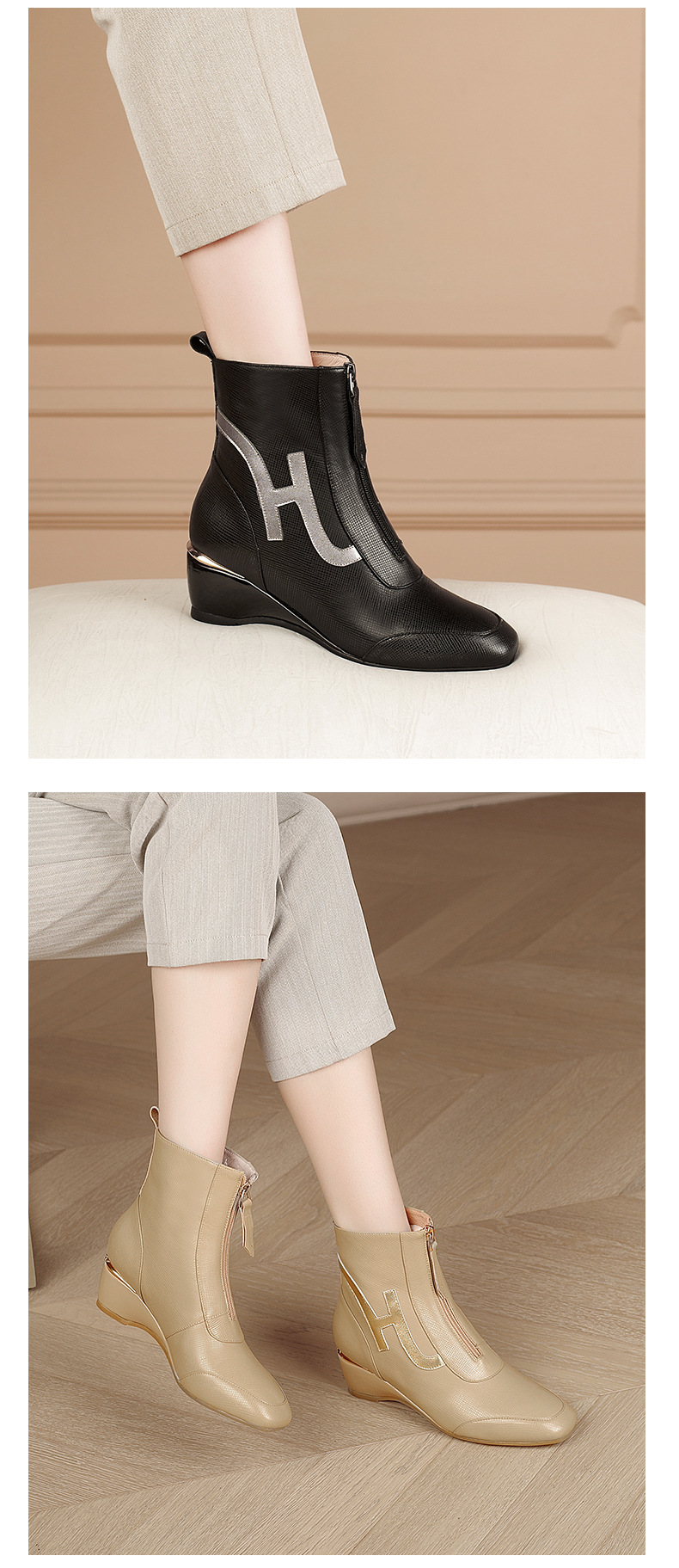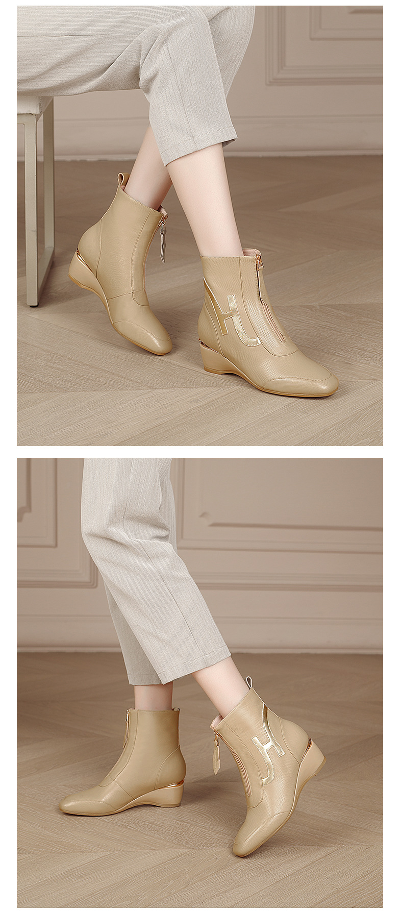 圆头平底靴子,前拉链拼色坡跟裸靴LD-7053