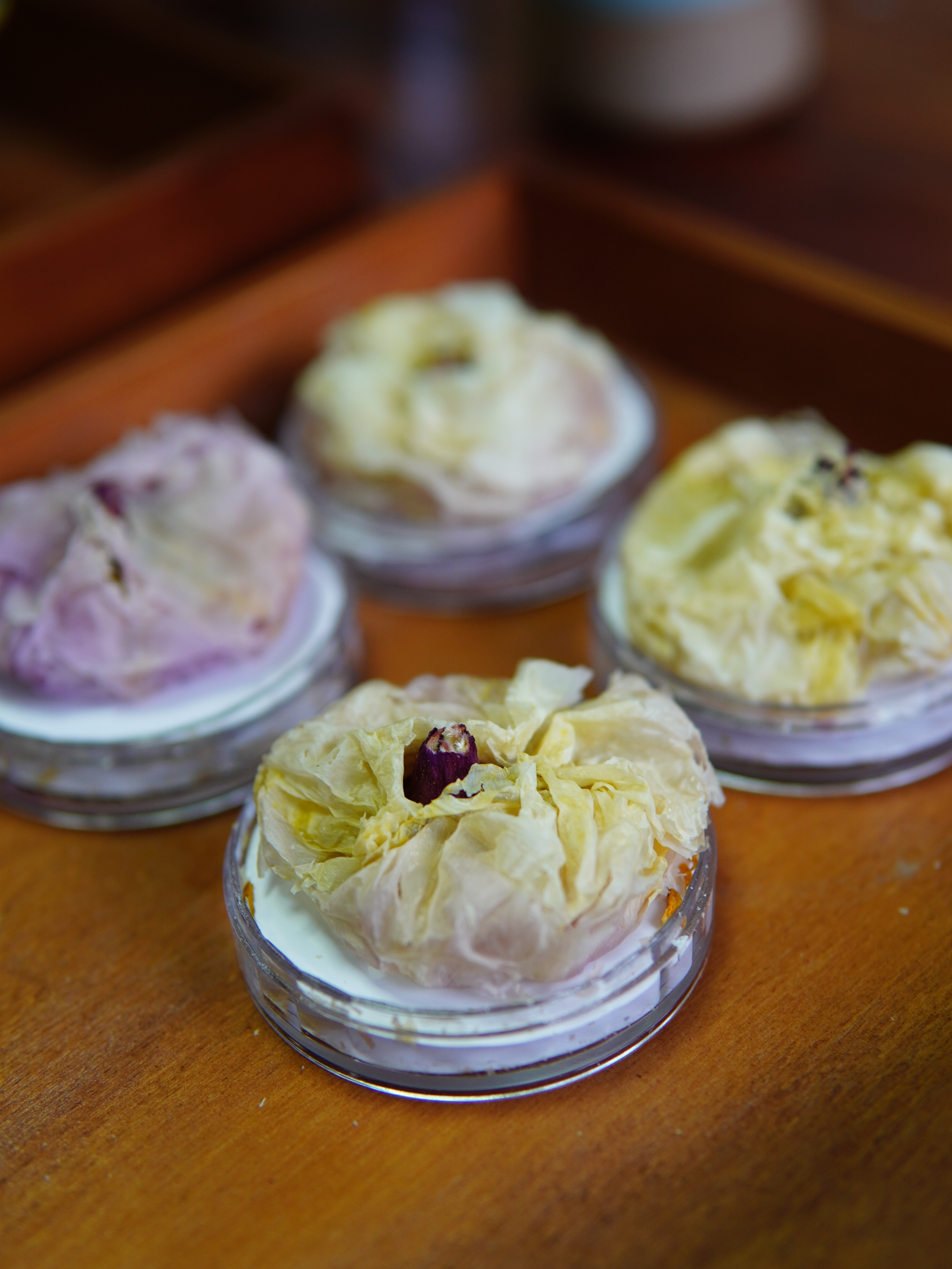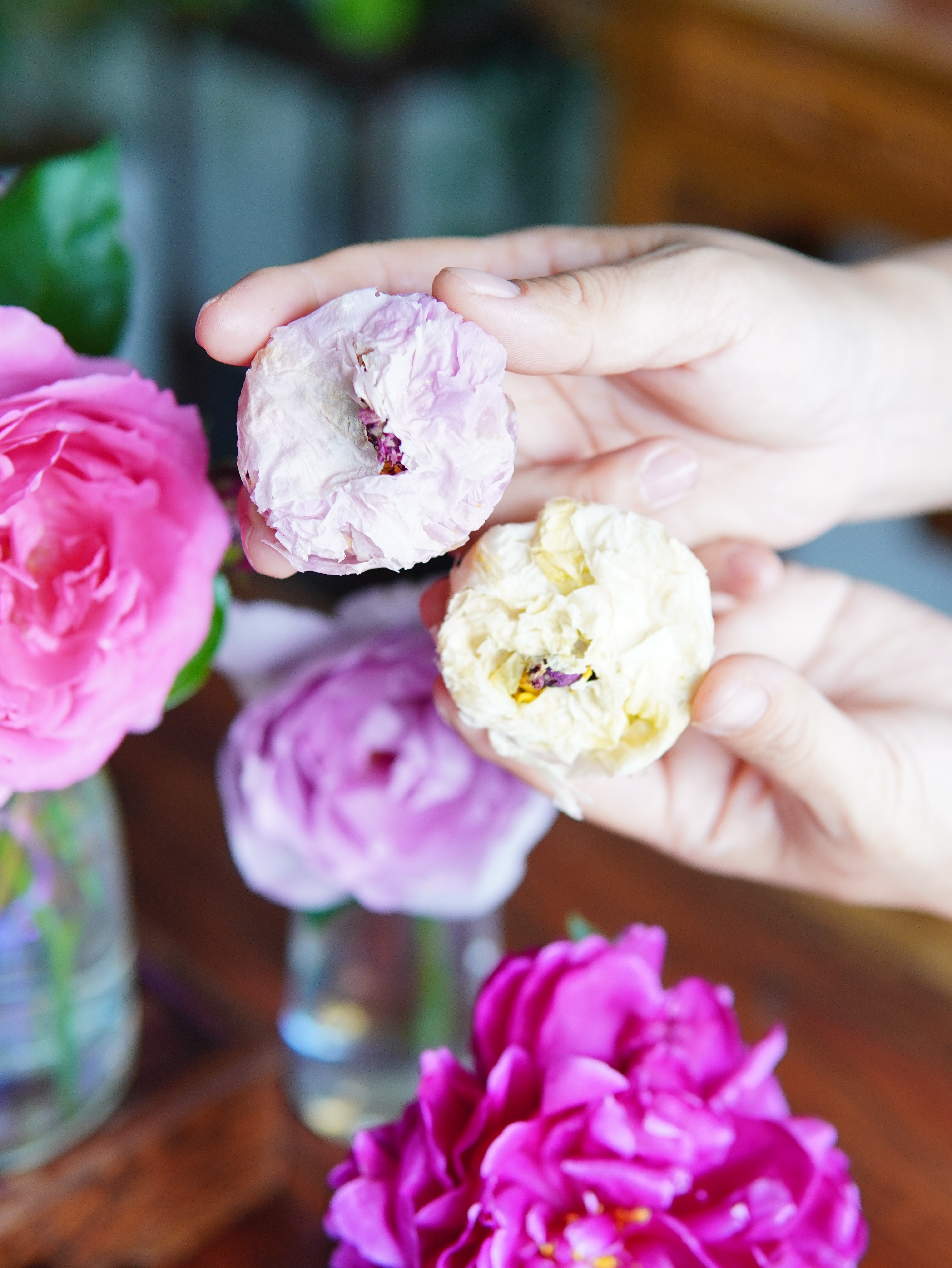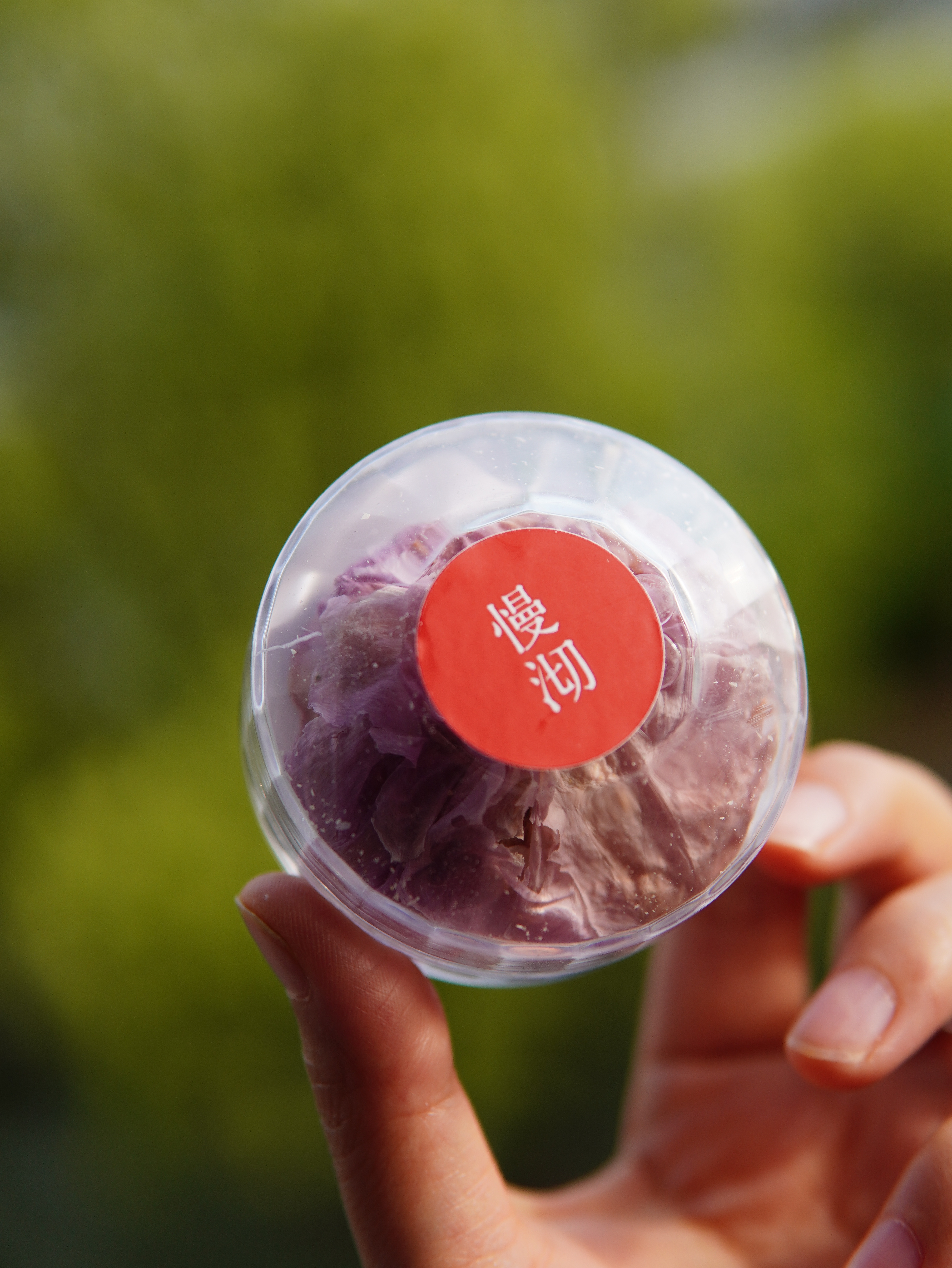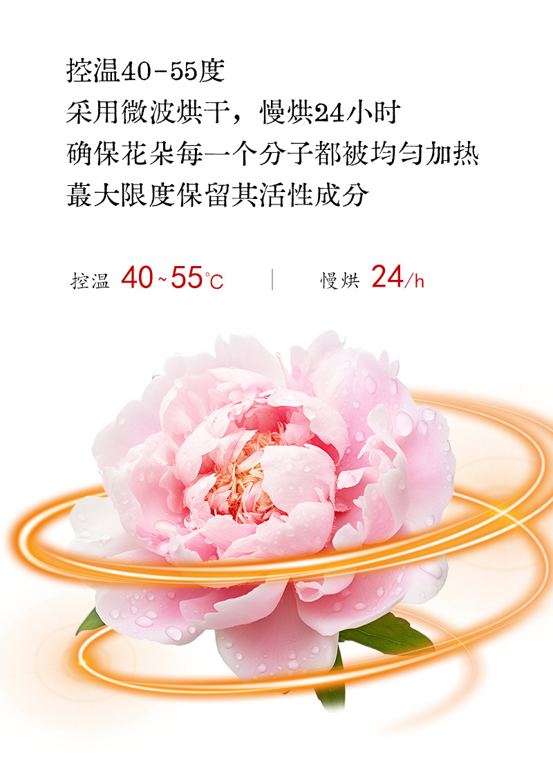 鲜花需在半小时内运回工厂,进行二次挑拣,快速人工模具内塑形,控温40-55度,只采用微波烘干方式,慢烘24小时,确保花朵每一个分子都被均匀加热。最大限度保留其活性成分!