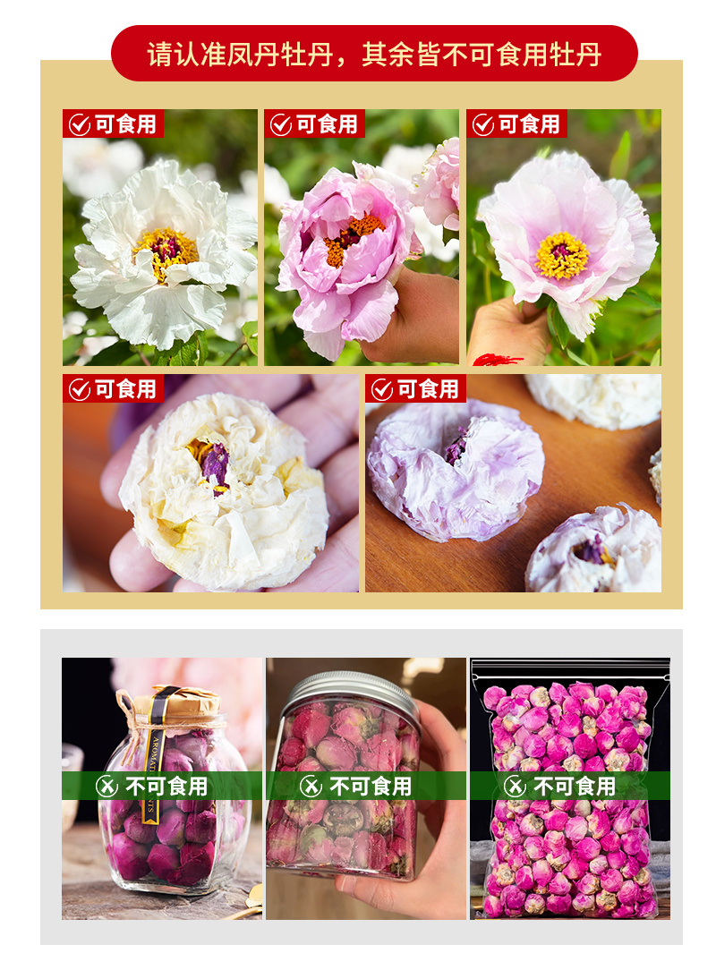 目前经国家食药监批准的,唯一可食用的牡丹就是:丹凤白牡丹,亲爱的朋友们,千万不要搞错哦。以下这些,均不可食用!!