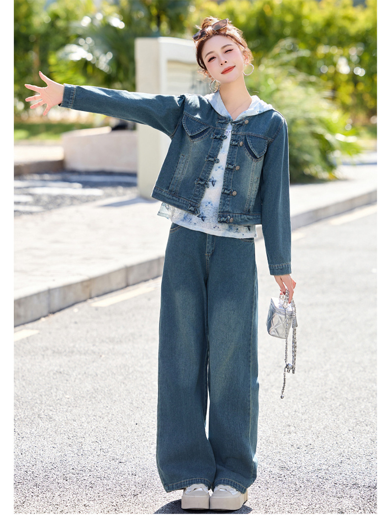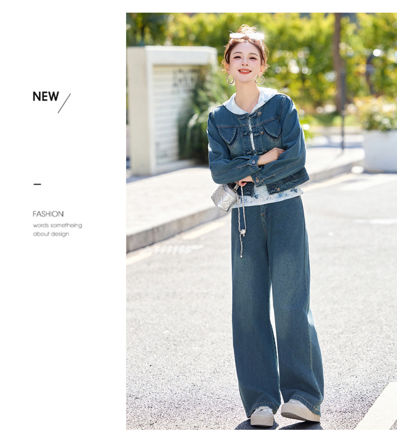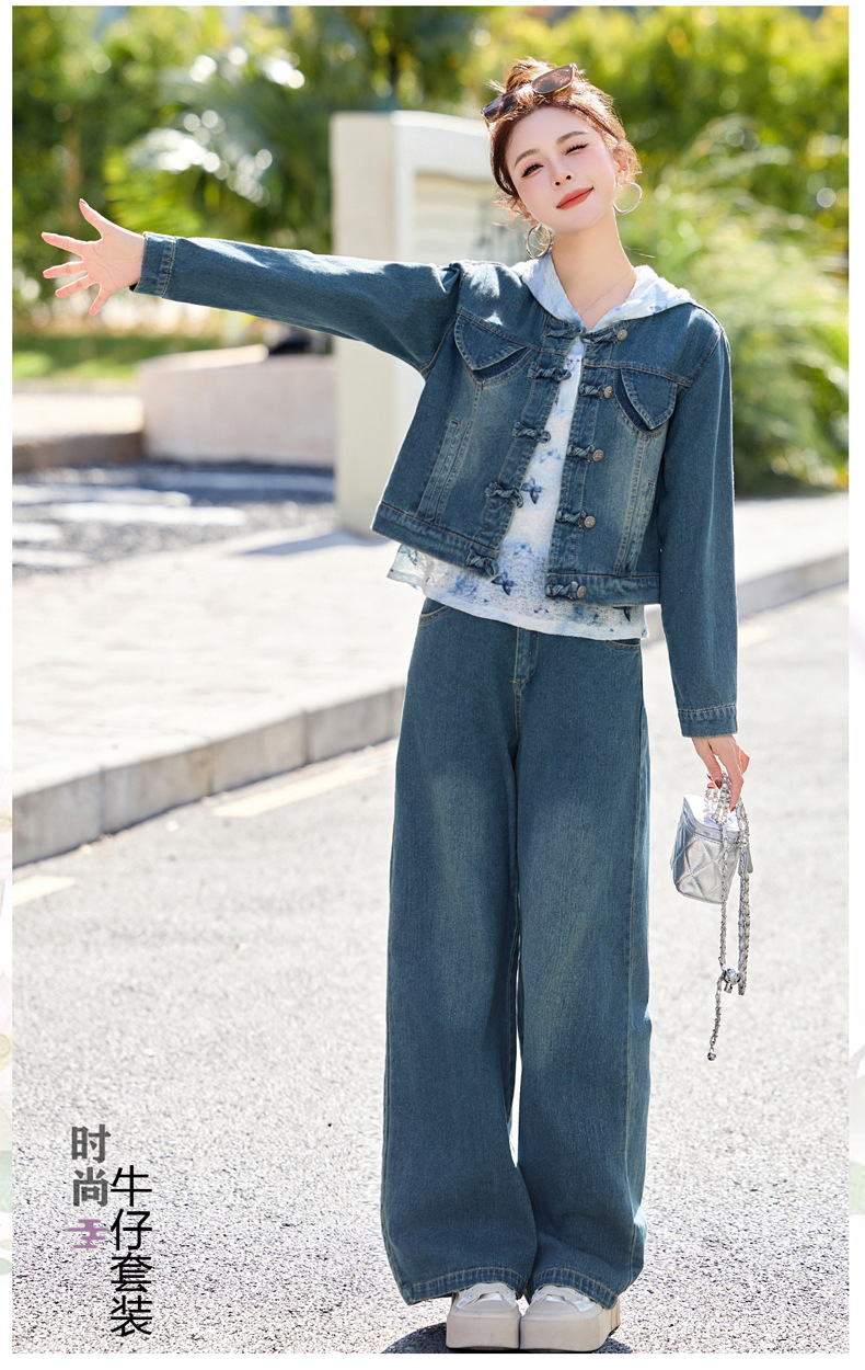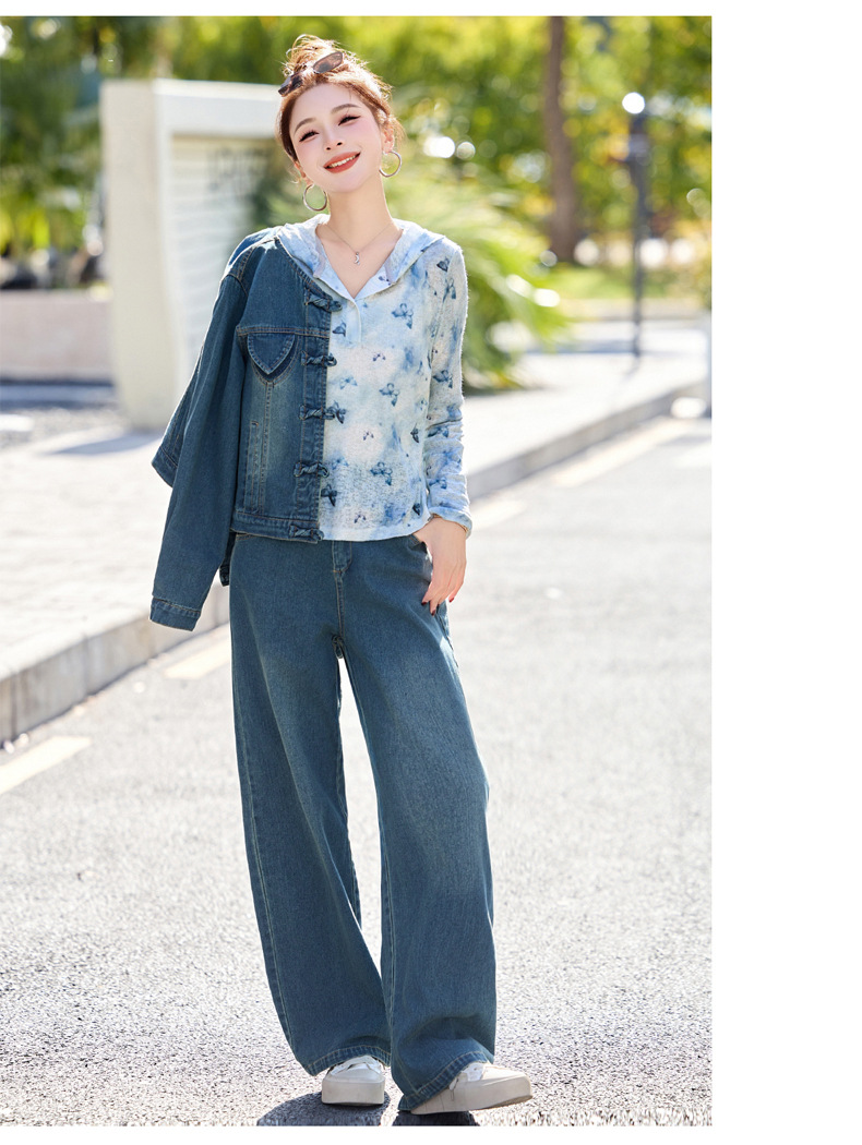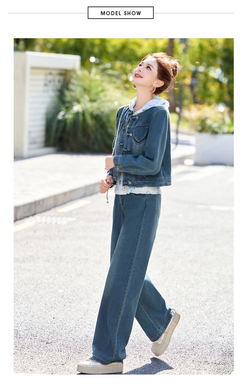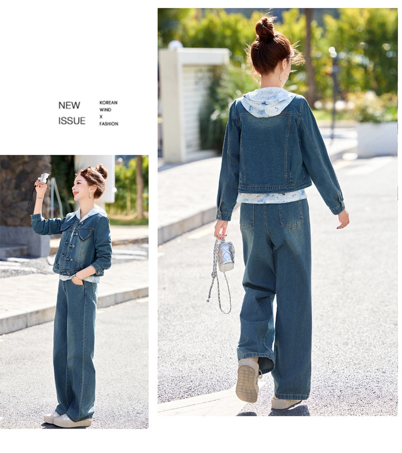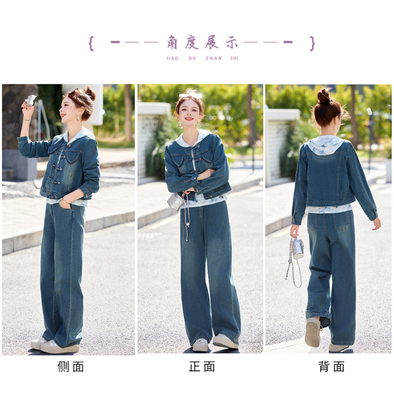 HR-XPH9189时尚复古休闲牛仔套装2025春新款女连帽衬衫牛仔外套直筒裤三件套