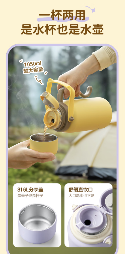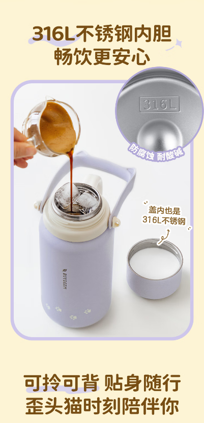 北鼎S401大容量泡茶保温杯1000ml歪头猫+背带套餐 商品图5