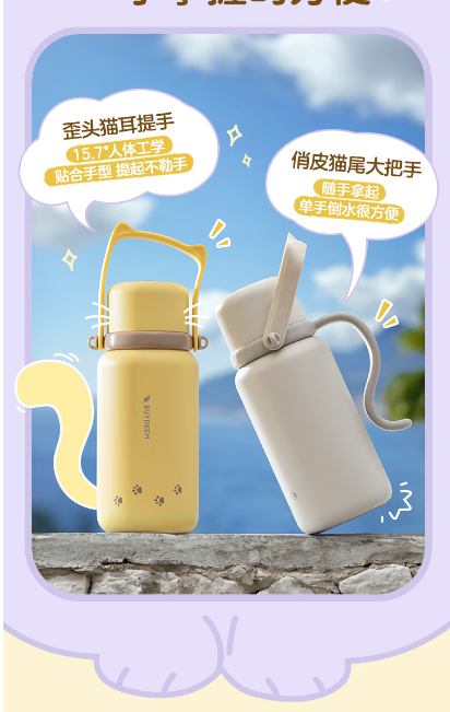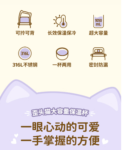 北鼎S401大容量泡茶保温杯1000ml歪头猫+背带套餐 商品图2